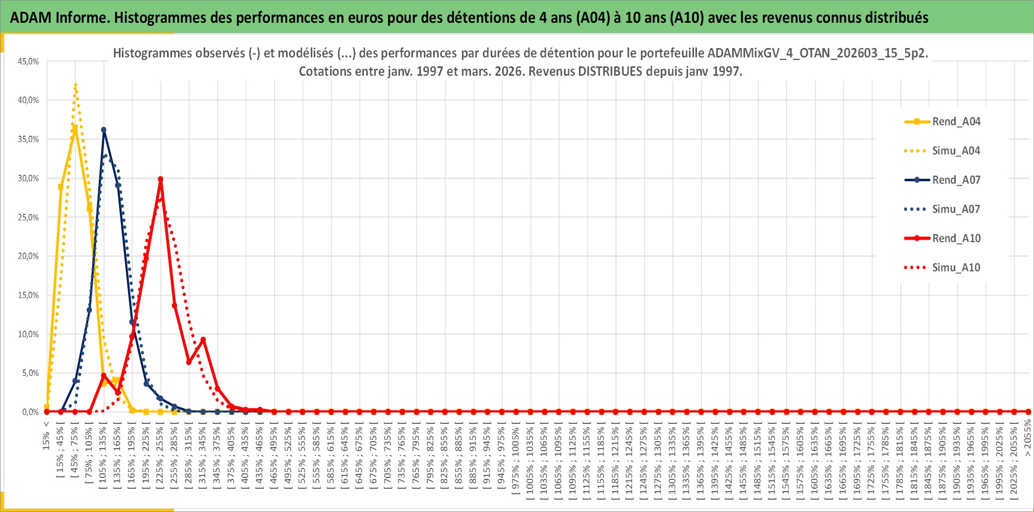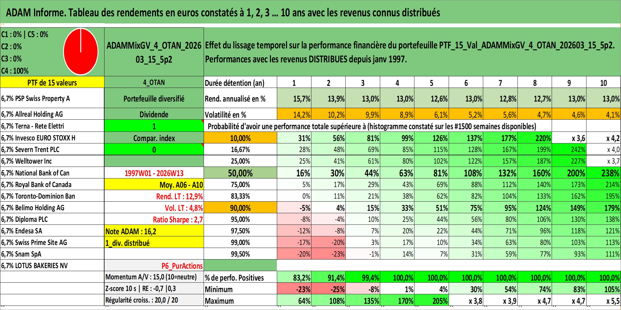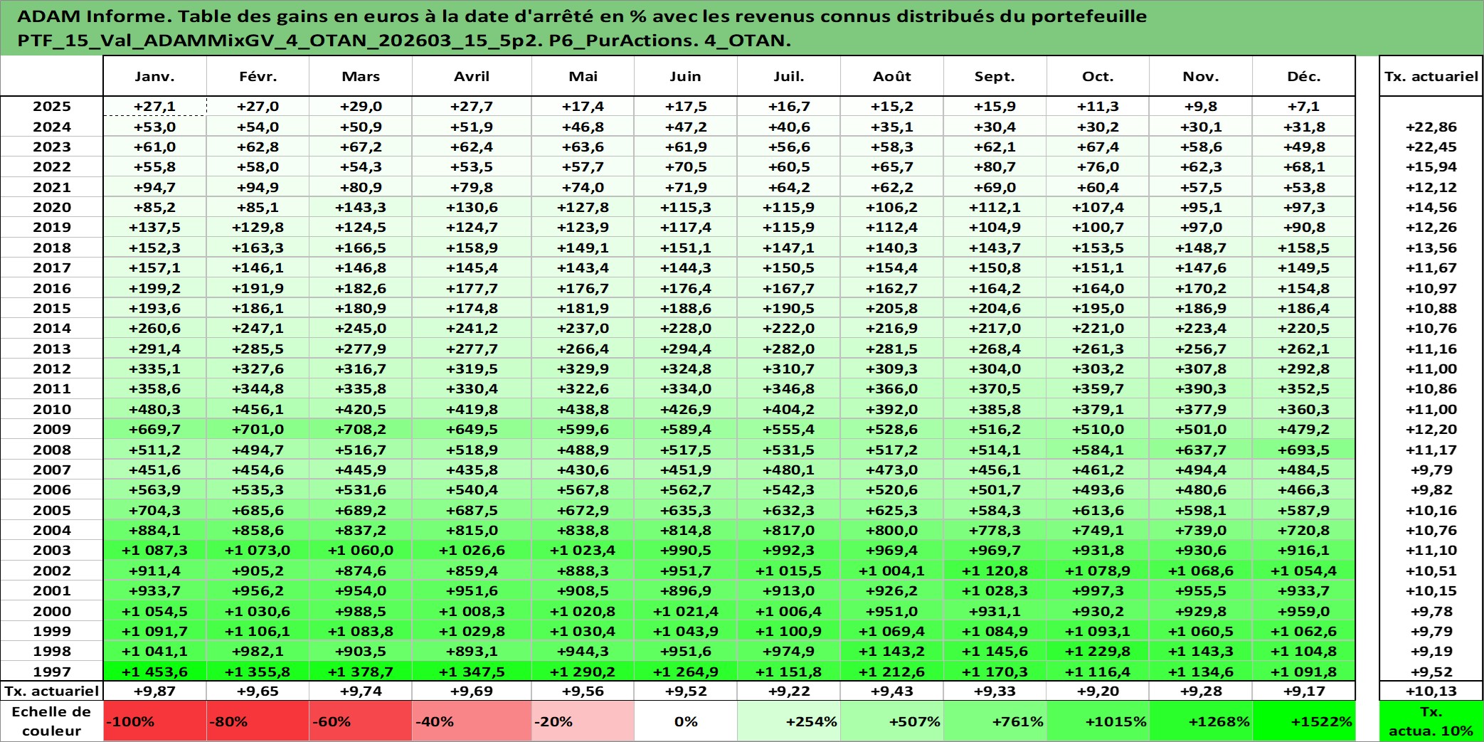 Site dédié aux investisseursPage dédiée sur site financeAnalyse des valorisations hebdomadaires du portefeuille ADAMMixGV_4_OTAN_202603_15_5p2_15actifs avec un profil P6_PurActions. Ce portefeuille est cote en EUR. Les valorisations couvrent les semaines 1997W01 a 2026W13. Les revenus de cet actif financier sont pris en compte depuis la semaine 1997W01. La note globale ESG de cet actif est estimee a 13.3 (apres rebasage entre 0 et 20).