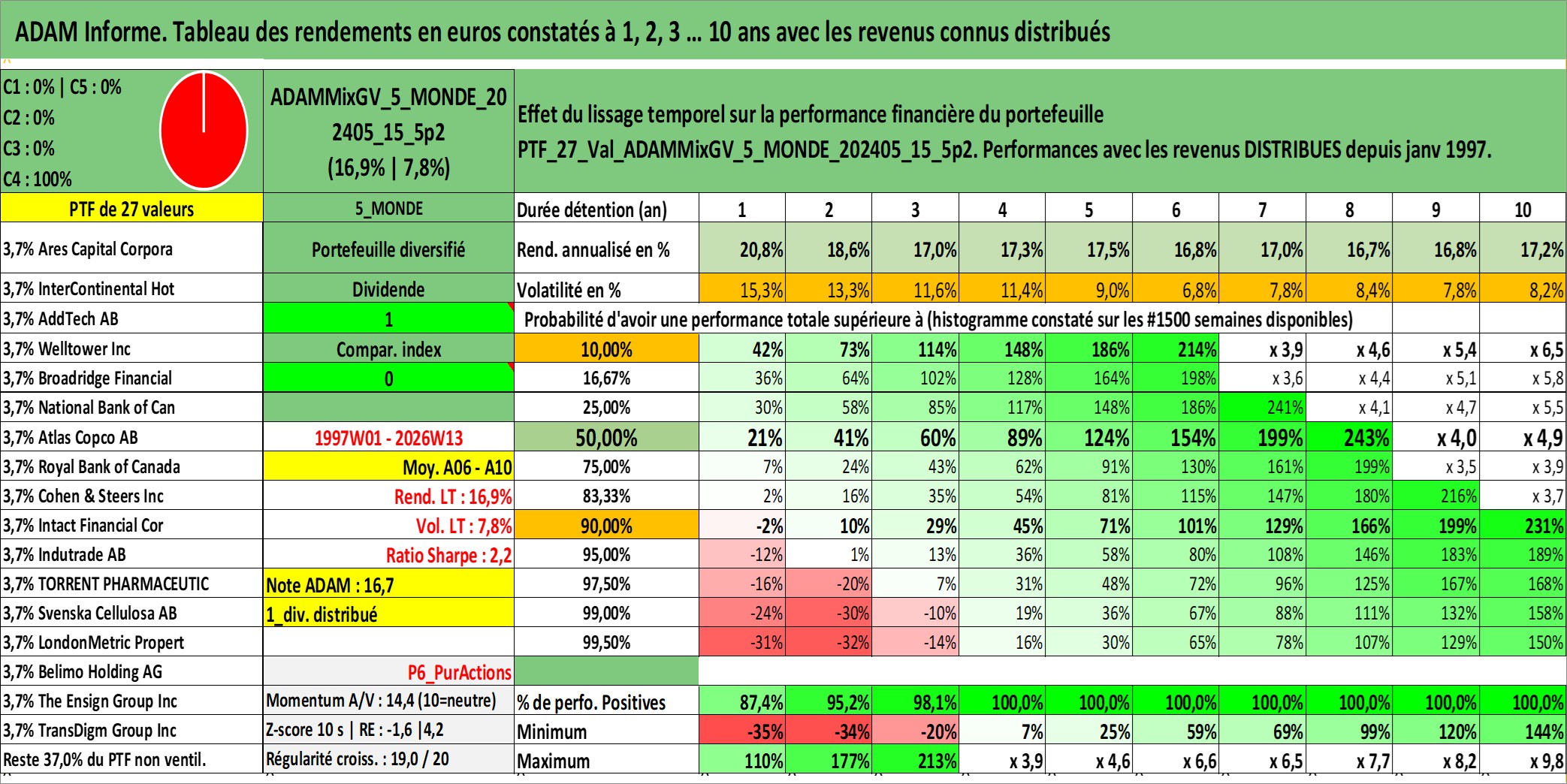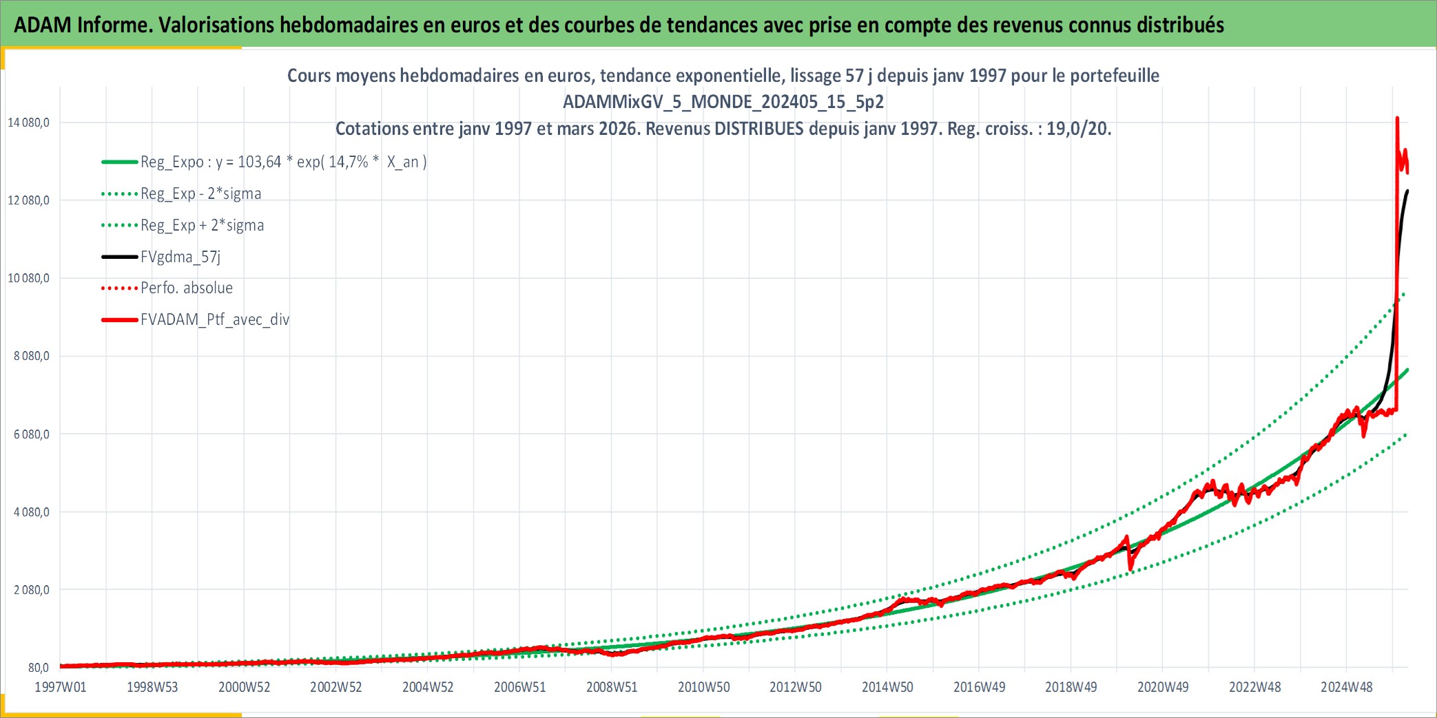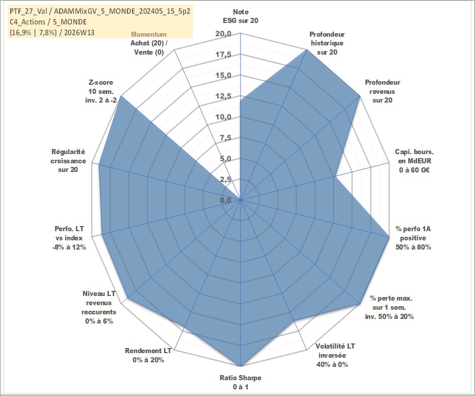 Site dédié aux investisseursPage dédiée sur site financeAnalyse des valorisations hebdomadaires du portefeuille ADAMMixGV_5_MONDE_202405_15_5p2_27actifs avec un profil P6_PurActions. Ce portefeuille est cote en EUR. Les valorisations couvrent les semaines 1997W01 a 2026W13. Les revenus de cet actif financier sont pris en compte depuis la semaine 1997W01. La note globale ESG de cet actif est estimee a 11.9 (apres rebasage entre 0 et 20).