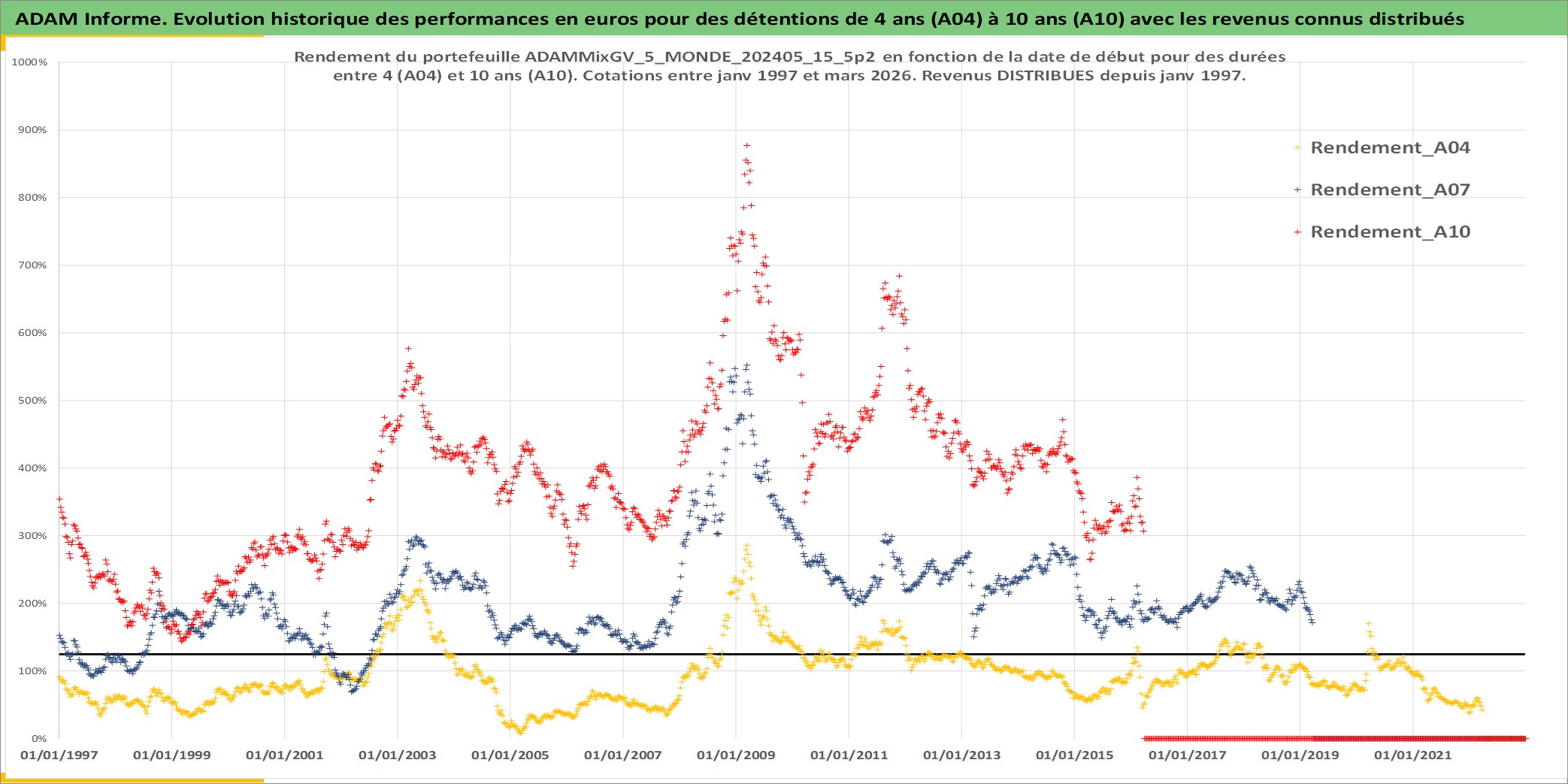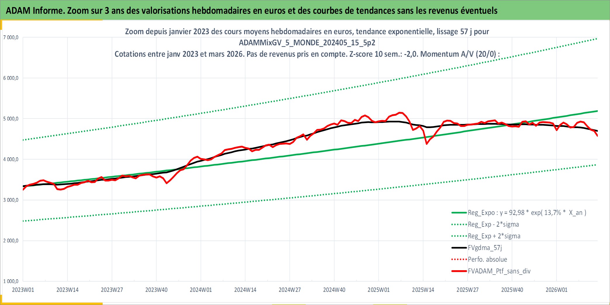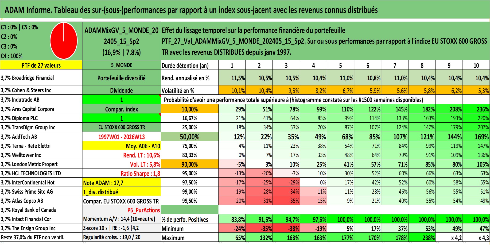 Site dédié aux investisseursPage dédiée sur site financeAnalyse des valorisations hebdomadaires du portefeuille ADAMMixGV_5_MONDE_202405_15_5p2_27actifs avec un profil P6_PurActions. Ce portefeuille est cote en EUR. Les valorisations couvrent les semaines 1997W01 a 2026W13. Les revenus de cet actif financier sont pris en compte depuis la semaine 1997W01. La note globale ESG de cet actif est estimee a 11.9 (apres rebasage entre 0 et 20).