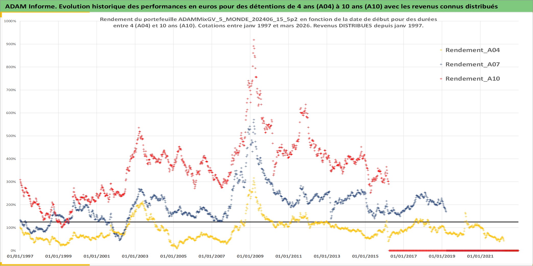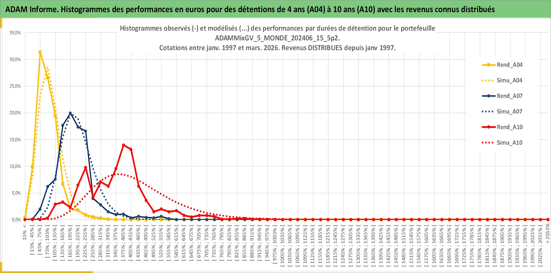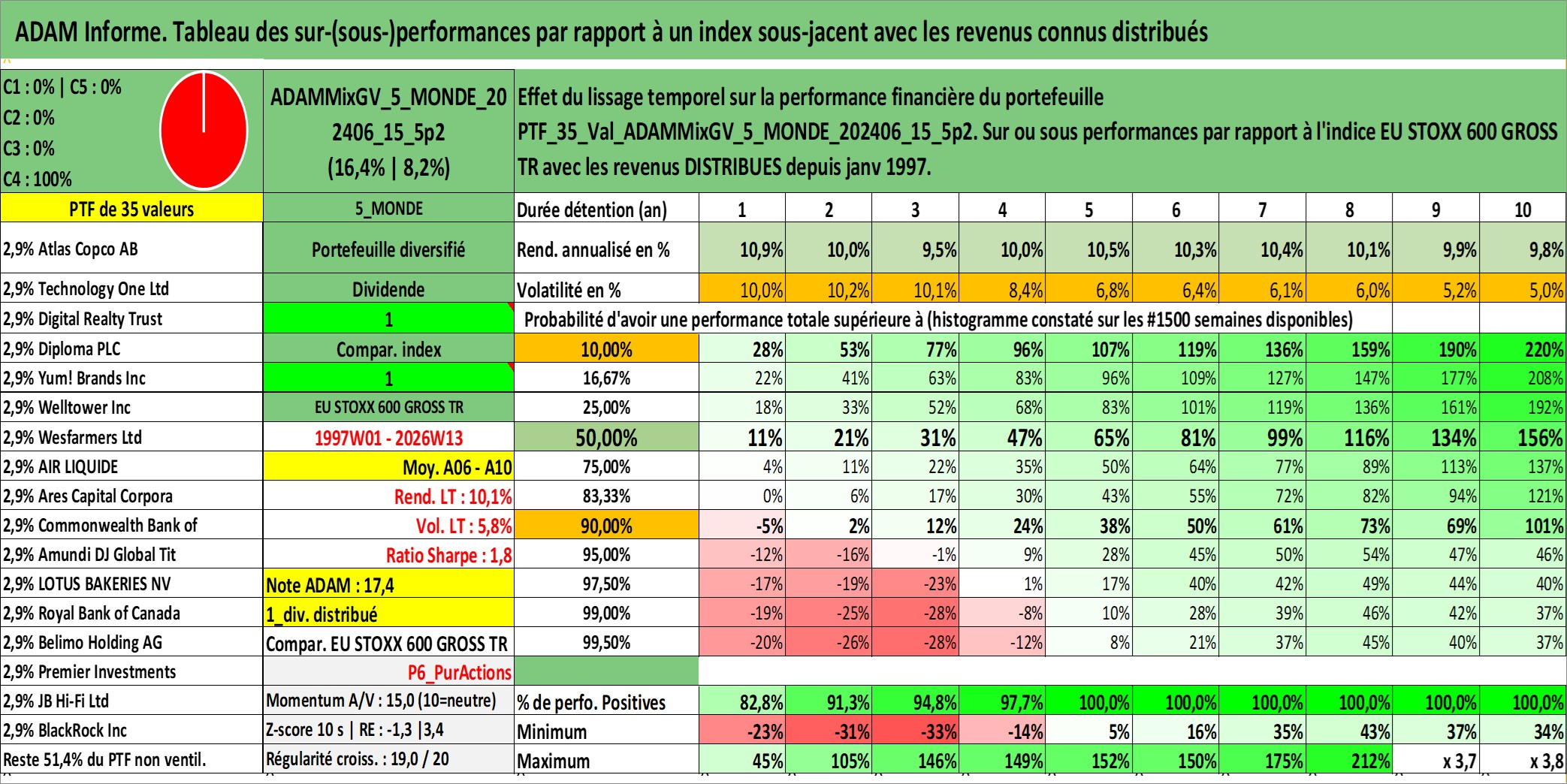 Site dédié aux investisseursPage dédiée sur site financeAnalyse des valorisations hebdomadaires du portefeuille ADAMMixGV_5_MONDE_202406_15_5p2_35actifs avec un profil P6_PurActions. Ce portefeuille est cote en EUR. Les valorisations couvrent les semaines 1997W01 a 2026W13. Les revenus de cet actif financier sont pris en compte depuis la semaine 1997W01. La note globale ESG de cet actif est estimee a 11.6 (apres rebasage entre 0 et 20).