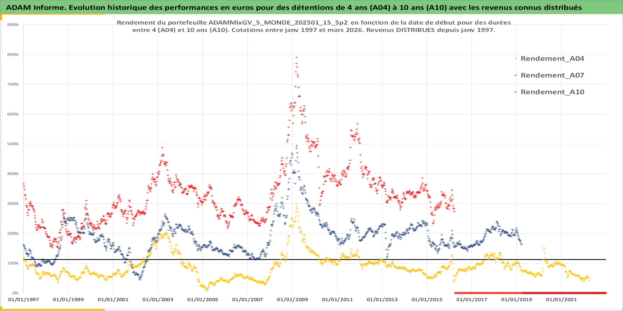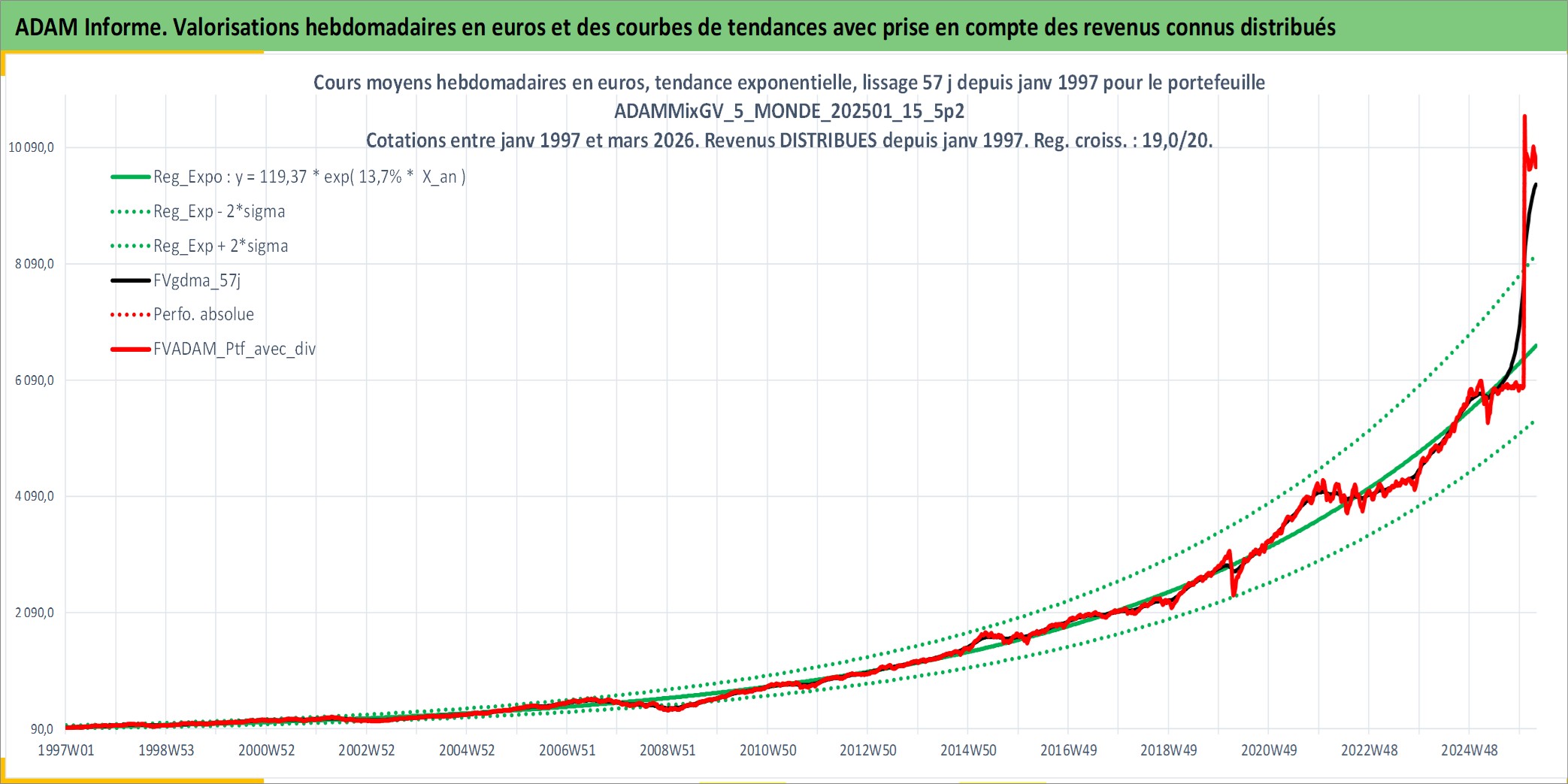 Site dédié aux investisseursPage dédiée sur site financeAnalyse des valorisations hebdomadaires du portefeuille ADAMMixGV_5_MONDE_202501_15_5p2_39actifs avec un profil P6_PurActions. Ce portefeuille est cote en EUR. Les valorisations couvrent les semaines 1997W01 a 2026W13. Les revenus de cet actif financier sont pris en compte depuis la semaine 1997W01. La note globale ESG de cet actif est estimee a 11.6 (apres rebasage entre 0 et 20).