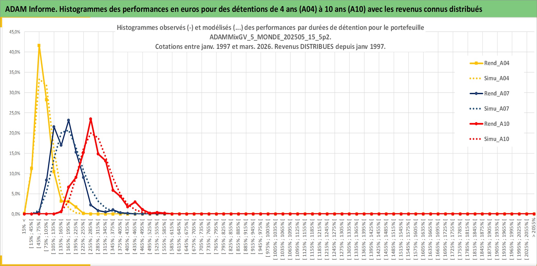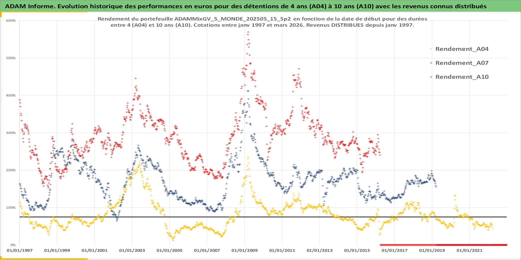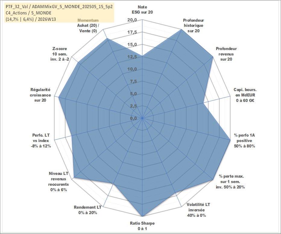 Site dédié aux investisseursPage dédiée sur site financeAnalyse des valorisations hebdomadaires du portefeuille ADAMMixGV_5_MONDE_202505_15_5p2_32actifs avec un profil P6_PurActions. Ce portefeuille est cote en EUR. Les valorisations couvrent les semaines 1997W01 a 2026W13. Les revenus de cet actif financier sont pris en compte depuis la semaine 1997W01. La note globale ESG de cet actif est estimee a 12.6 (apres rebasage entre 0 et 20).