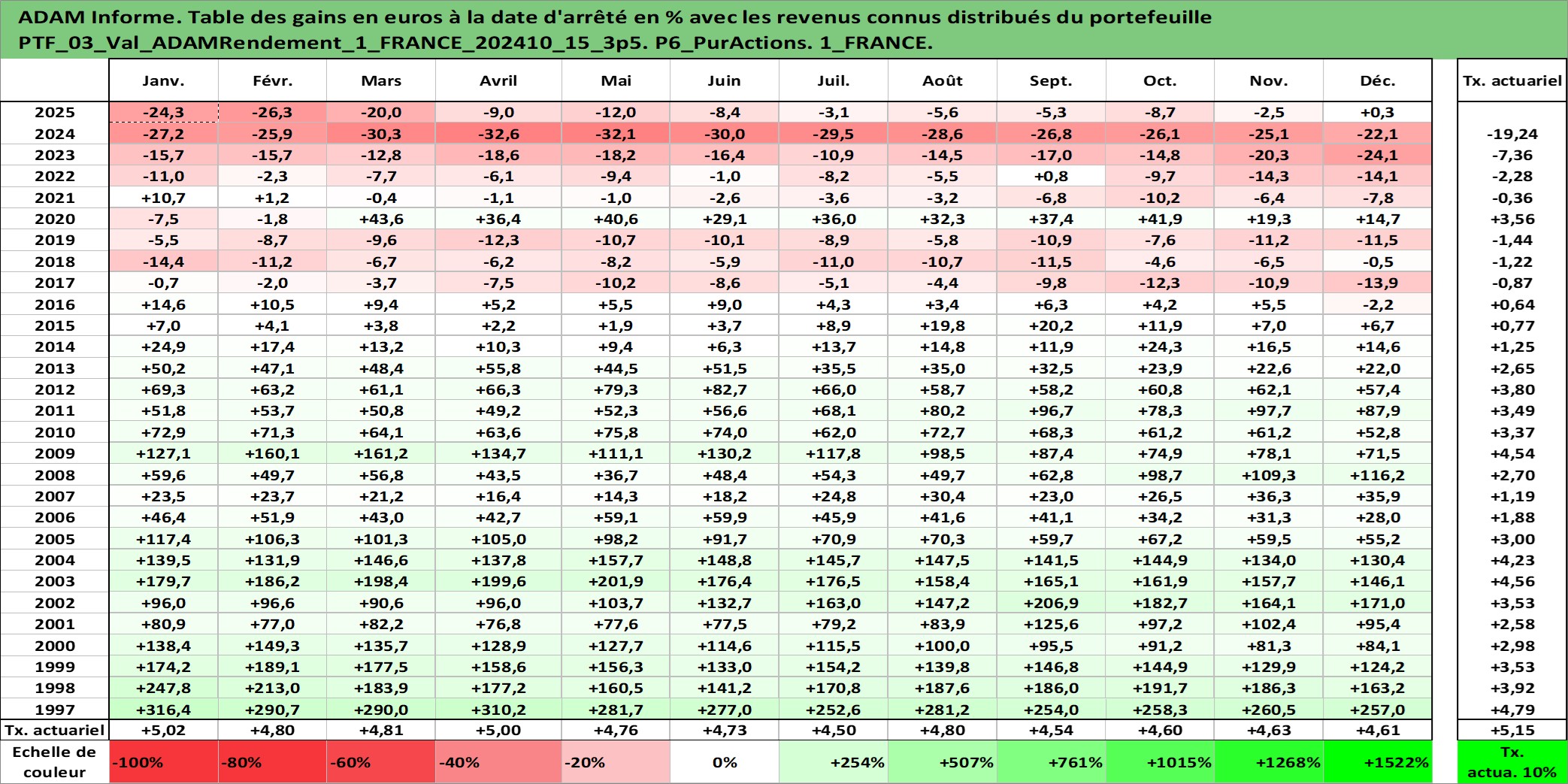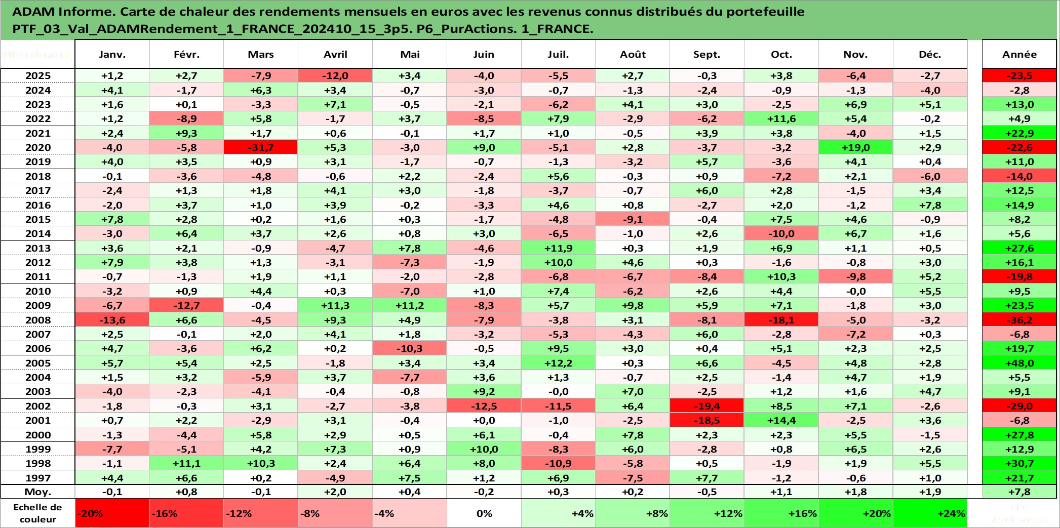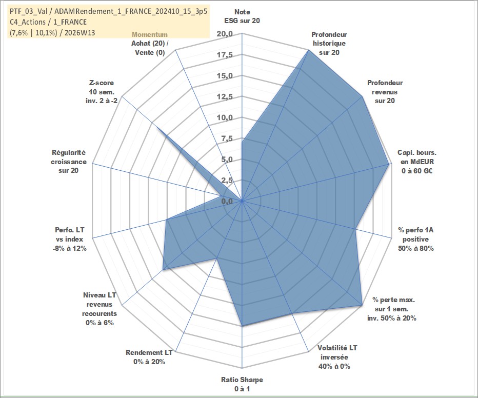 Site dédié aux investisseursPage dédiée sur site financeAnalyse des valorisations hebdomadaires du portefeuille ADAMRendement_1_FRANCE_202410_15_3p5_3actifs avec un profil P6_PurActions. Ce portefeuille est cote en EUR. Les valorisations couvrent les semaines 1997W01 a 2026W13. Les revenus de cet actif financier sont pris en compte depuis la semaine 1997W01. La note globale ESG de cet actif est estimee a 7.0 (apres rebasage entre 0 et 20).
