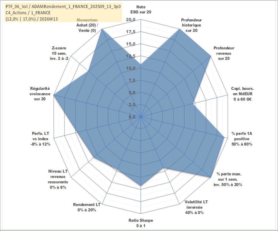 Site dédié aux investisseursPage dédiée sur site financeAnalyse des valorisations hebdomadaires du portefeuille ADAMRendement_1_FRANCE_202509_13_3p0_6actifs avec un profil P6_PurActions. Ce portefeuille est cote en EUR. Les valorisations couvrent les semaines 1997W01 a 2026W13. Les revenus de cet actif financier sont pris en compte depuis la semaine 1997W01. La note globale ESG de cet actif est estimee a 10.7 (apres rebasage entre 0 et 20).