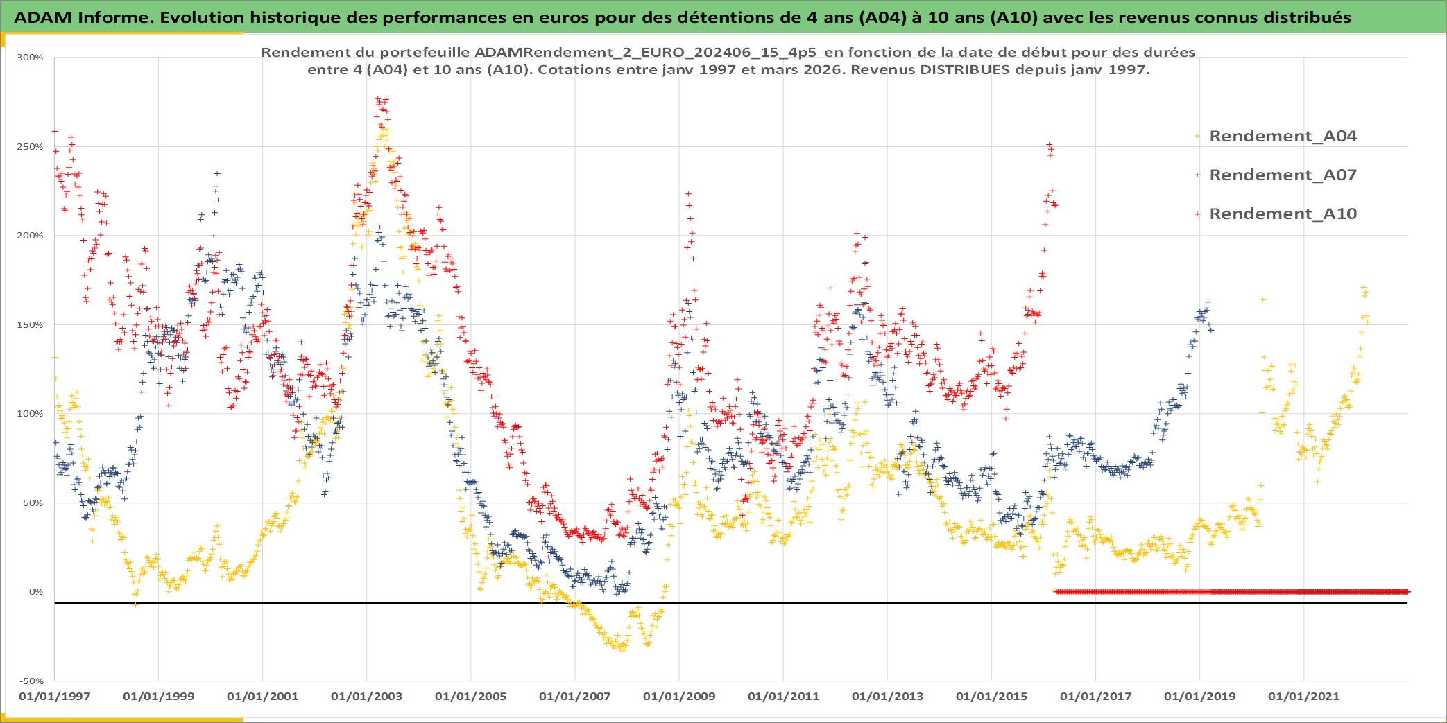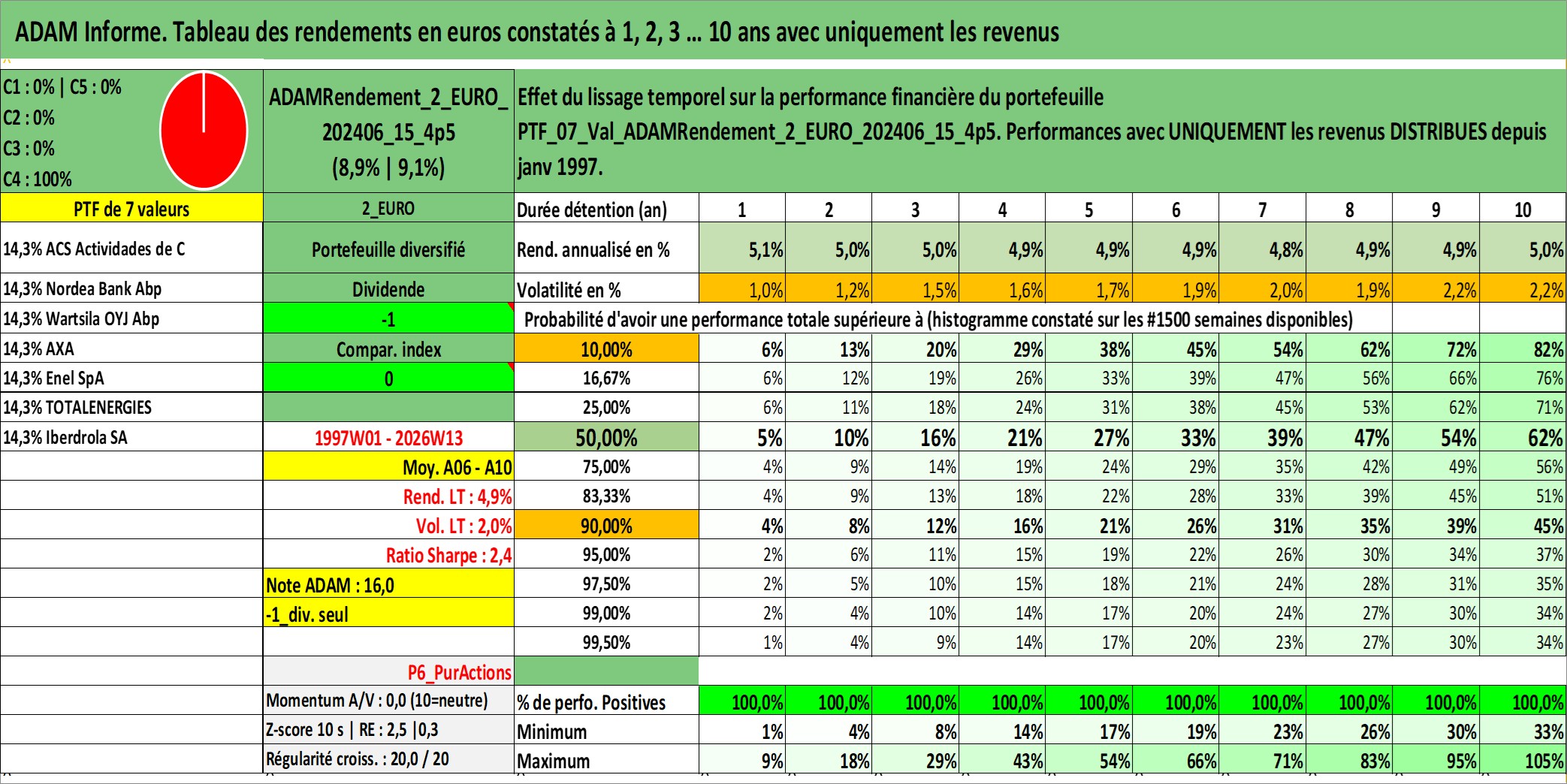 Site dédié aux investisseursPage dédiée sur site financeAnalyse des valorisations hebdomadaires du portefeuille ADAMRendement_2_EURO_202406_15_4p5_7actifs avec un profil P6_PurActions. Ce portefeuille est cote en EUR. Les valorisations couvrent les semaines 1997W01 a 2026W13. Les revenus de cet actif financier sont pris en compte depuis la semaine 1997W01. La note globale ESG de cet actif est estimee a 8.5 (apres rebasage entre 0 et 20).