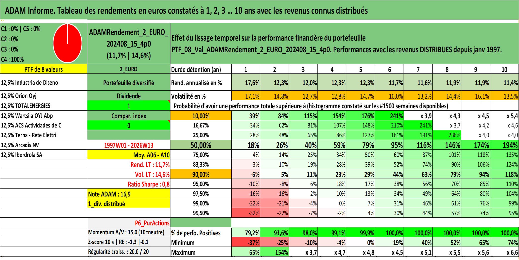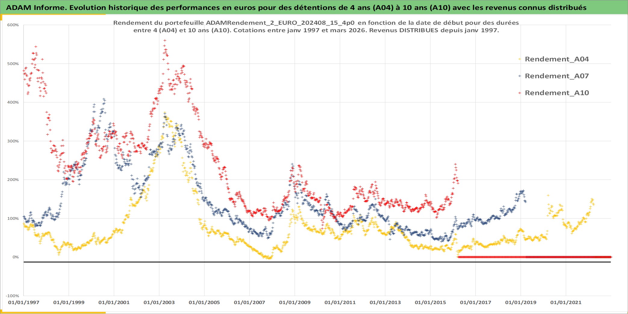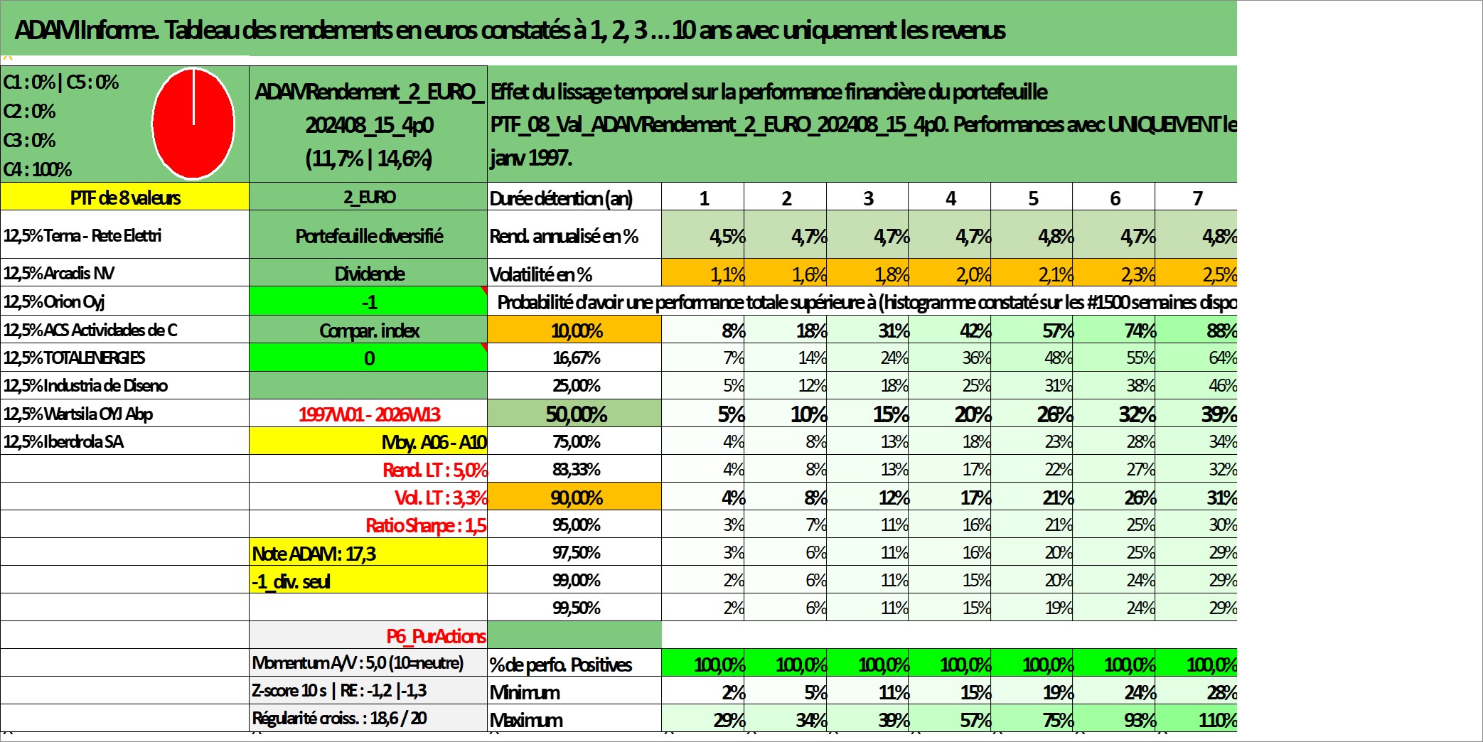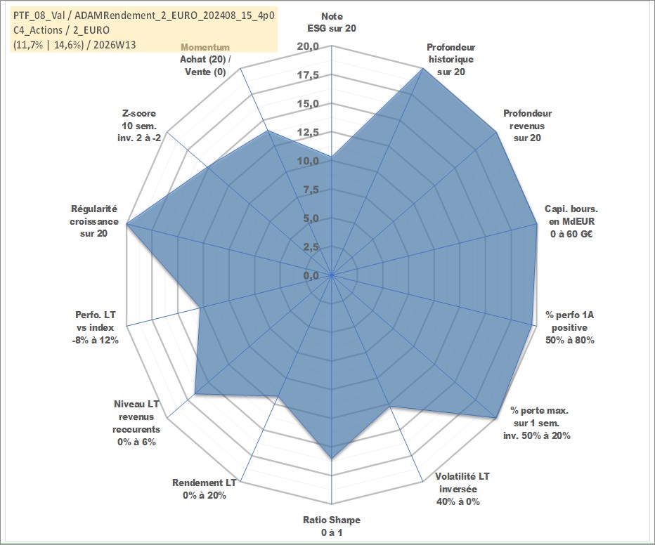 Site dédié aux investisseursPage dédiée sur site financeAnalyse des valorisations hebdomadaires du portefeuille ADAMRendement_2_EURO_202408_15_4p0_8actifs avec un profil P6_PurActions. Ce portefeuille est cote en EUR. Les valorisations couvrent les semaines 1997W01 a 2026W13. Les revenus de cet actif financier sont pris en compte depuis la semaine 1997W01. La note globale ESG de cet actif est estimee a 10.3 (apres rebasage entre 0 et 20).