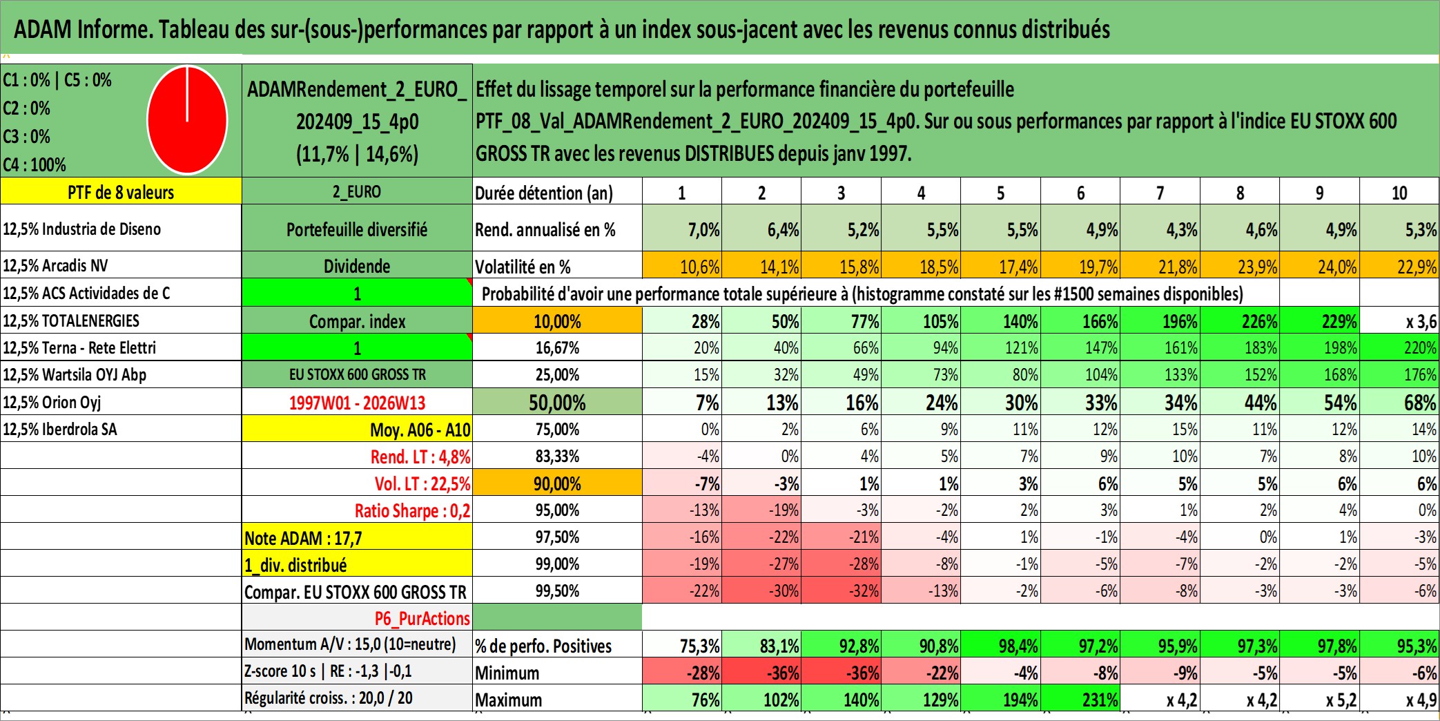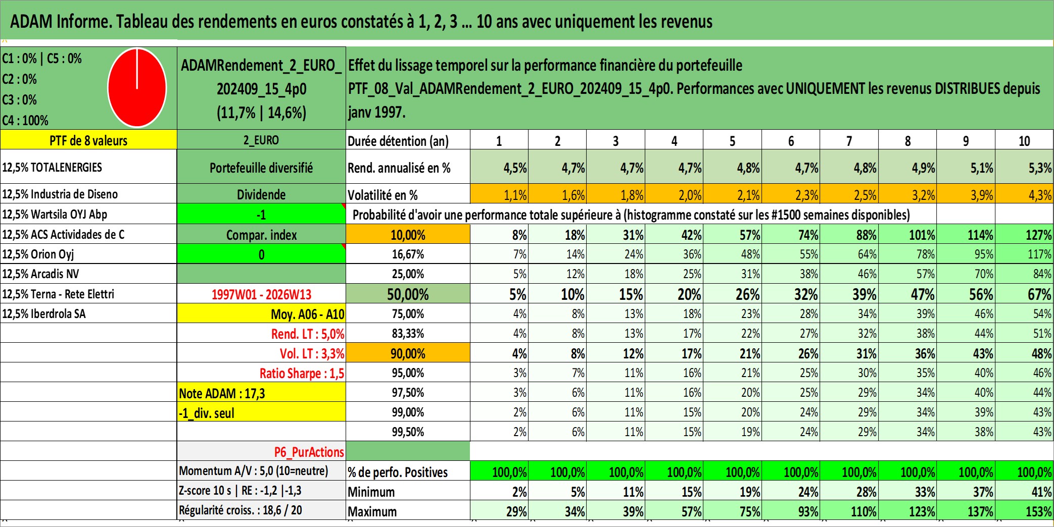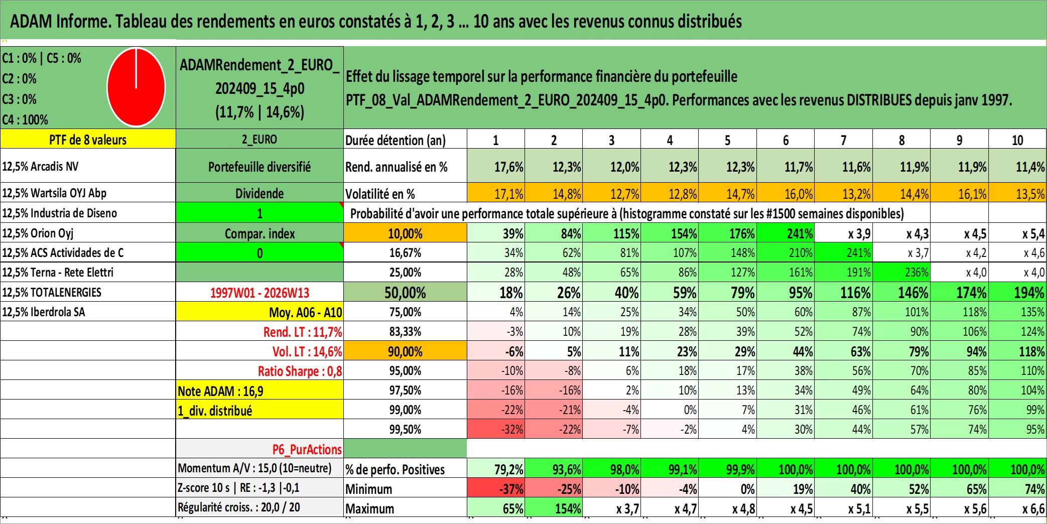 Site dédié aux investisseursPage dédiée sur site financeAnalyse des valorisations hebdomadaires du portefeuille ADAMRendement_2_EURO_202409_15_4p0_8actifs avec un profil P6_PurActions. Ce portefeuille est cote en EUR. Les valorisations couvrent les semaines 1997W01 a 2026W13. Les revenus de cet actif financier sont pris en compte depuis la semaine 1997W01. La note globale ESG de cet actif est estimee a 10.3 (apres rebasage entre 0 et 20).