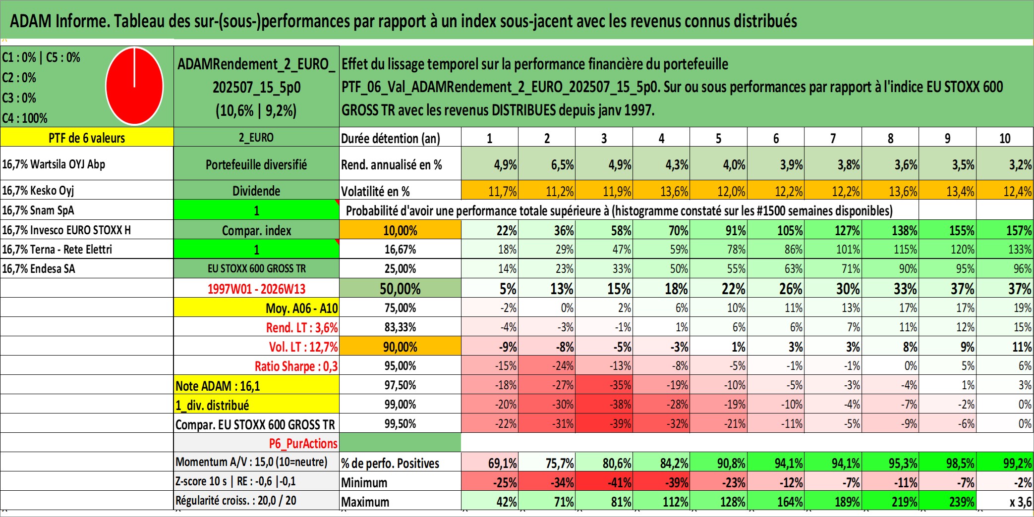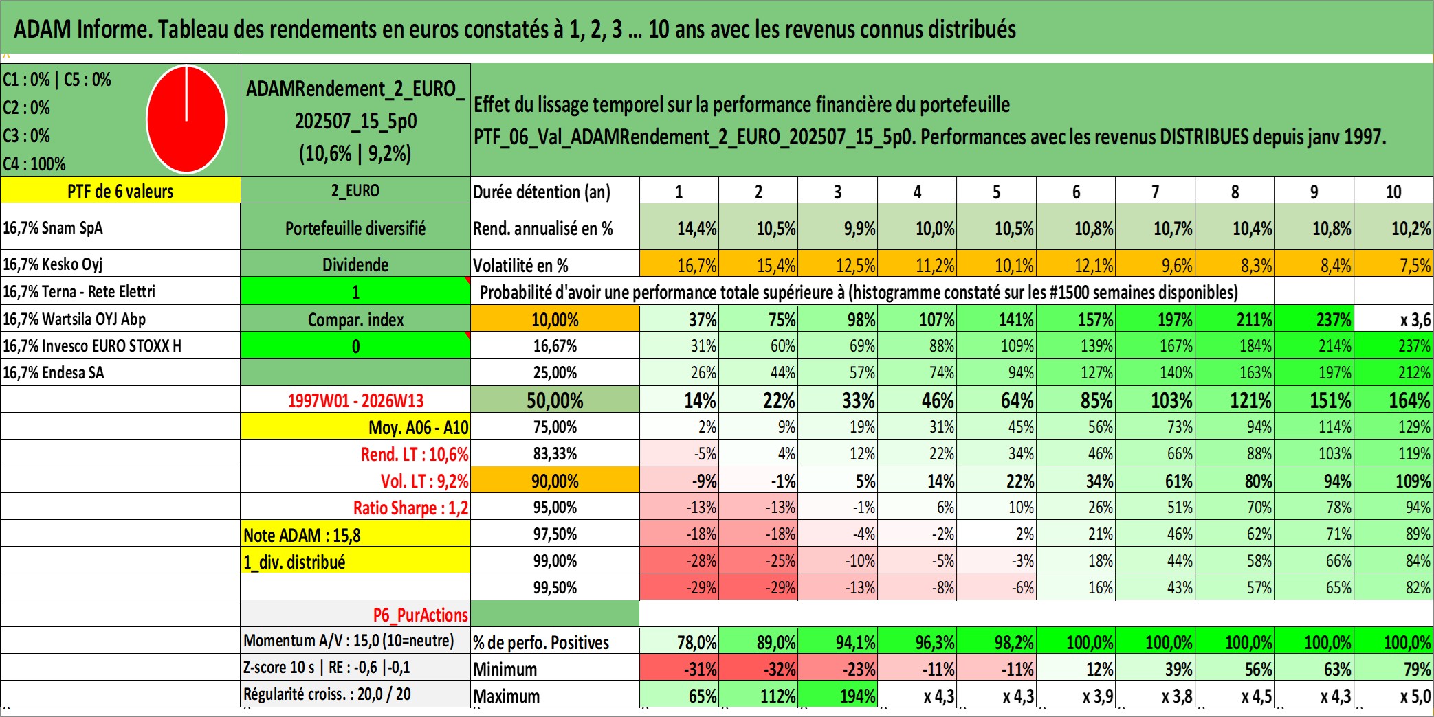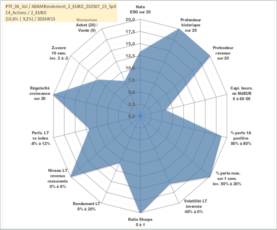 Site dédié aux investisseursPage dédiée sur site financeAnalyse des valorisations hebdomadaires du portefeuille ADAMRendement_2_EURO_202507_15_5p0_6actifs avec un profil P6_PurActions. Ce portefeuille est cote en EUR. Les valorisations couvrent les semaines 1997W01 a 2026W13. Les revenus de cet actif financier sont pris en compte depuis la semaine 1997W01. La note globale ESG de cet actif est estimee a 13.3 (apres rebasage entre 0 et 20).