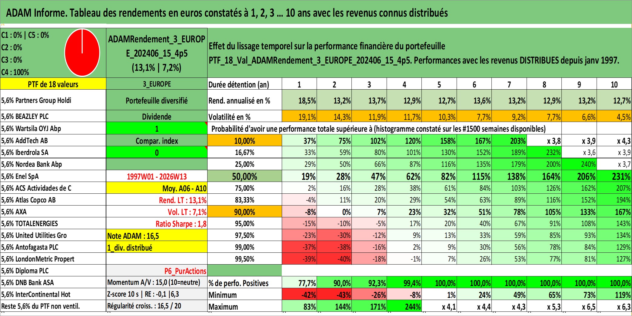 Site dédié aux investisseursPage dédiée sur site financeAnalyse des valorisations hebdomadaires du portefeuille ADAMRendement_3_EUROPE_202406_15_4p5_18actifs avec un profil P6_PurActions. Ce portefeuille est cote en EUR. Les valorisations couvrent les semaines 1997W01 a 2026W13. Les revenus de cet actif financier sont pris en compte depuis la semaine 1997W01. La note globale ESG de cet actif est estimee a 10.4 (apres rebasage entre 0 et 20).