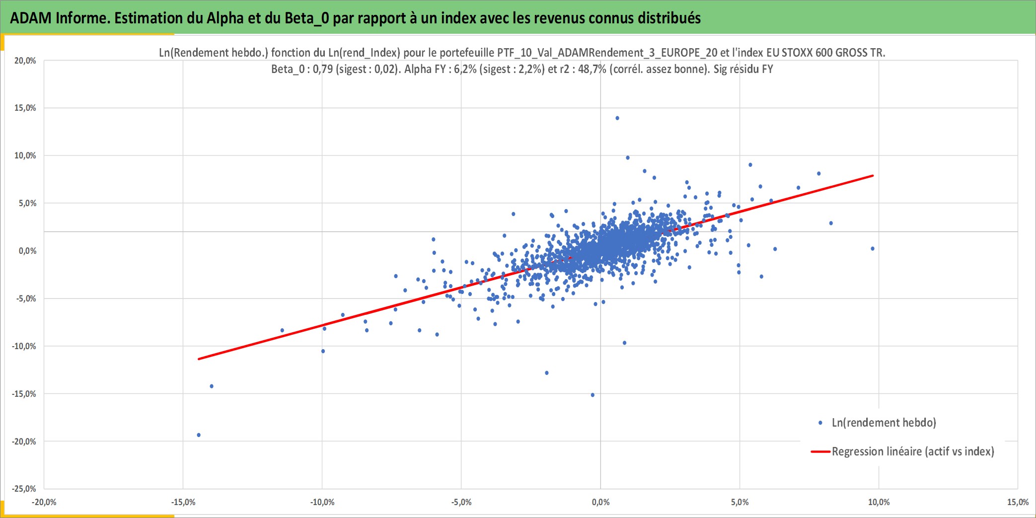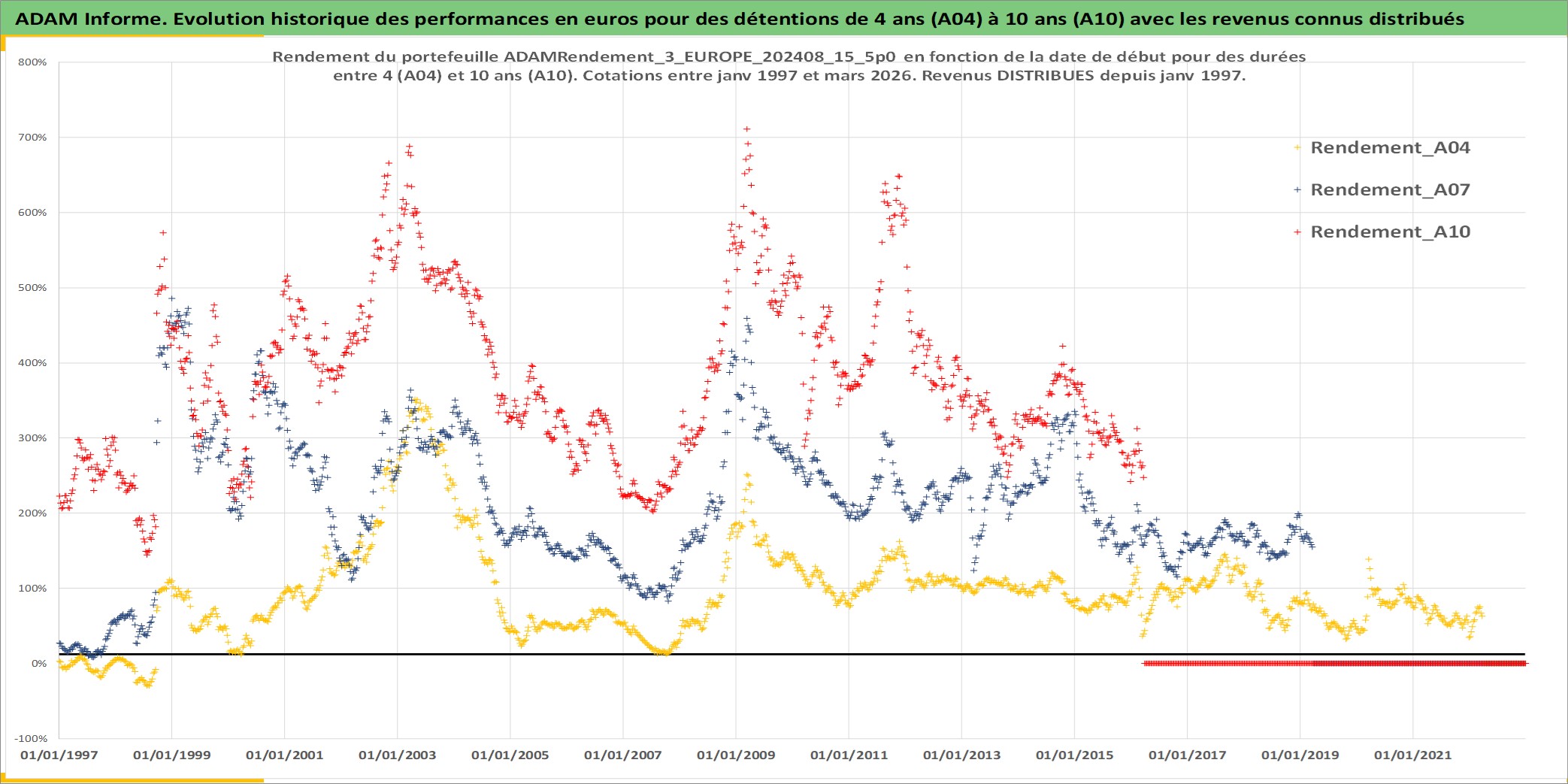 Site dédié aux investisseursPage dédiée sur site financeAnalyse des valorisations hebdomadaires du portefeuille ADAMRendement_3_EUROPE_202408_15_5p0_10actifs avec un profil P6_PurActions. Ce portefeuille est cote en EUR. Les valorisations couvrent les semaines 1997W01 a 2026W13. Les revenus de cet actif financier sont pris en compte depuis la semaine 1997W01. La note globale ESG de cet actif est estimee a 11.7 (apres rebasage entre 0 et 20).