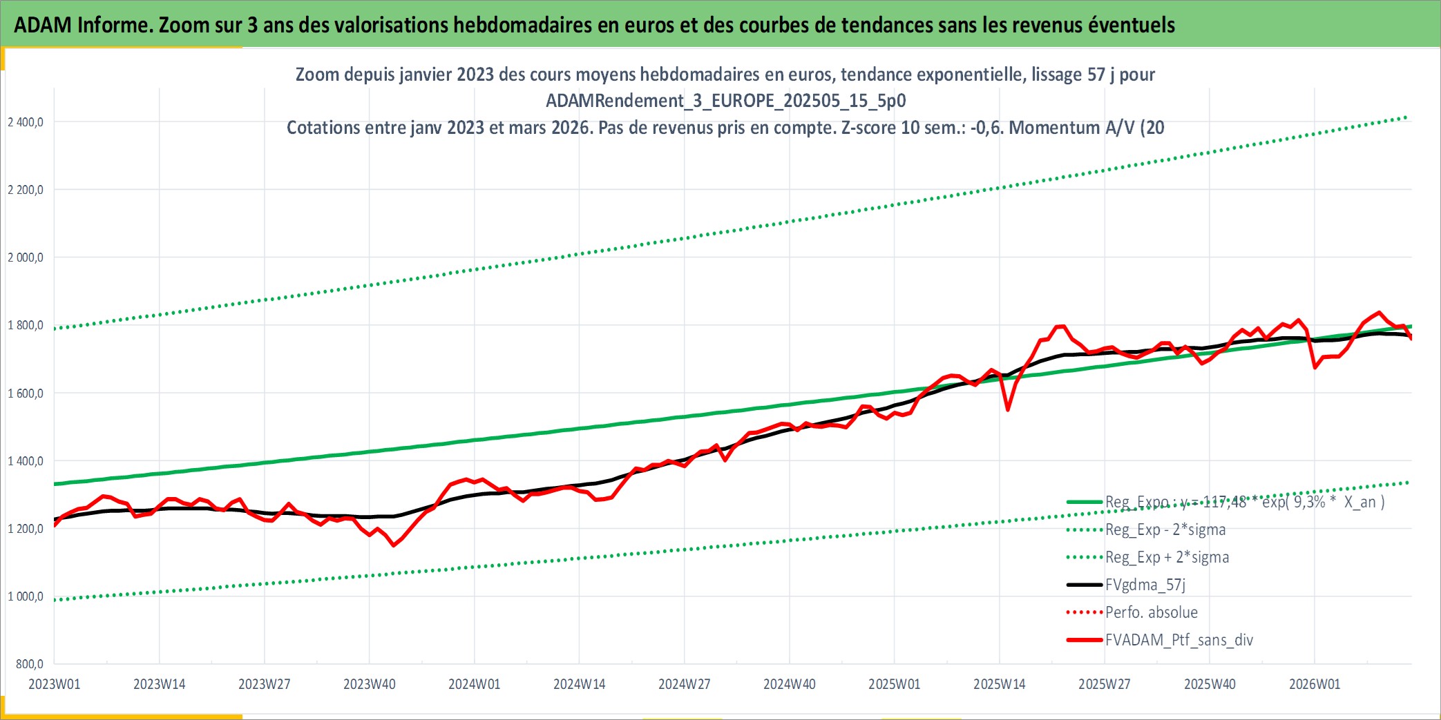 Site dédié aux investisseursPage dédiée sur site financeAnalyse des valorisations hebdomadaires du portefeuille ADAMRendement_3_EUROPE_202505_15_5p0_14actifs avec un profil P6_PurActions. Ce portefeuille est cote en EUR. Les valorisations couvrent les semaines 1997W01 a 2026W13. Les revenus de cet actif financier sont pris en compte depuis la semaine 1997W01. La note globale ESG de cet actif est estimee a 13.2 (apres rebasage entre 0 et 20).