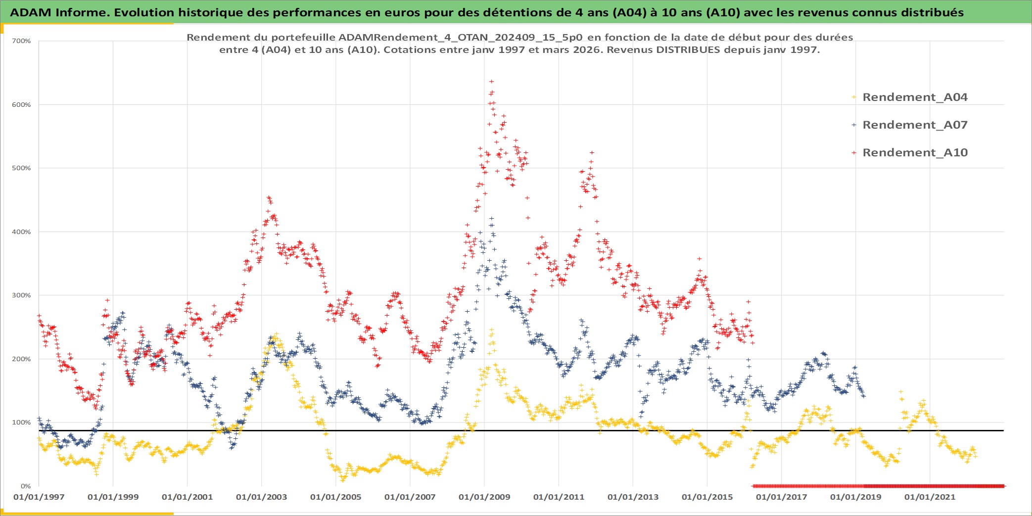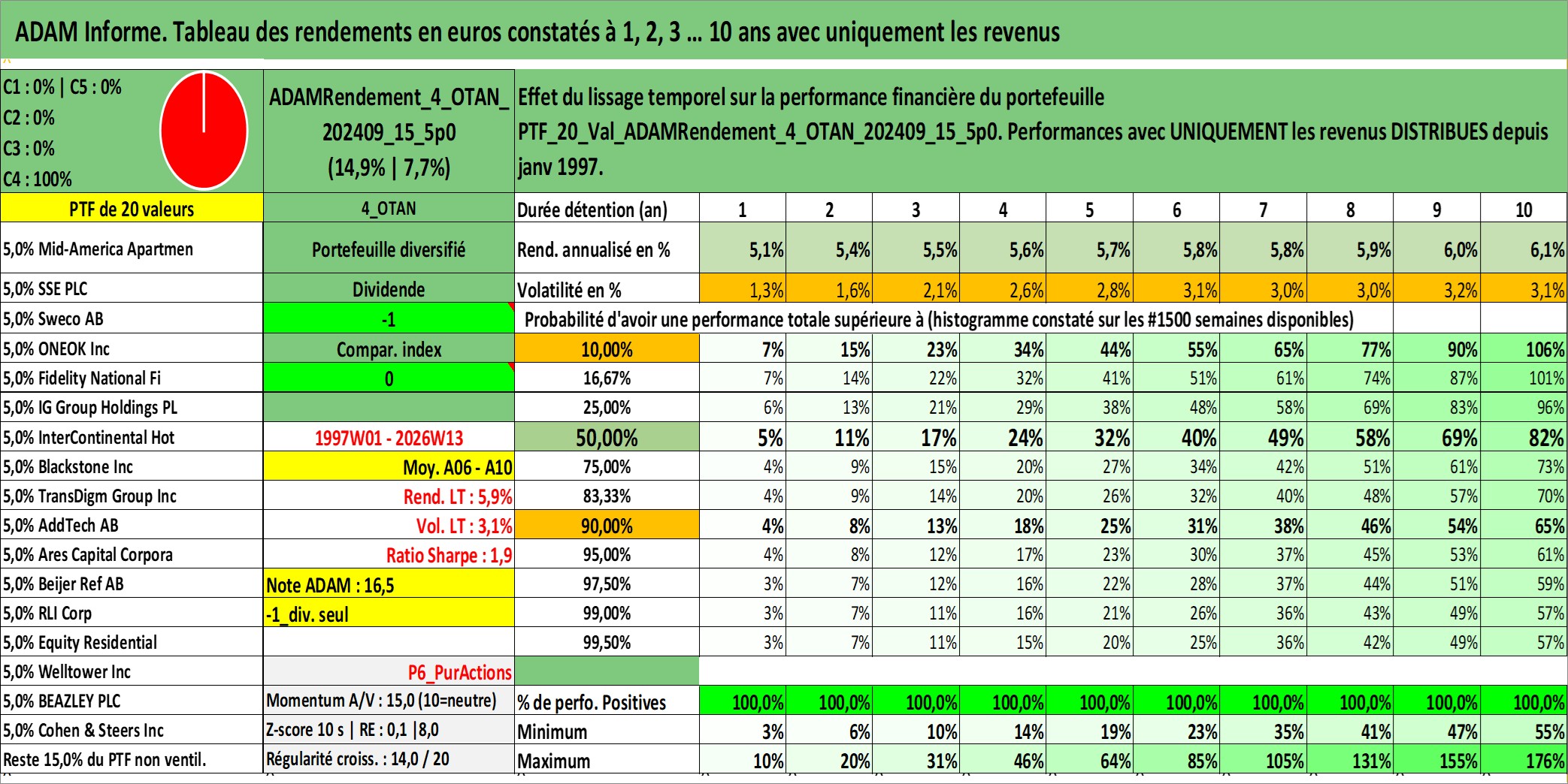 Site dédié aux investisseursPage dédiée sur site financeAnalyse des valorisations hebdomadaires du portefeuille ADAMRendement_4_OTAN_202409_15_5p0_20actifs avec un profil P6_PurActions. Ce portefeuille est cote en EUR. Les valorisations couvrent les semaines 1997W01 a 2026W13. Les revenus de cet actif financier sont pris en compte depuis la semaine 1997W01. La note globale ESG de cet actif est estimee a 10.5 (apres rebasage entre 0 et 20).