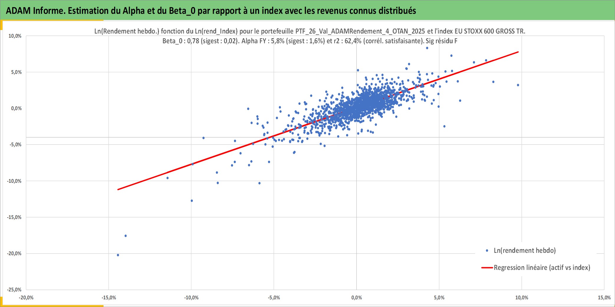 Site dédié aux investisseursPage dédiée sur site financeAnalyse des valorisations hebdomadaires du portefeuille ADAMRendement_4_OTAN_202501_15_5p0_26actifs avec un profil P6_PurActions. Ce portefeuille est cote en EUR. Les valorisations couvrent les semaines 1997W01 a 2026W13. Les revenus de cet actif financier sont pris en compte depuis la semaine 1997W01. La note globale ESG de cet actif est estimee a 11.6 (apres rebasage entre 0 et 20).