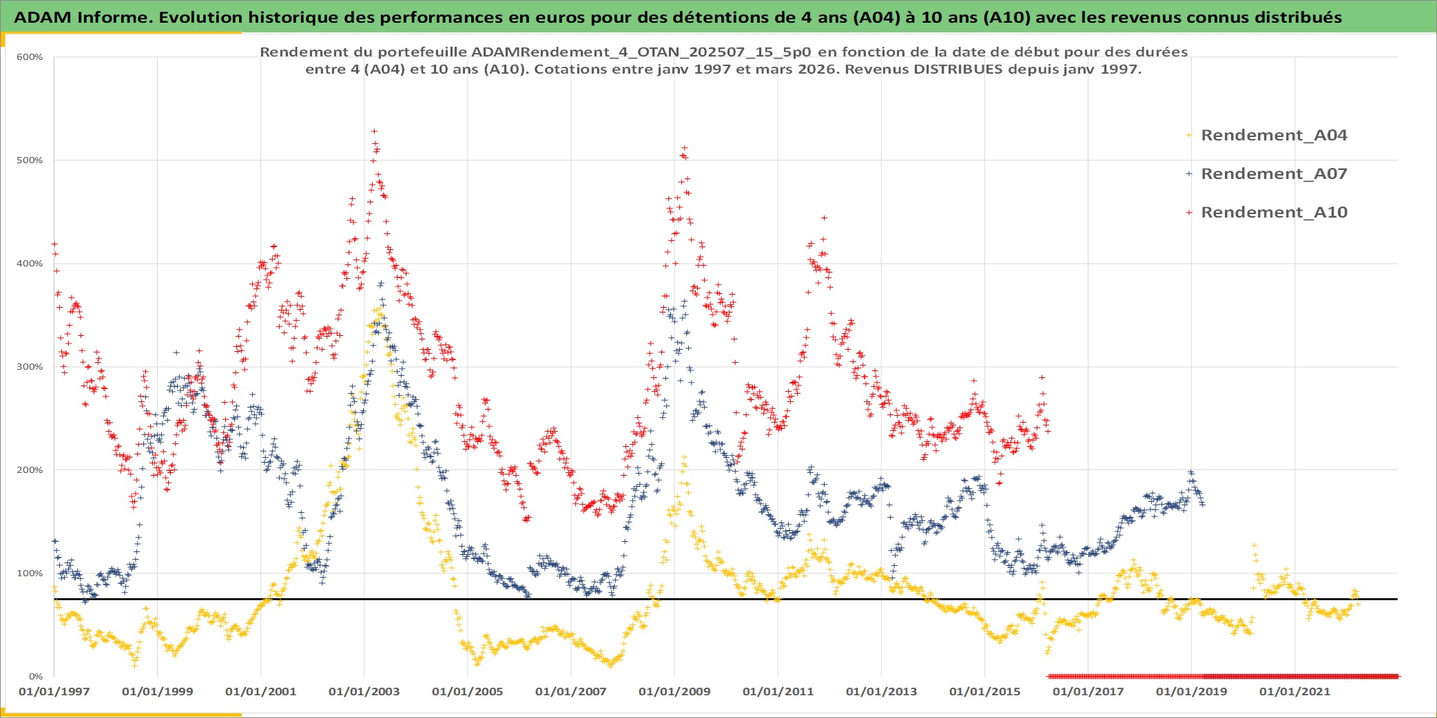 Site dédié aux investisseursPage dédiée sur site financeAnalyse des valorisations hebdomadaires du portefeuille ADAMRendement_4_OTAN_202507_15_5p0_19actifs avec un profil P6_PurActions. Ce portefeuille est cote en EUR. Les valorisations couvrent les semaines 1997W01 a 2026W13. Les revenus de cet actif financier sont pris en compte depuis la semaine 1997W01. La note globale ESG de cet actif est estimee a 11.2 (apres rebasage entre 0 et 20).