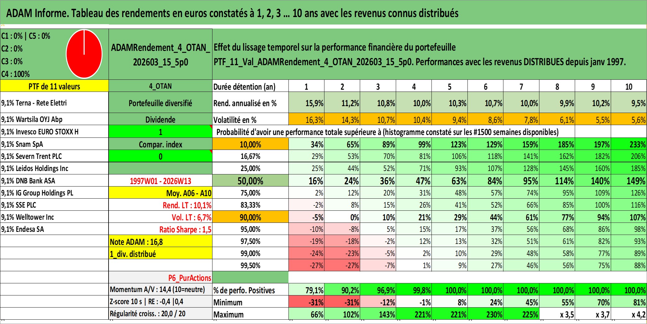 Site dédié aux investisseursPage dédiée sur site financeAnalyse des valorisations hebdomadaires du portefeuille ADAMRendement_4_OTAN_202603_15_5p0_11actifs avec un profil P6_PurActions. Ce portefeuille est cote en EUR. Les valorisations couvrent les semaines 1997W01 a 2026W13. Les revenus de cet actif financier sont pris en compte depuis la semaine 1997W01. La note globale ESG de cet actif est estimee a 13.1 (apres rebasage entre 0 et 20).