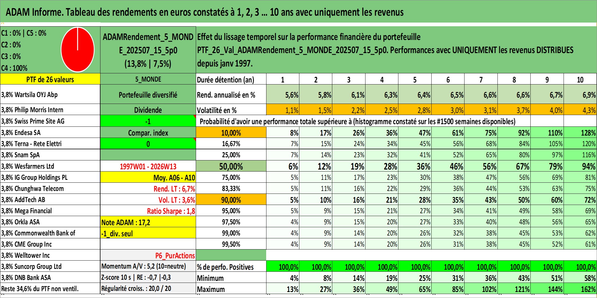 Site dédié aux investisseursPage dédiée sur site financeAnalyse des valorisations hebdomadaires du portefeuille ADAMRendement_5_MONDE_202507_15_5p0_26actifs avec un profil P6_PurActions. Ce portefeuille est cote en EUR. Les valorisations couvrent les semaines 1997W01 a 2026W13. Les revenus de cet actif financier sont pris en compte depuis la semaine 1997W01. La note globale ESG de cet actif est estimee a 11.2 (apres rebasage entre 0 et 20).
