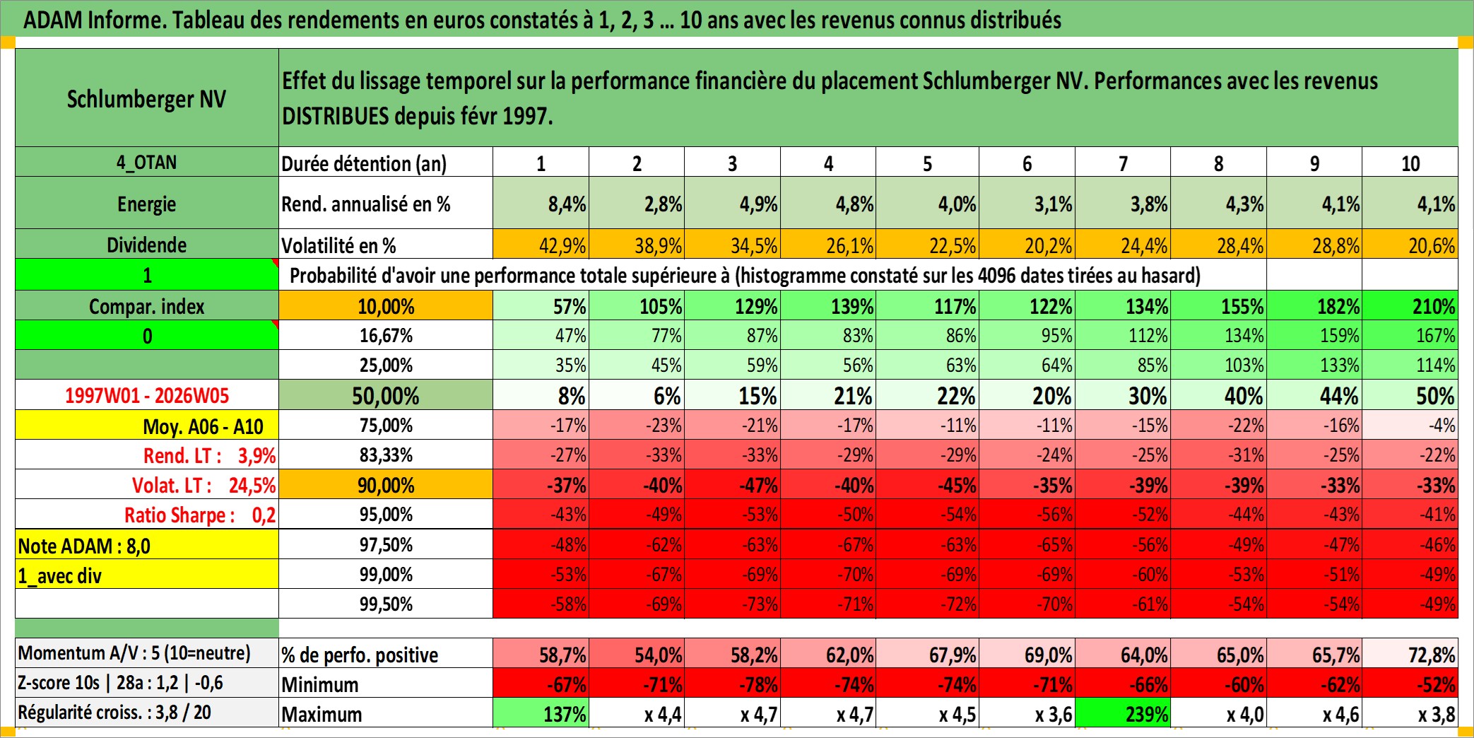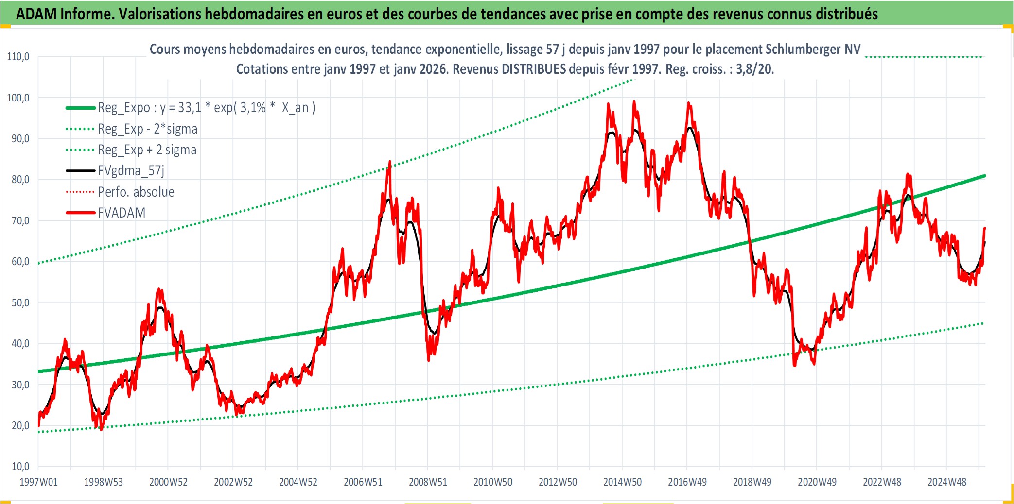 Site dédié aux investisseursPage dédiée sur site financeAnalyse des valorisations hebdomadaires de l'action Schlumberger NV. Cet actif est cote en USD. Les valorisations sont en contrevaleur EURO et couvrent les semaines 1997W01 a 2026W05. Les revenus de cet actif financier sont pris en compte depuis la semaine 1997W08. La note globale ESG de cet actif est estimee a 9.0 (apres rebasage entre 0 et 20).