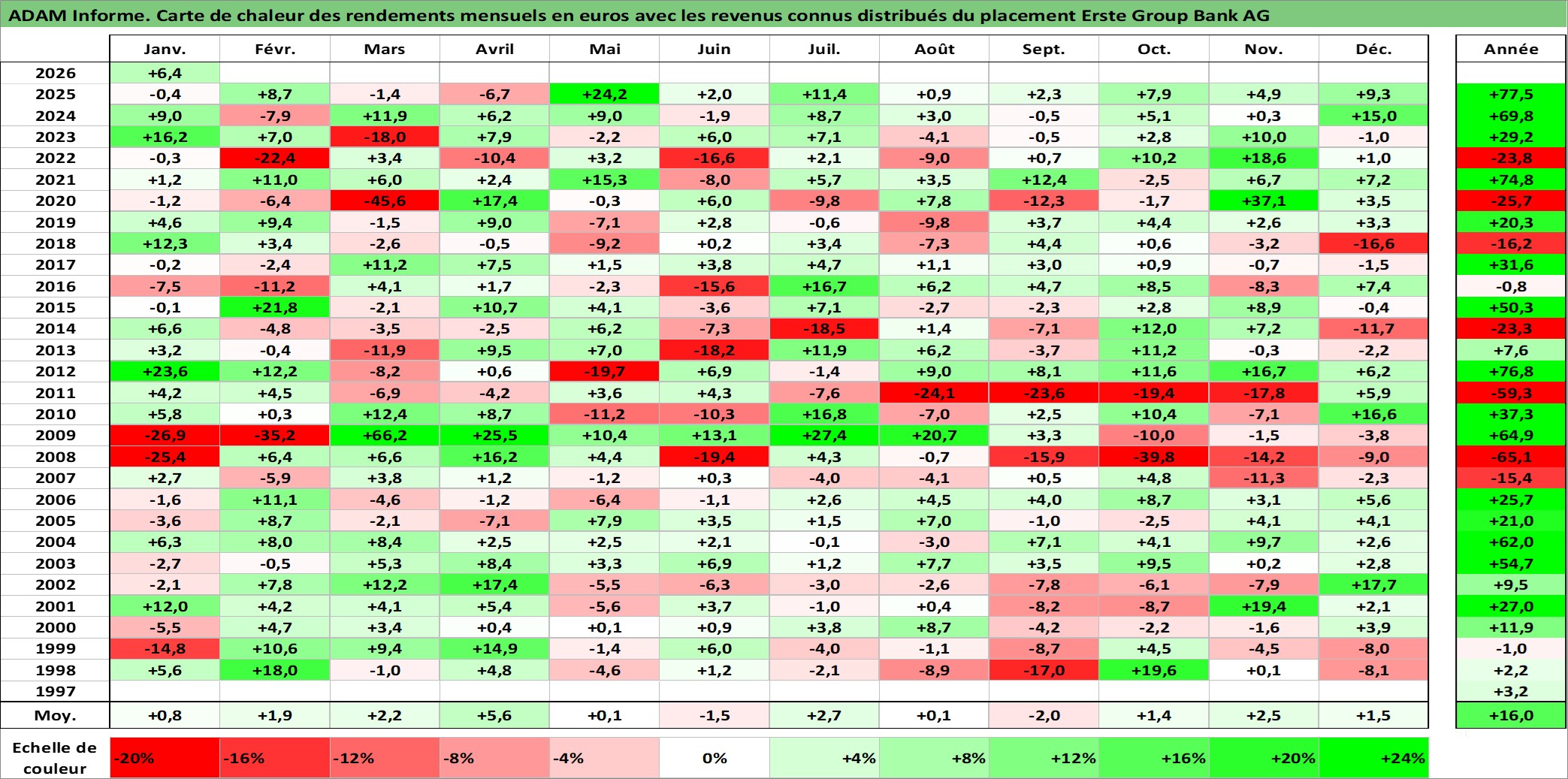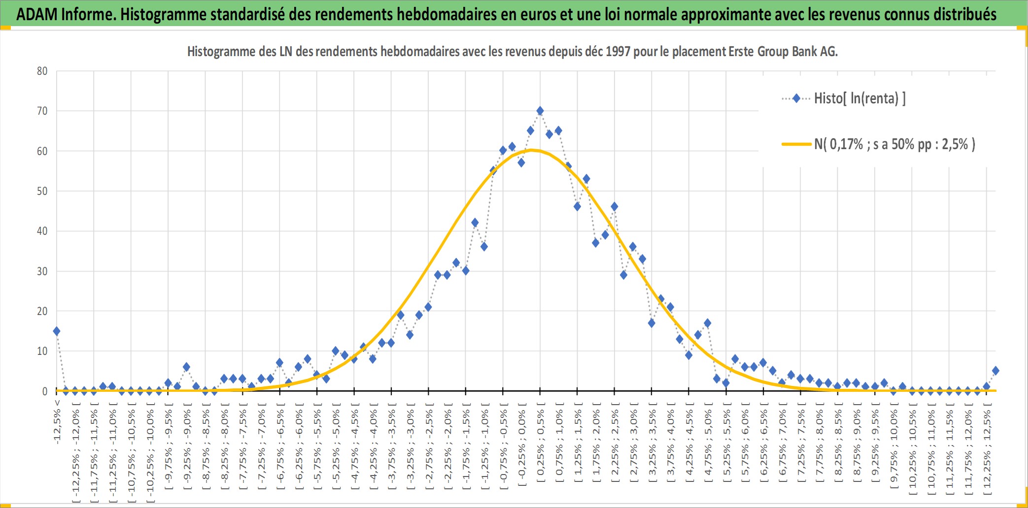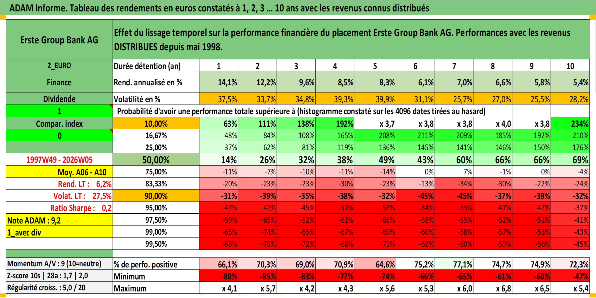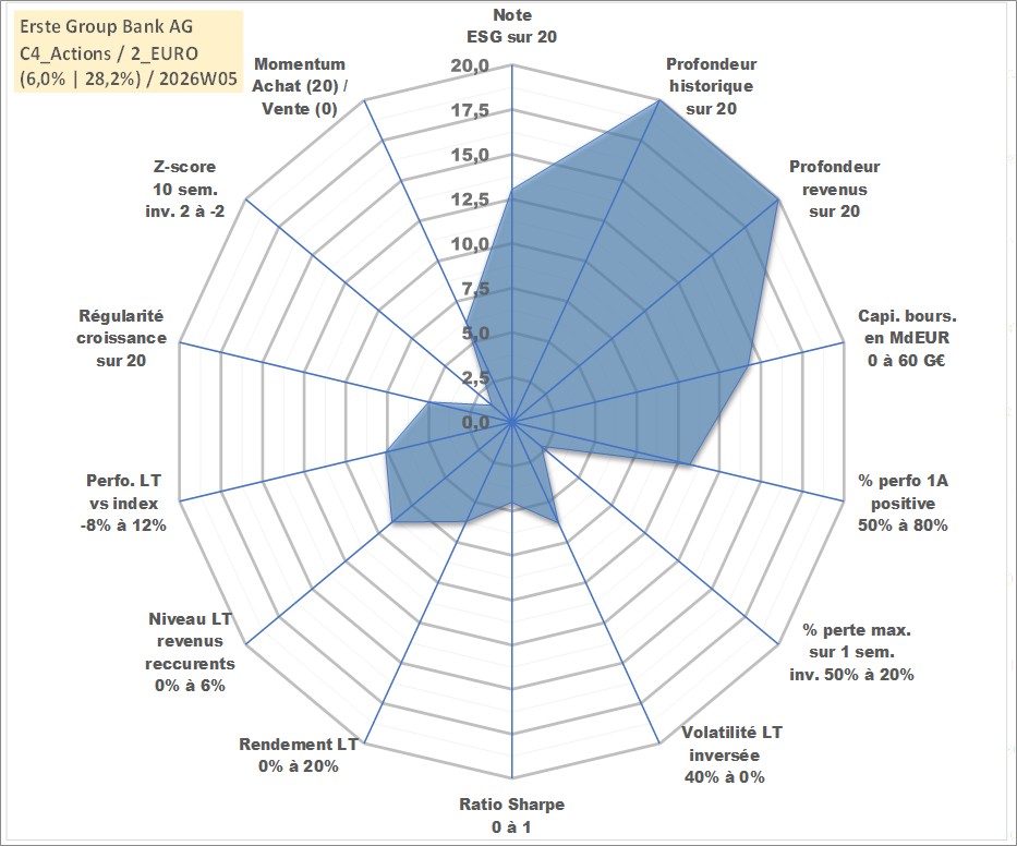 Site dédié aux investisseursPage dédiée sur site financeAnalyse des valorisations hebdomadaires de l'action Erste Group Bank AG. Cet actif est cote en EUR. Les valorisations couvrent les semaines 1997W49 a 2026W05. Les revenus de cet actif financier sont pris en compte depuis la semaine 1998W22. La note globale ESG de cet actif est estimee a 13.0 (apres rebasage entre 0 et 20).
