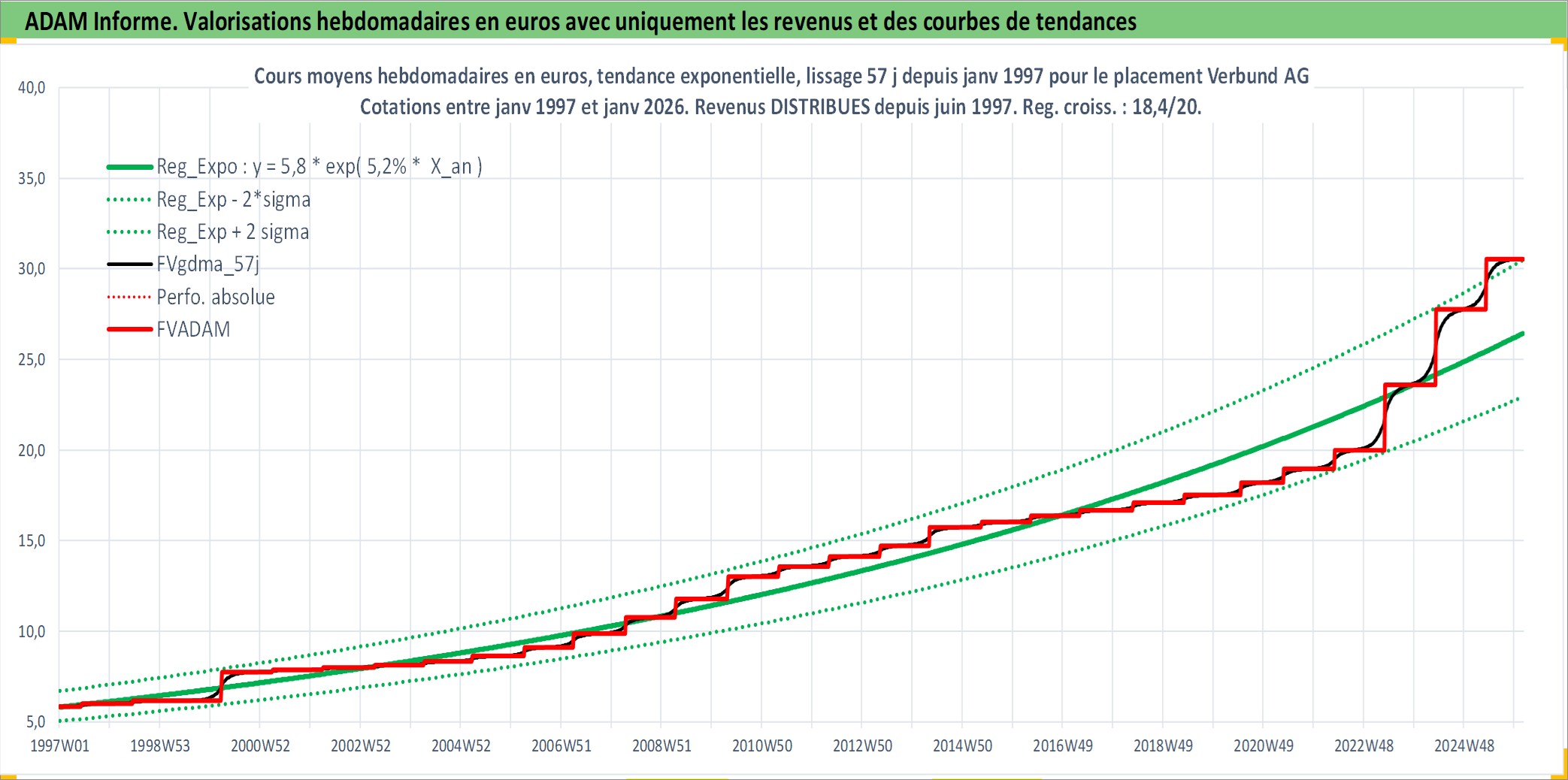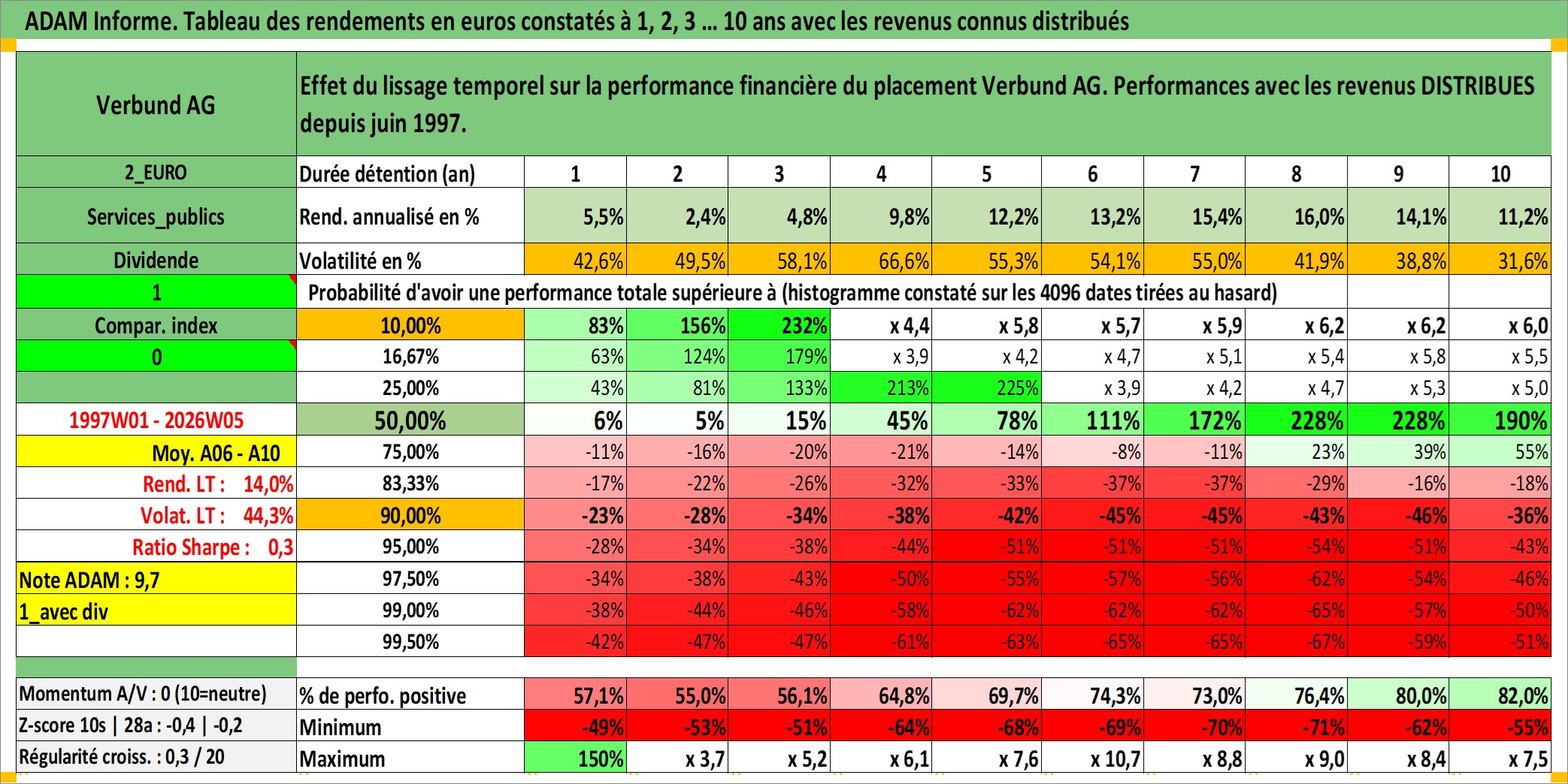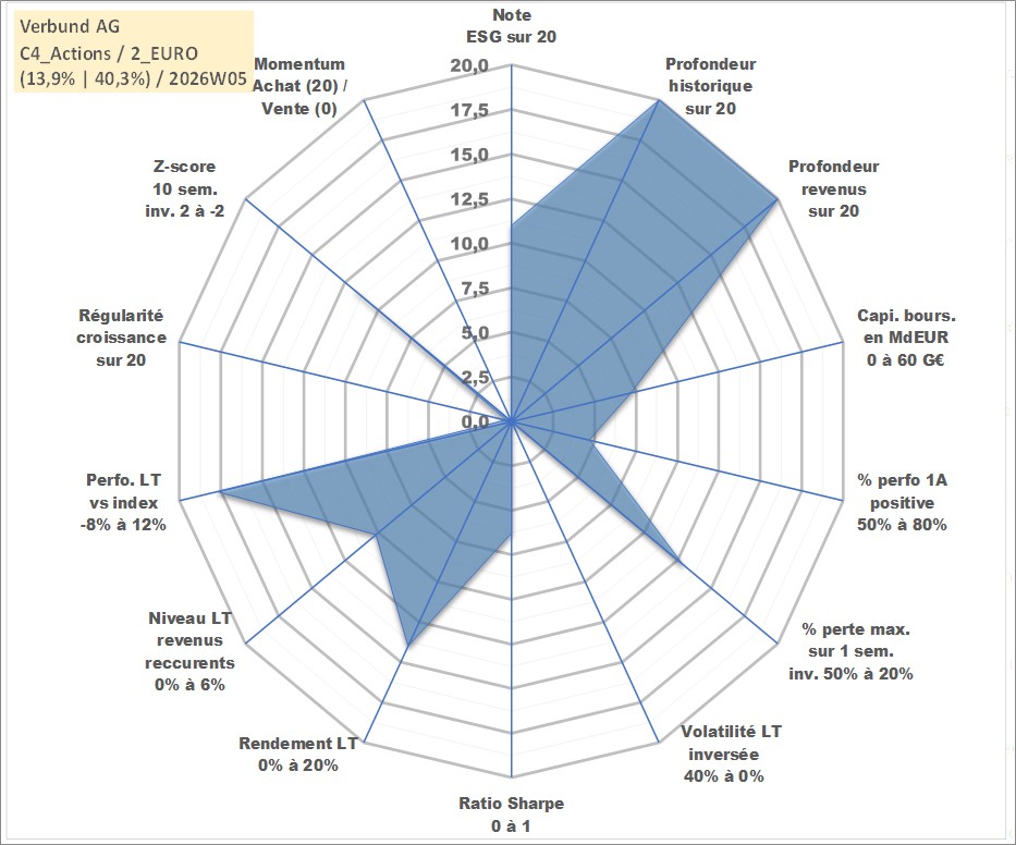 Site dédié aux investisseursPage dédiée sur site financeAnalyse des valorisations hebdomadaires de l'action Verbund AG. Cet actif est cote en EUR. Les valorisations couvrent les semaines 1997W01 a 2026W05. Les revenus de cet actif financier sont pris en compte depuis la semaine 1997W24. La note globale ESG de cet actif est estimee a 11.0 (apres rebasage entre 0 et 20).