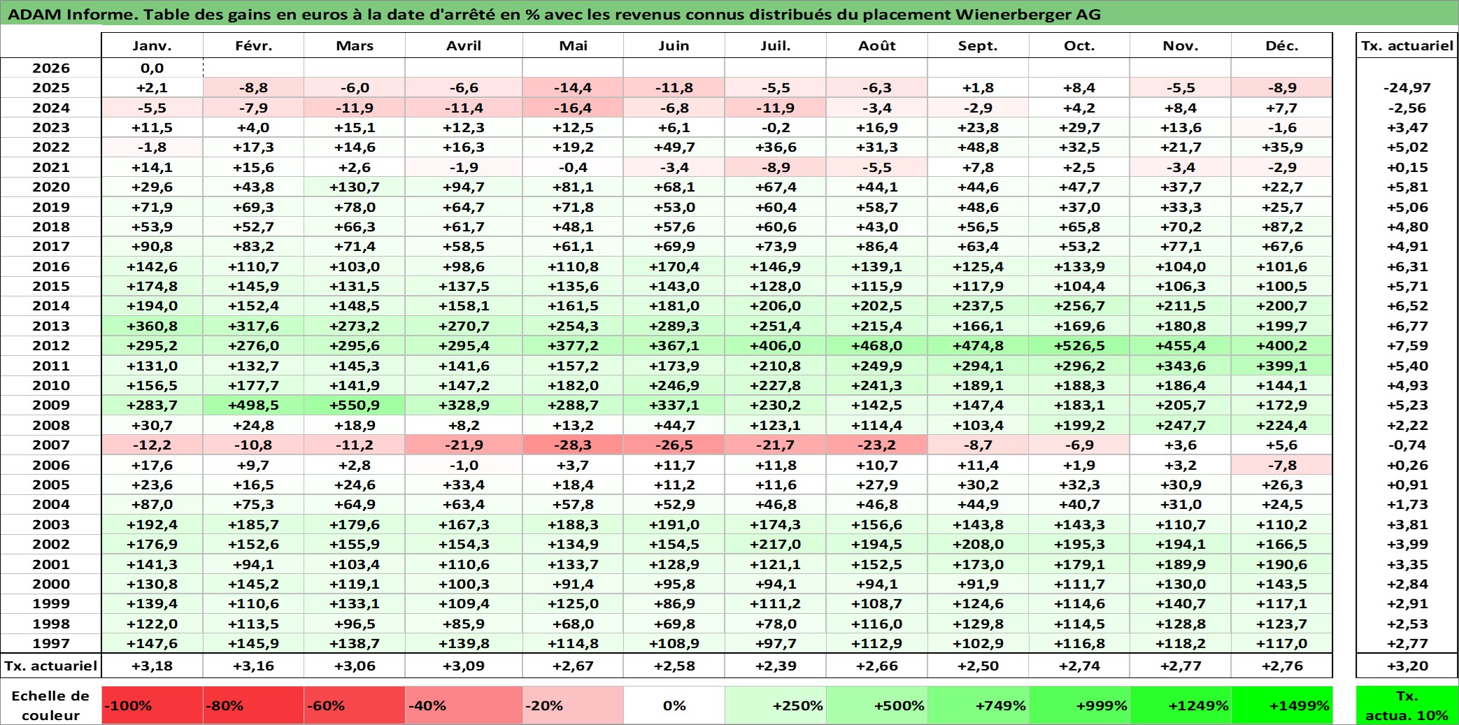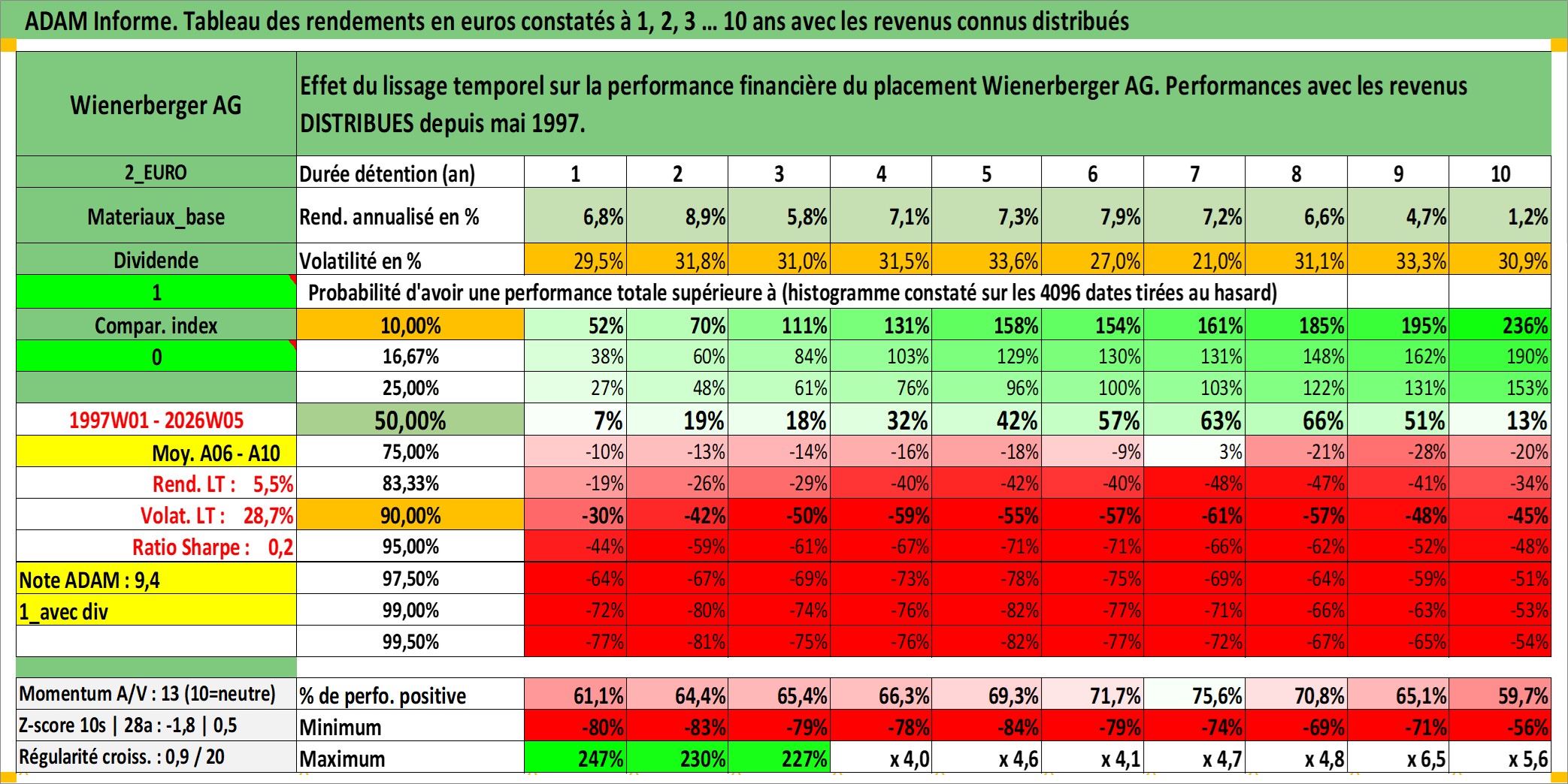 Site dédié aux investisseursPage dédiée sur site financeAnalyse des valorisations hebdomadaires de l'action Wienerberger AG. Cet actif est cote en EUR. Les valorisations couvrent les semaines 1997W01 a 2026W05. Les revenus de cet actif financier sont pris en compte depuis la semaine 1997W22. La note ESG de cet actif n'est pas connue.