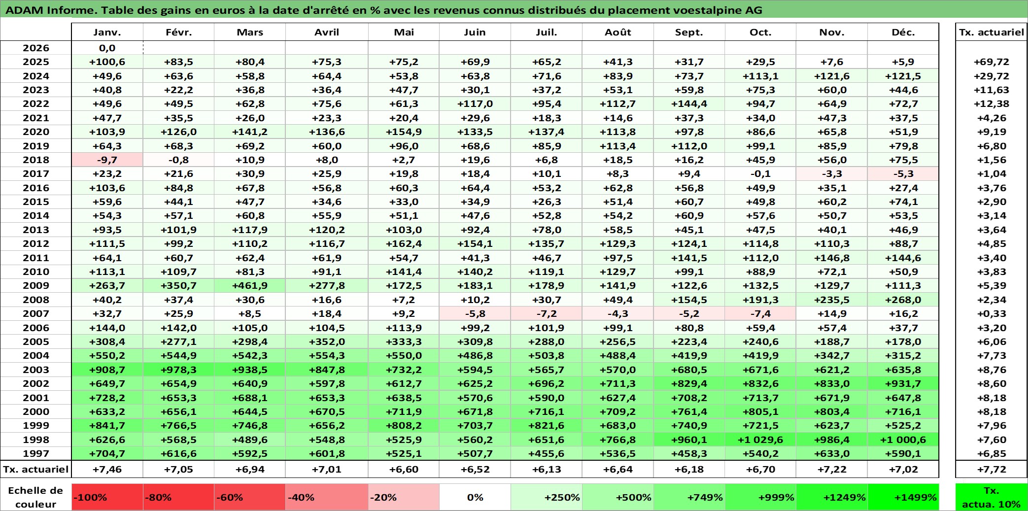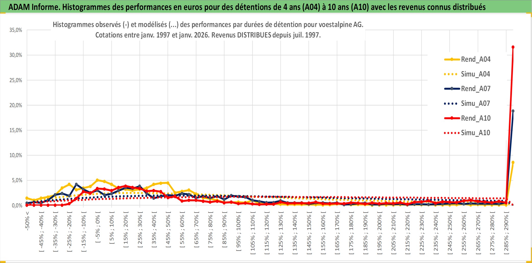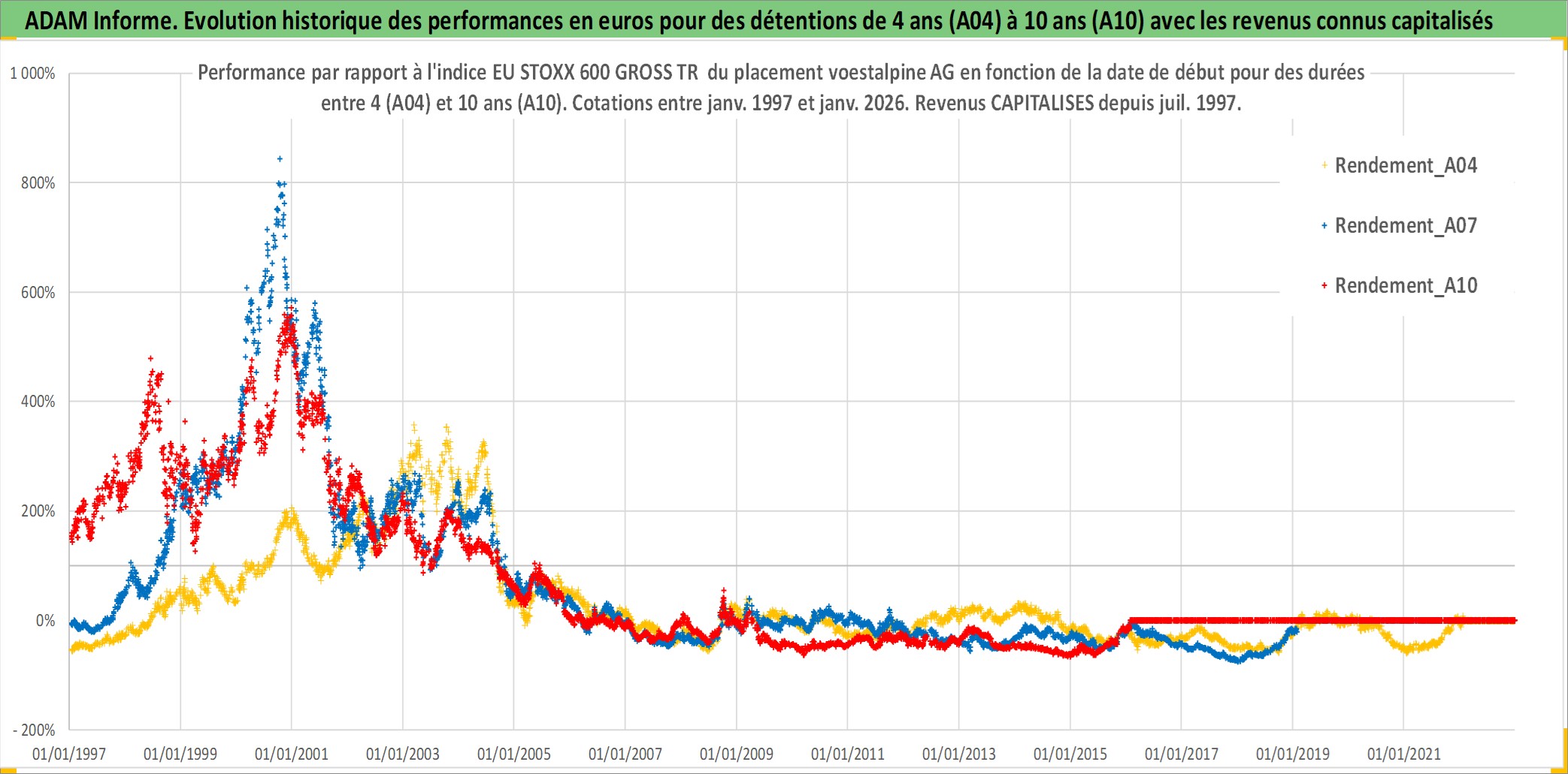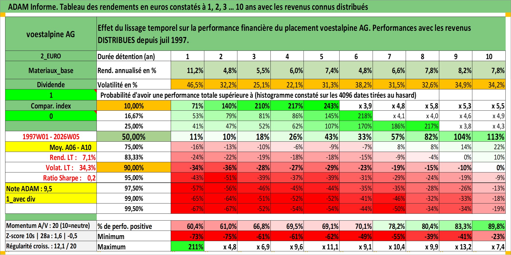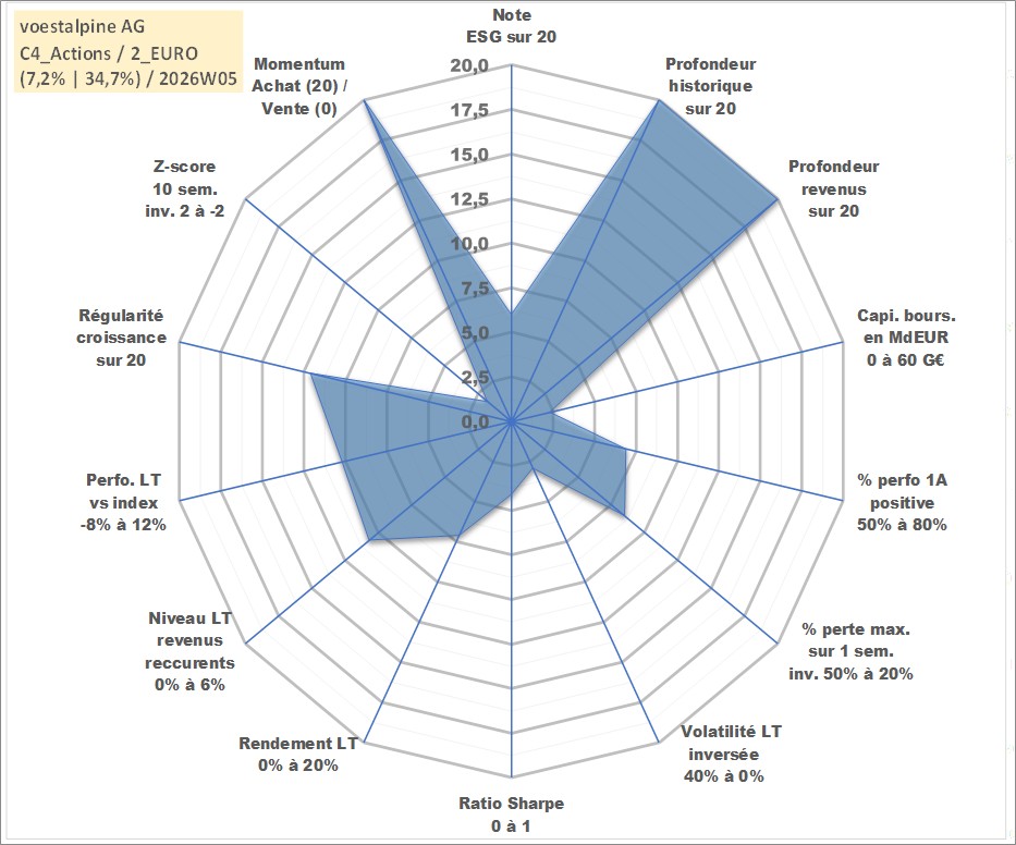 Site dédié aux investisseursPage dédiée sur site financeAnalyse des valorisations hebdomadaires de l'action voestalpine AG. Cet actif est cote en EUR. Les valorisations couvrent les semaines 1997W01 a 2026W05. Les revenus de cet actif financier sont pris en compte depuis la semaine 1997W28. La note globale ESG de cet actif est estimee a 6.0 (apres rebasage entre 0 et 20).
