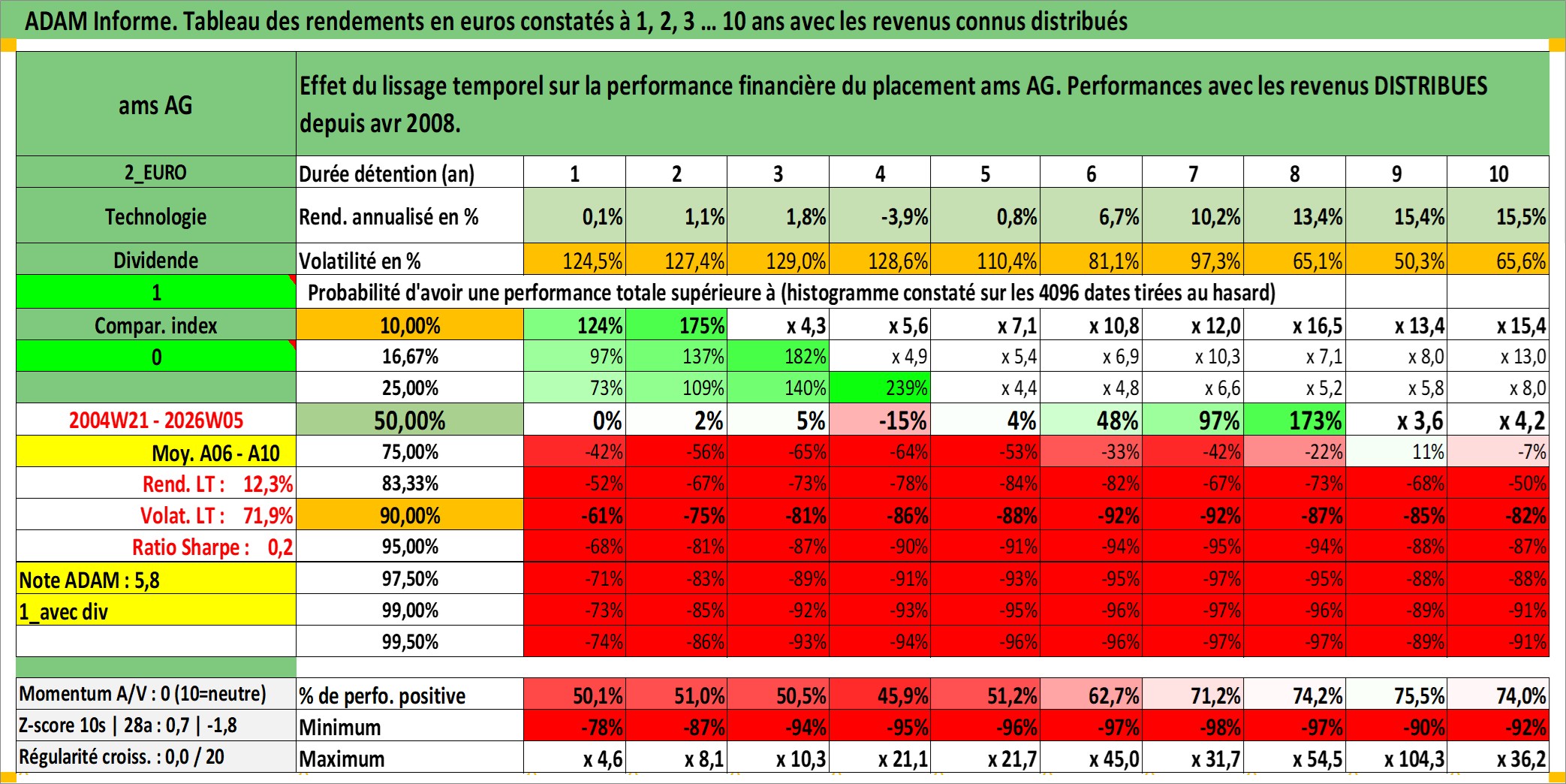 Site dédié aux investisseursPage dédiée sur site financeAnalyse des valorisations hebdomadaires de l'action ams AG. Cet actif est cote en CHF. Les valorisations sont en contrevaleur EURO et couvrent les semaines 2004W21 a 2026W05. Les revenus de cet actif financier sont pris en compte depuis la semaine 2008W14. La note ESG de cet actif n'est pas connue.