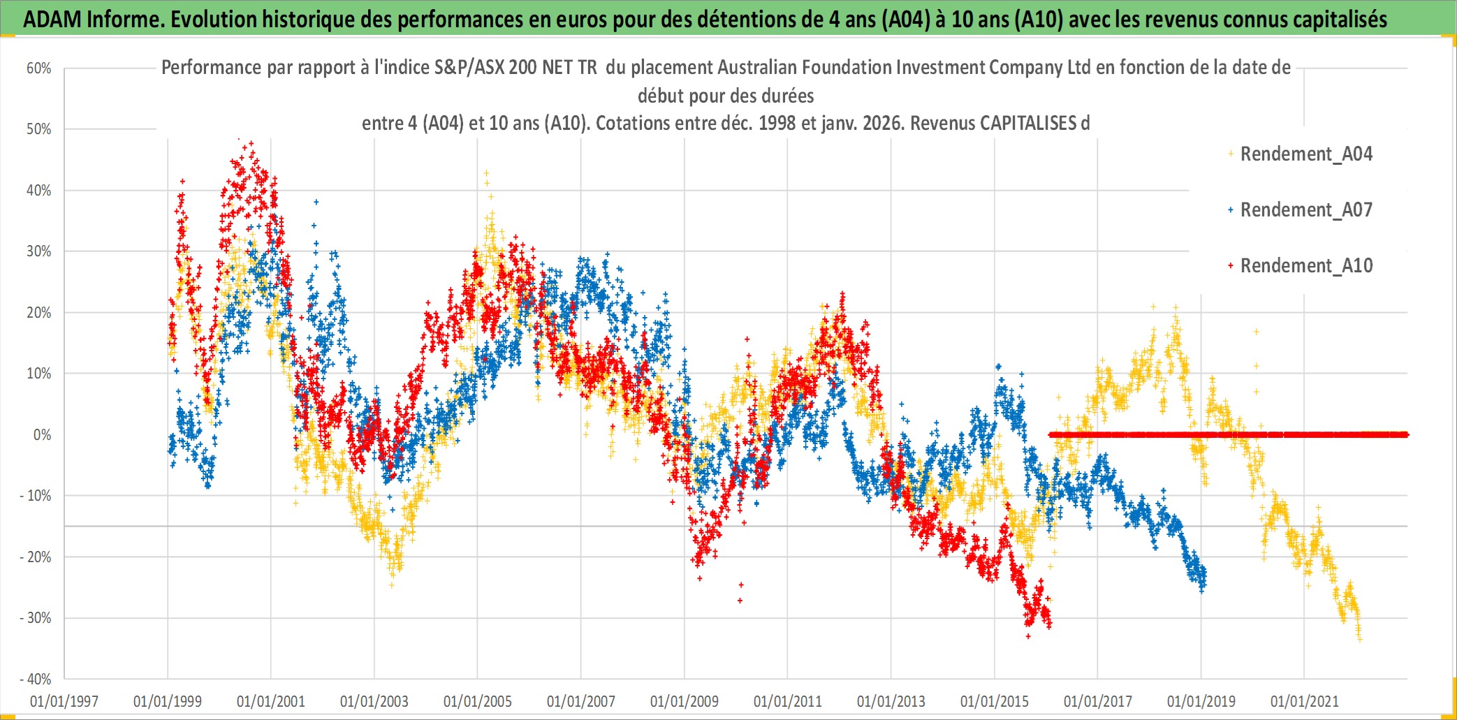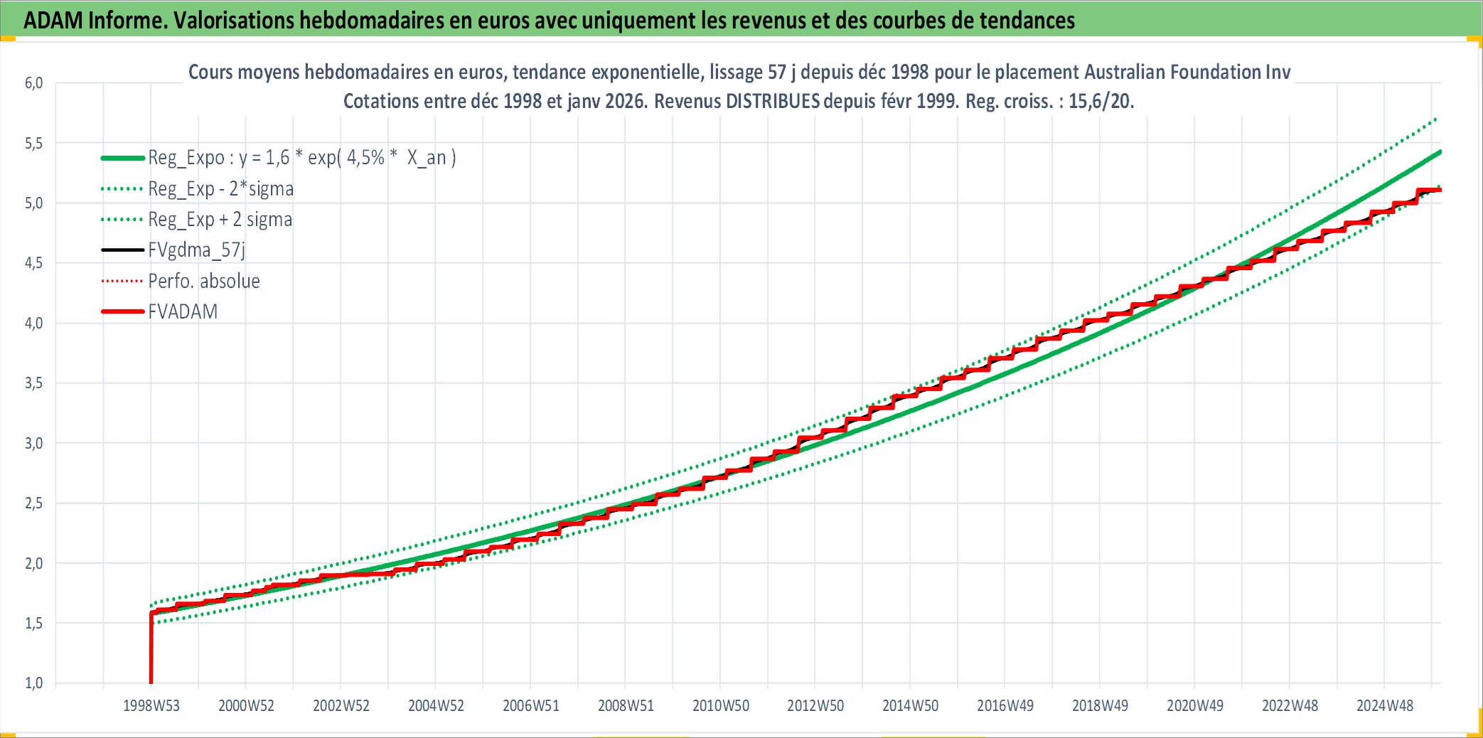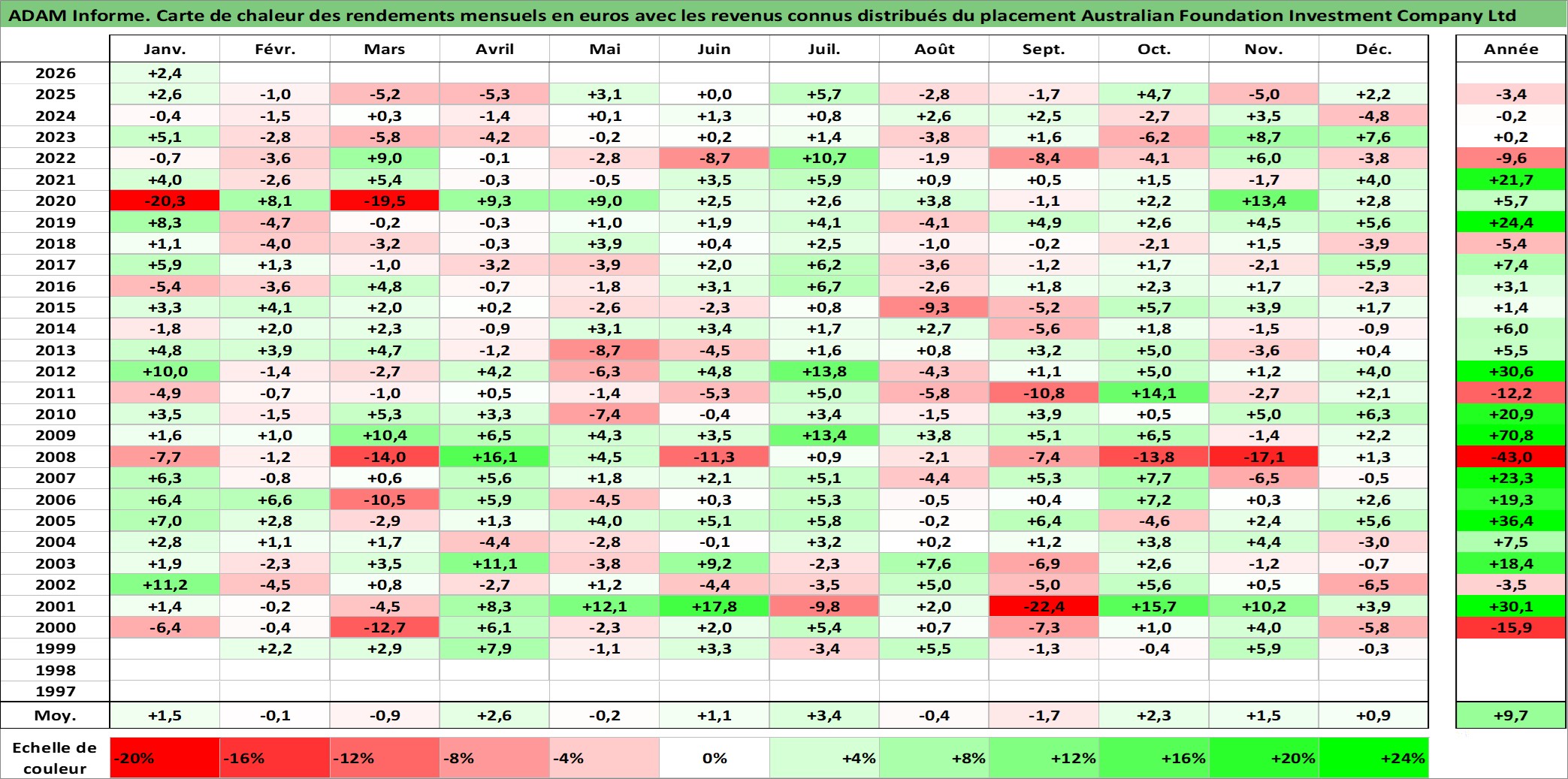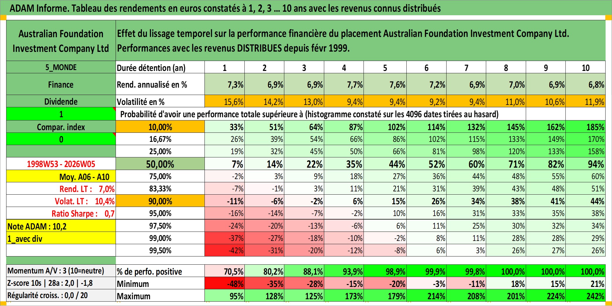 Site dédié aux investisseursPage dédiée sur site financeAnalyse des valorisations hebdomadaires de l'action Australian Foundation Investment Company Ltd. Cet actif est cote en AUD. Les valorisations sont en contrevaleur EURO et couvrent les semaines 1998W53 a 2026W05. Les revenus de cet actif financier sont pris en compte depuis la semaine 1999W07. La note ESG de cet actif n'est pas connue.