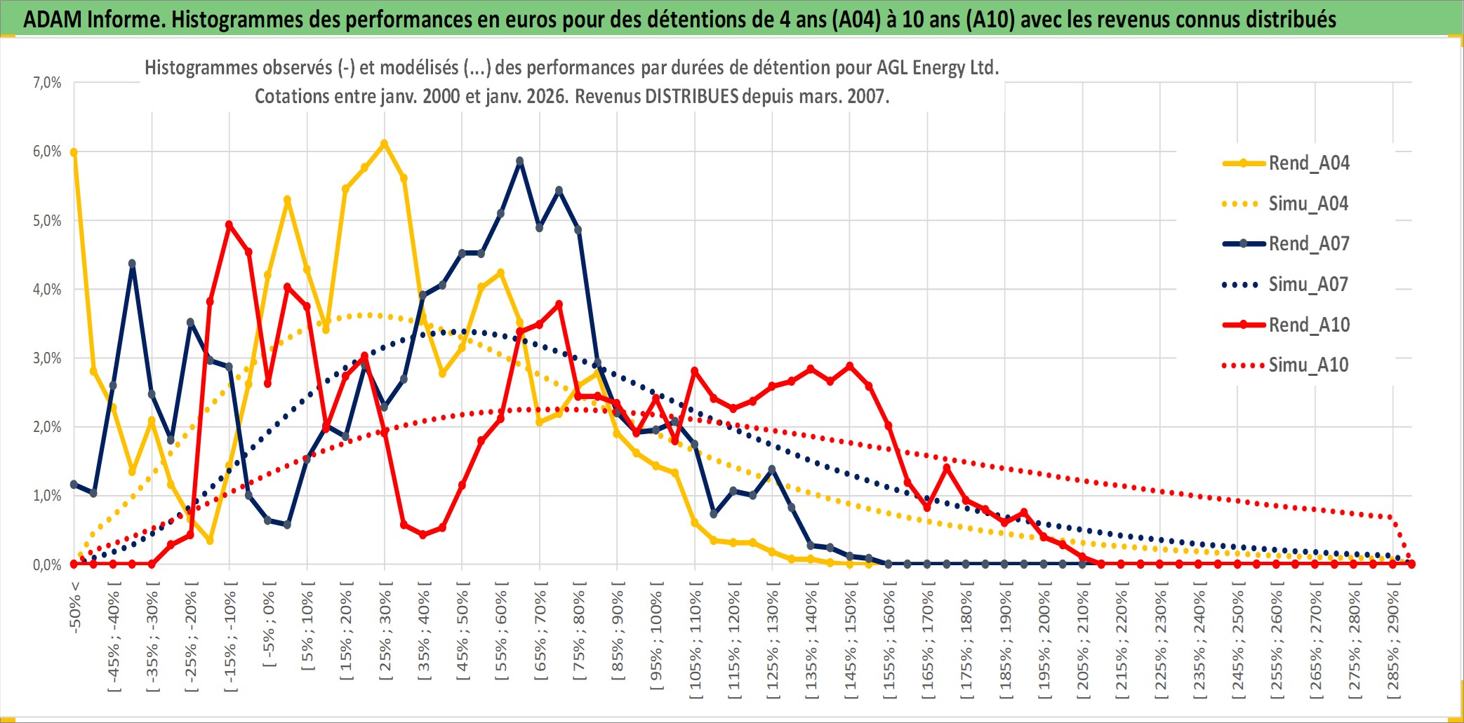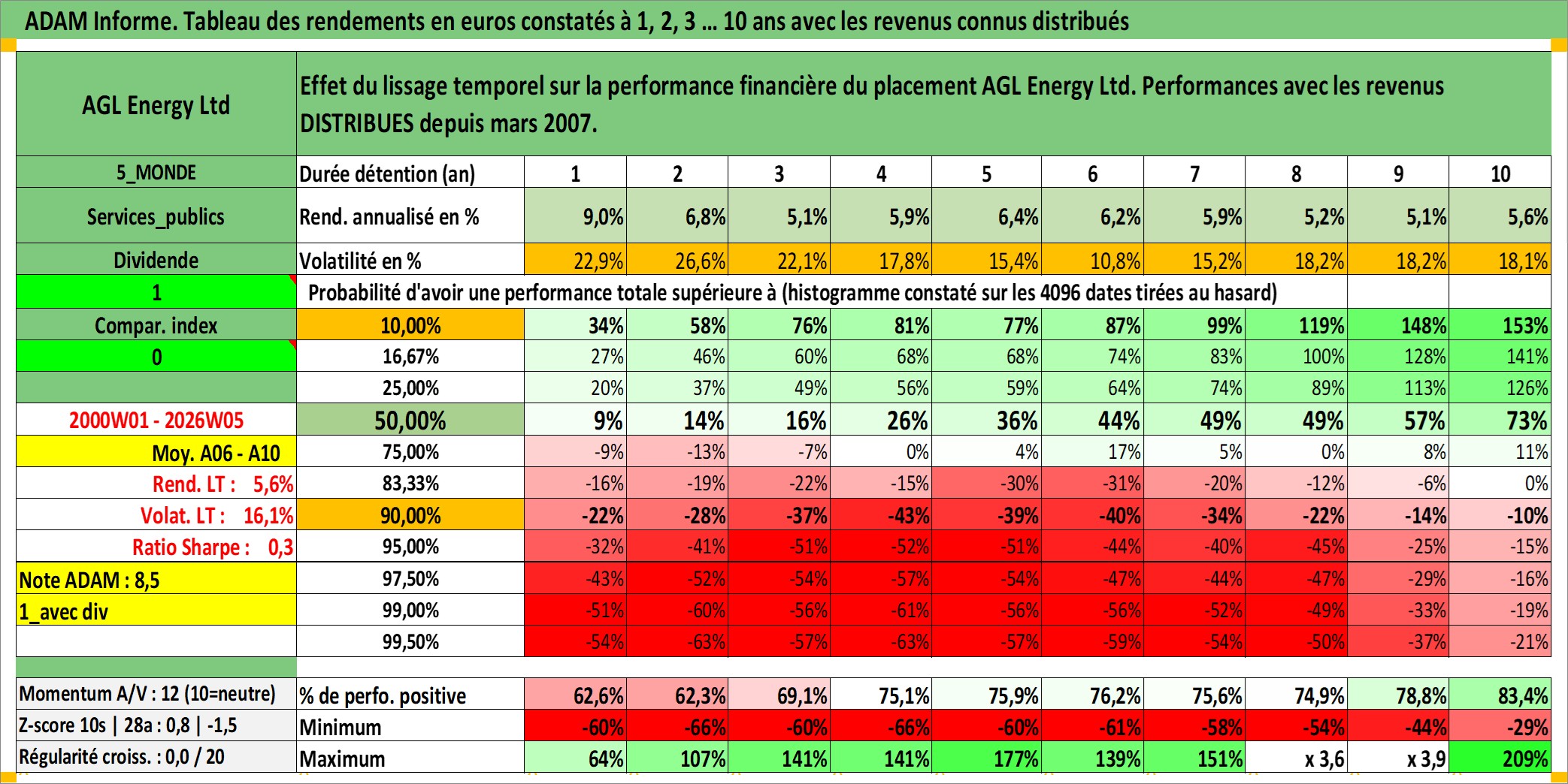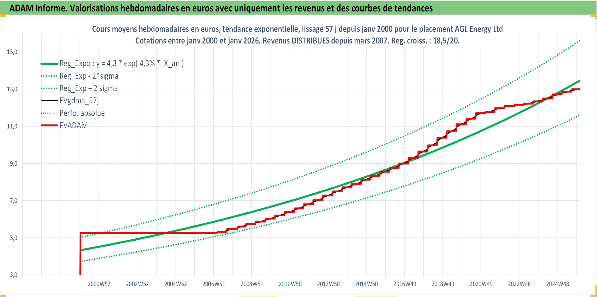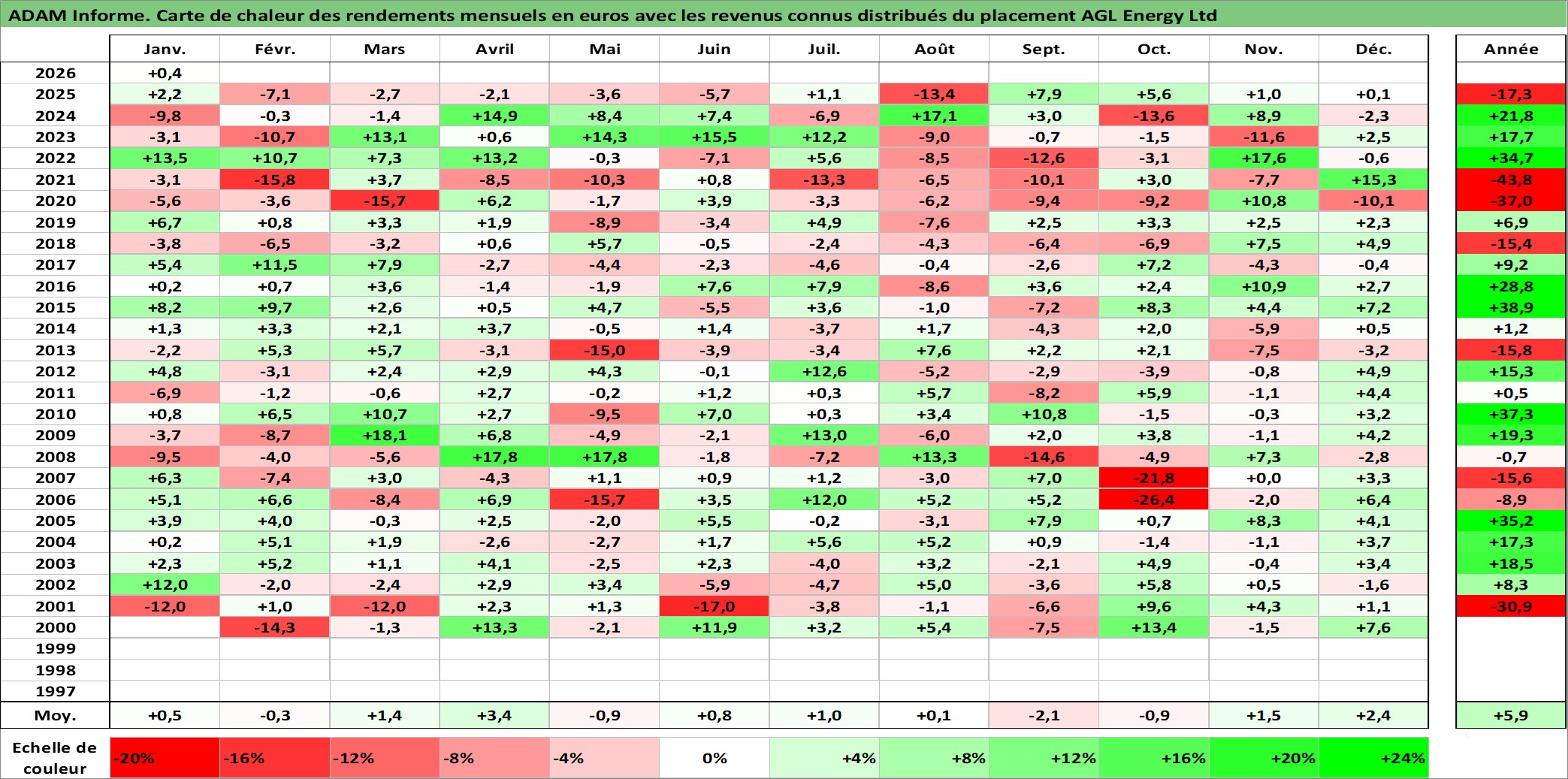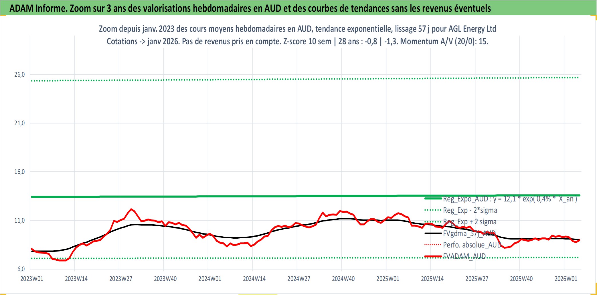 Site dédié aux investisseursPage dédiée sur site financeAnalyse des valorisations hebdomadaires de l'action AGL Energy Ltd. Cet actif est cote en AUD. Les valorisations sont en contrevaleur EURO et couvrent les semaines 2000W01 a 2026W05. Les revenus de cet actif financier sont pris en compte depuis la semaine 2007W09. La note globale ESG de cet actif est estimee a 4.0 (apres rebasage entre 0 et 20).