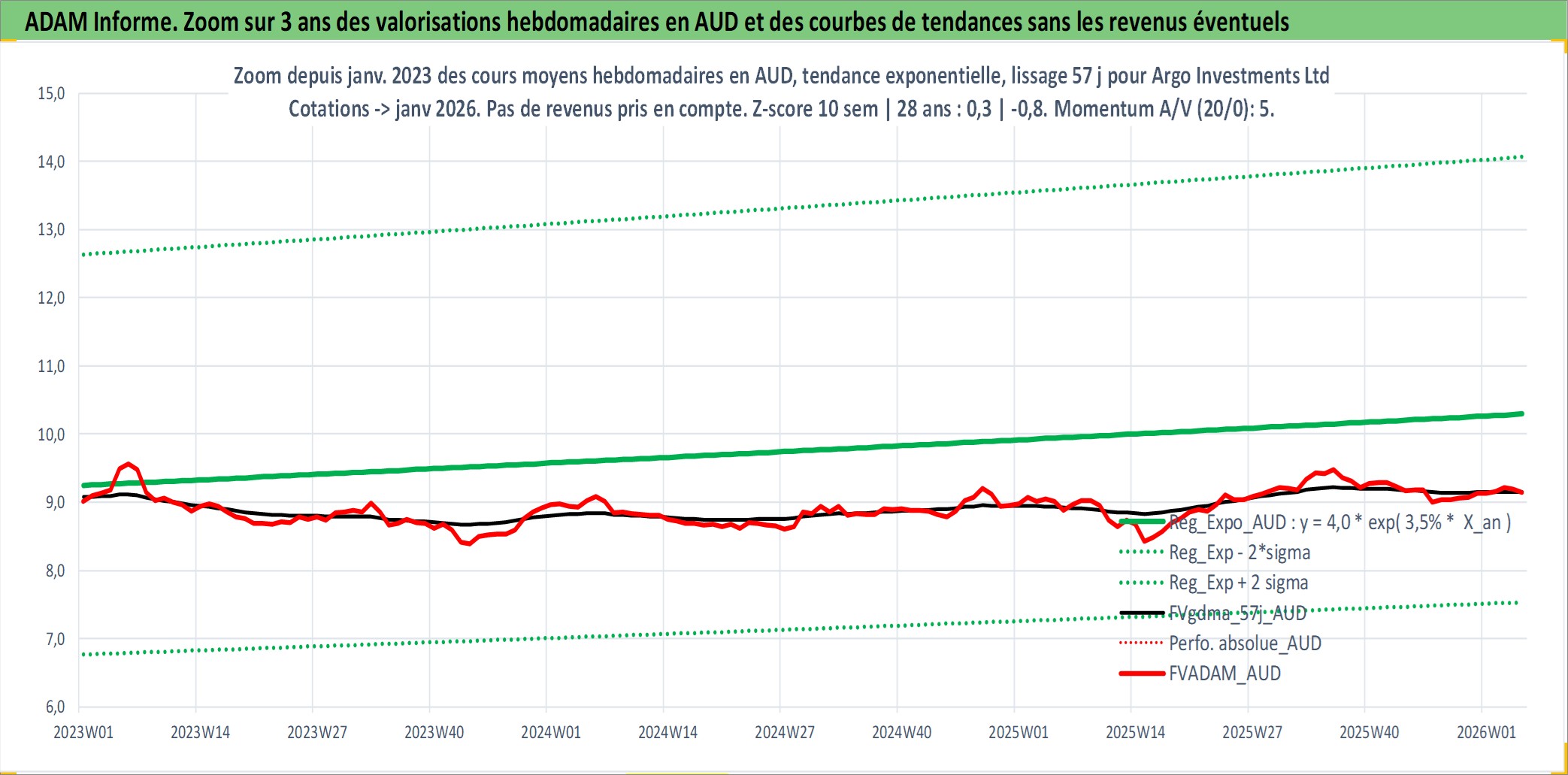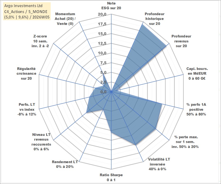 Site dédié aux investisseursPage dédiée sur site financeAnalyse des valorisations hebdomadaires de l'action Argo Investments Ltd. Cet actif est cote en AUD. Les valorisations sont en contrevaleur EURO et couvrent les semaines 1999W01 a 2026W05. Les revenus de cet actif financier sont pris en compte depuis la semaine 1999W42. La note ESG de cet actif n'est pas connue.