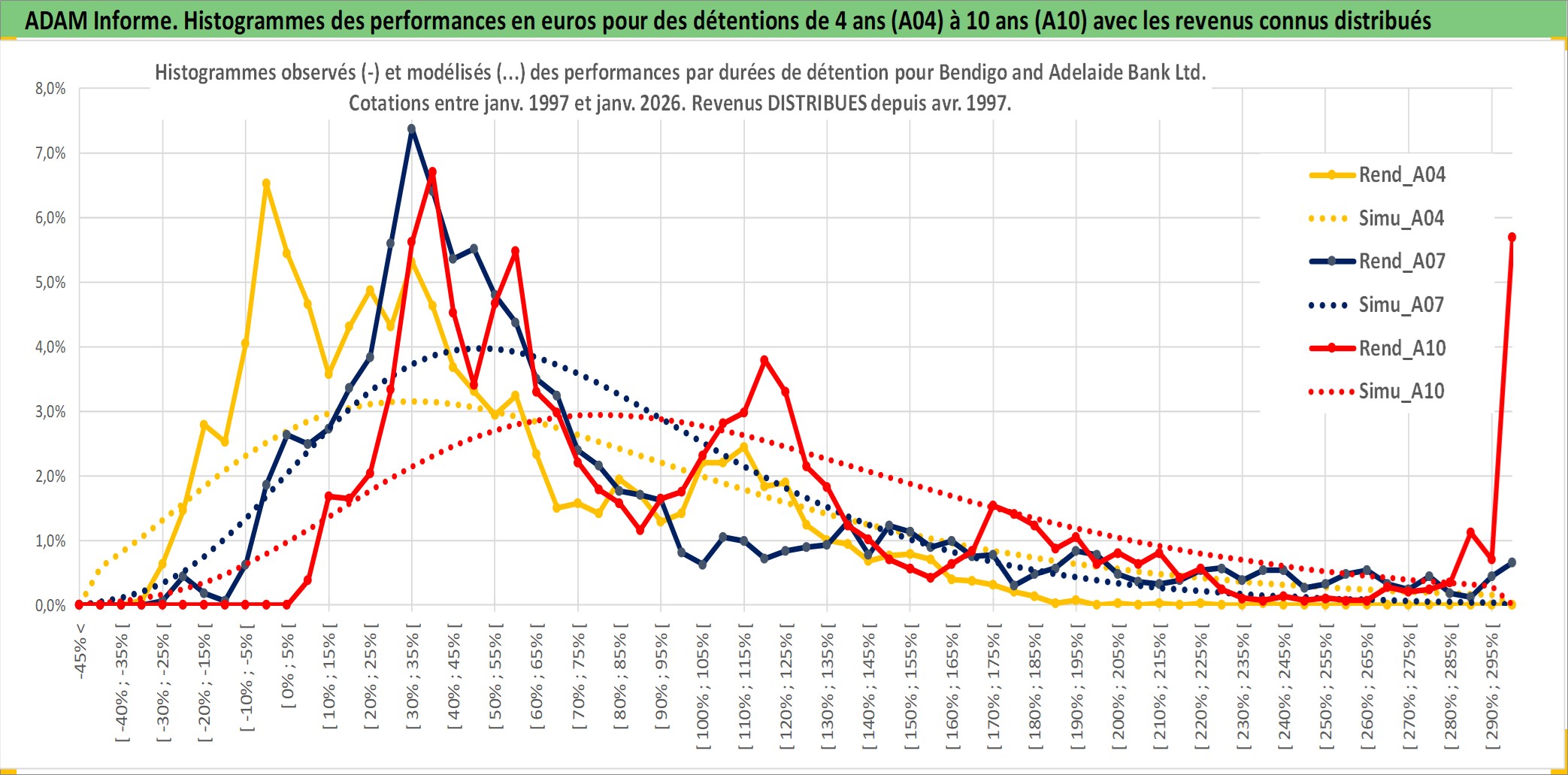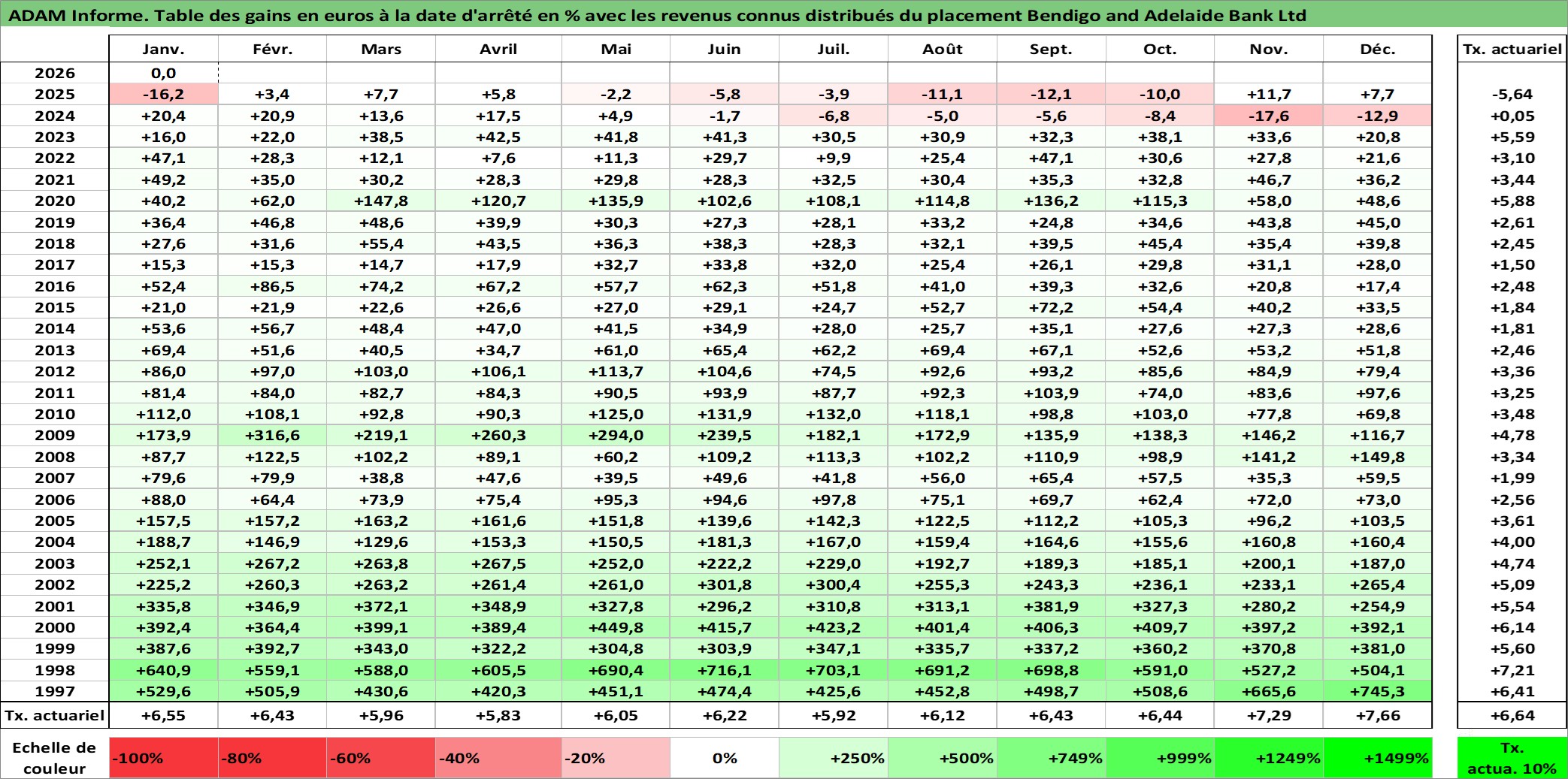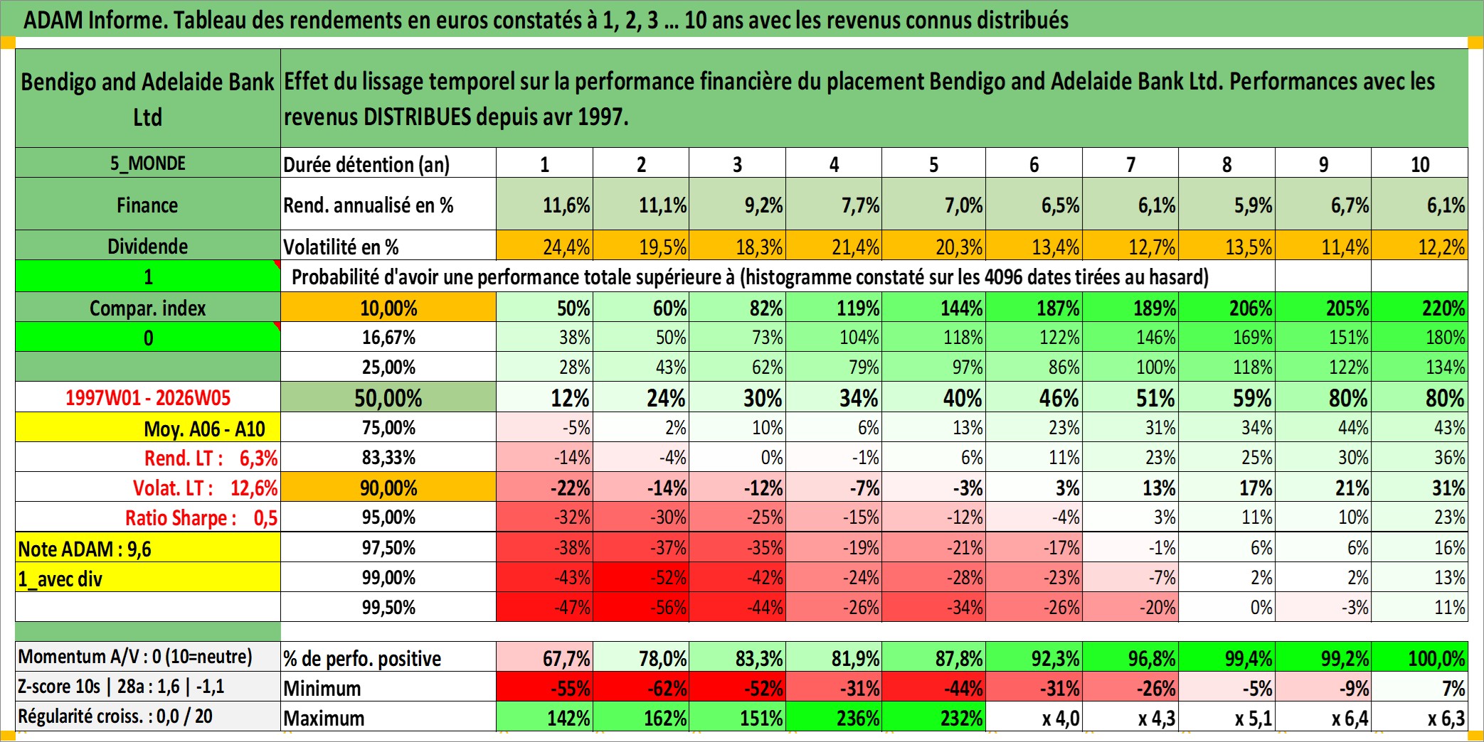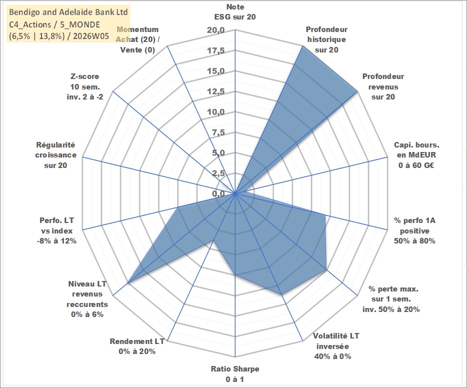 Site dédié aux investisseursPage dédiée sur site financeAnalyse des valorisations hebdomadaires de l'action Bendigo and Adelaide Bank Ltd. Cet actif est cote en AUD. Les valorisations sont en contrevaleur EURO et couvrent les semaines 1997W01 a 2026W05. Les revenus de cet actif financier sont pris en compte depuis la semaine 1997W15. La note ESG de cet actif n'est pas connue.