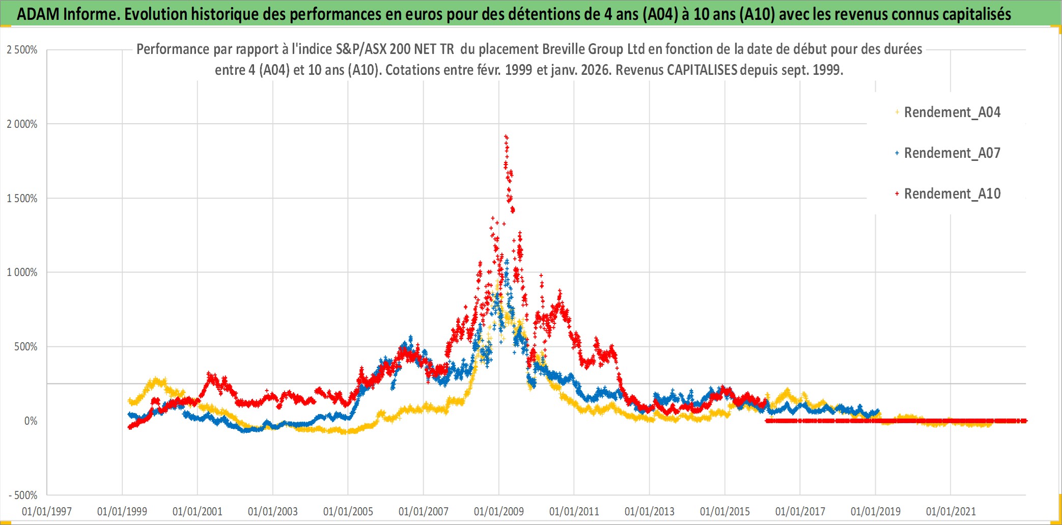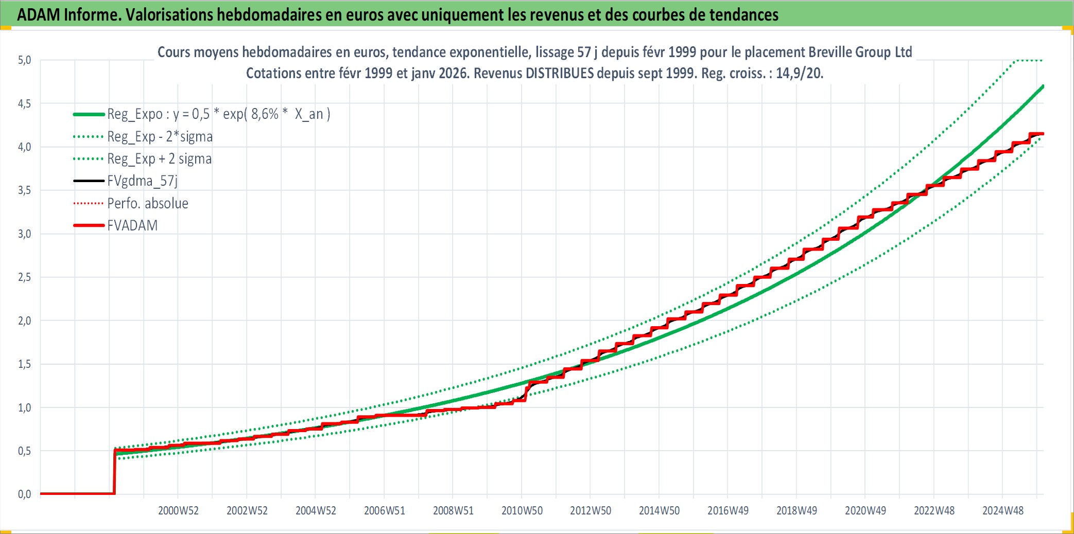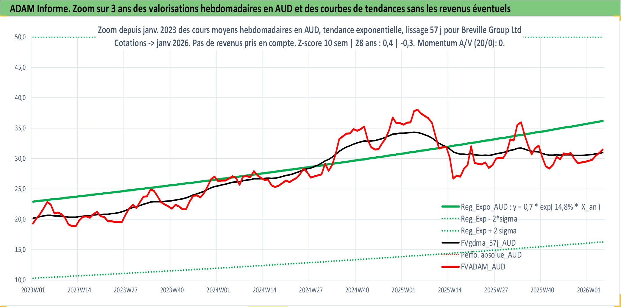 Site dédié aux investisseursPage dédiée sur site financeAnalyse des valorisations hebdomadaires de l'action Breville Group Ltd. Cet actif est cote en AUD. Les valorisations sont en contrevaleur EURO et couvrent les semaines 1999W08 a 2026W05. Les revenus de cet actif financier sont pris en compte depuis la semaine 1999W38. La note ESG de cet actif n'est pas connue.