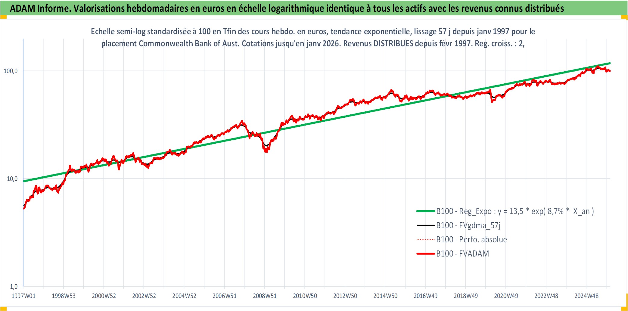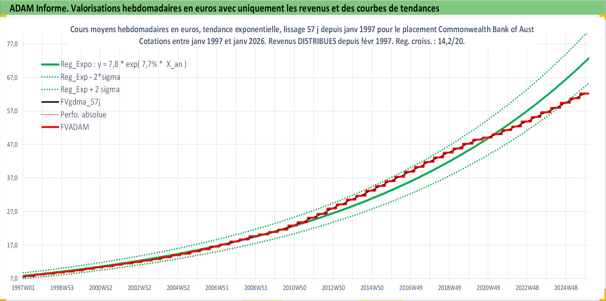 Site dédié aux investisseursPage dédiée sur site financeAnalyse des valorisations hebdomadaires de l'action Commonwealth Bank of Australia. Cet actif est cote en AUD. Les valorisations sont en contrevaleur EURO et couvrent les semaines 1997W01 a 2026W05. Les revenus de cet actif financier sont pris en compte depuis la semaine 1997W08. La note globale ESG de cet actif est estimee a 9.0 (apres rebasage entre 0 et 20).