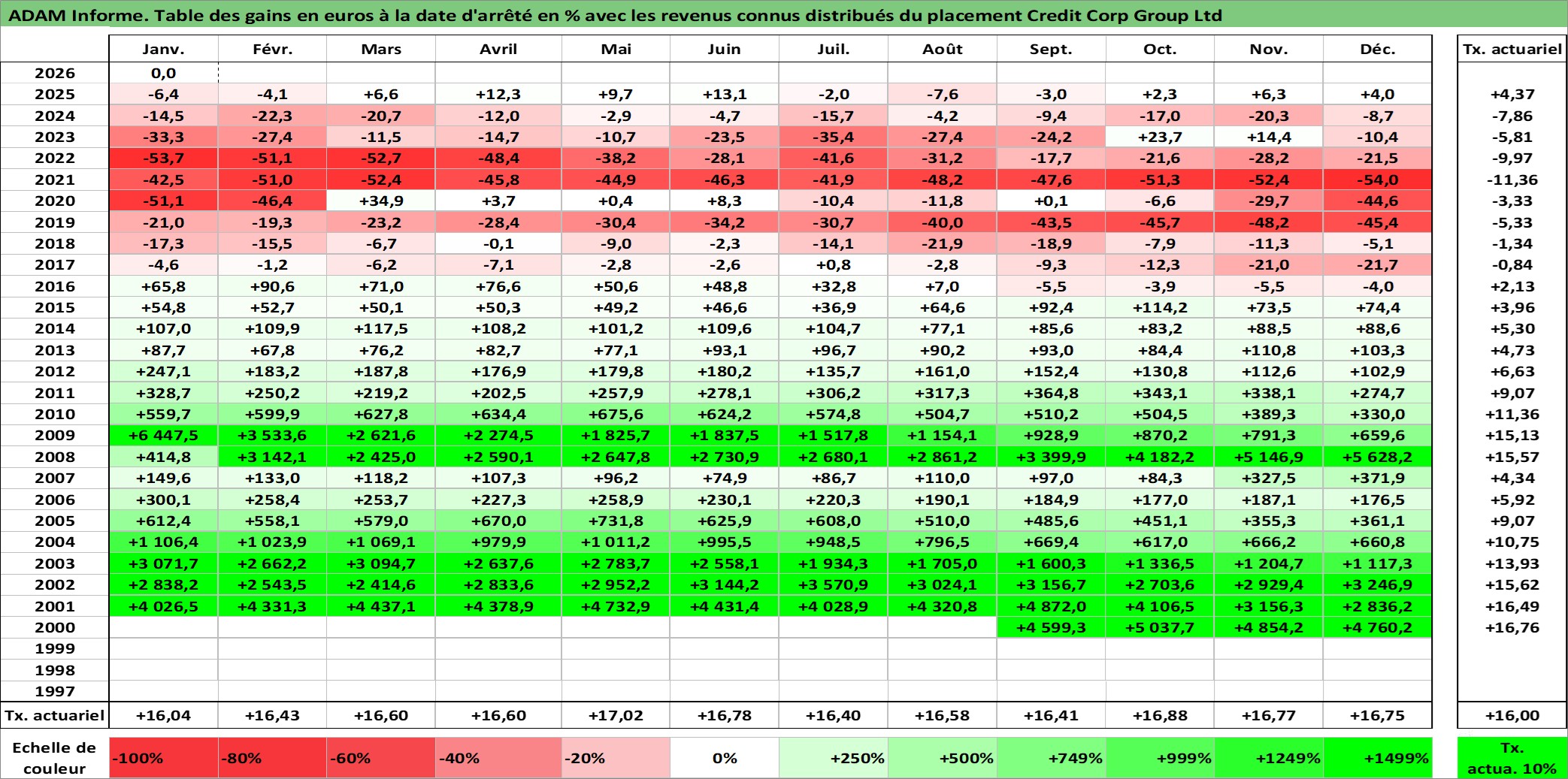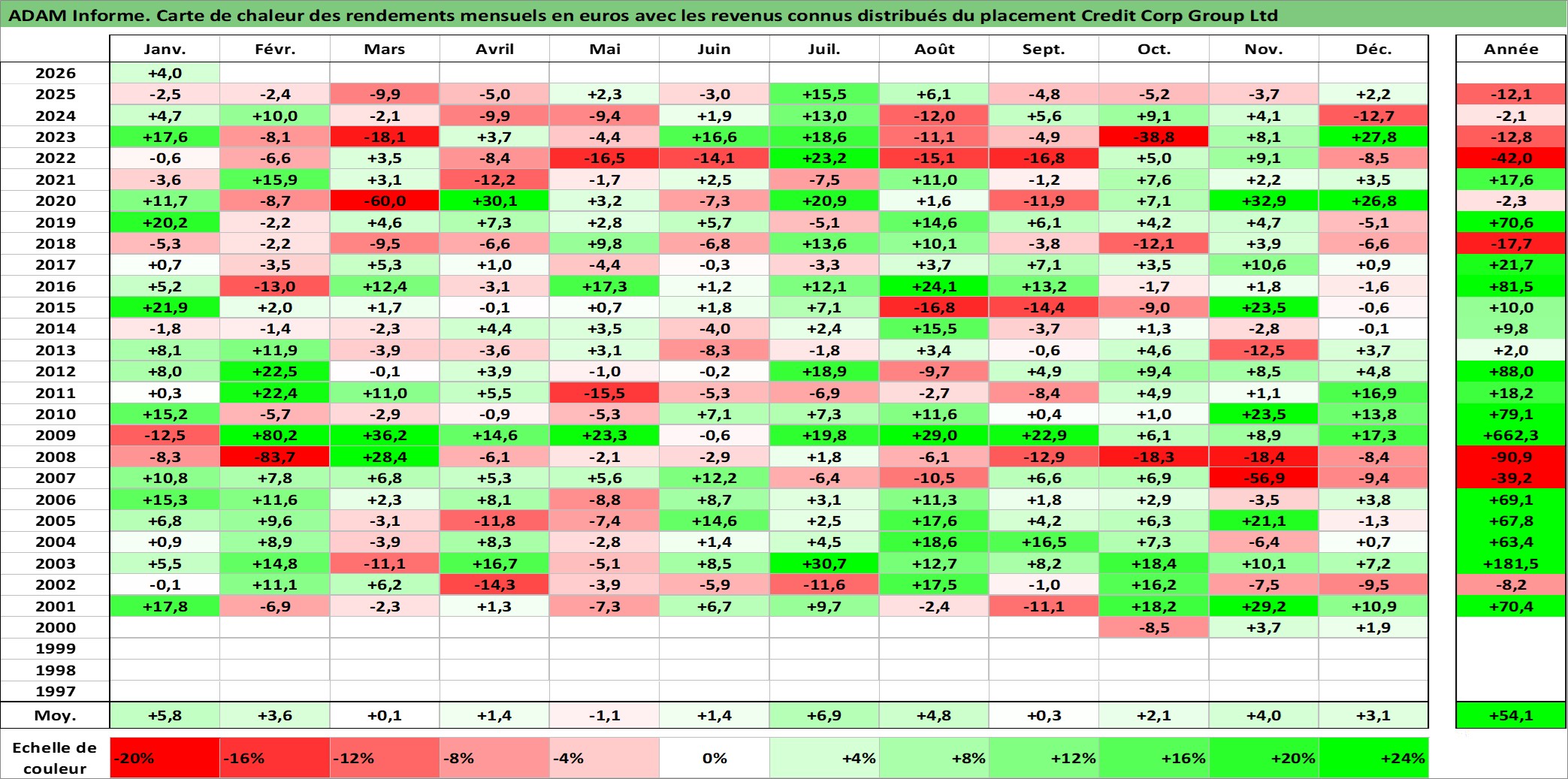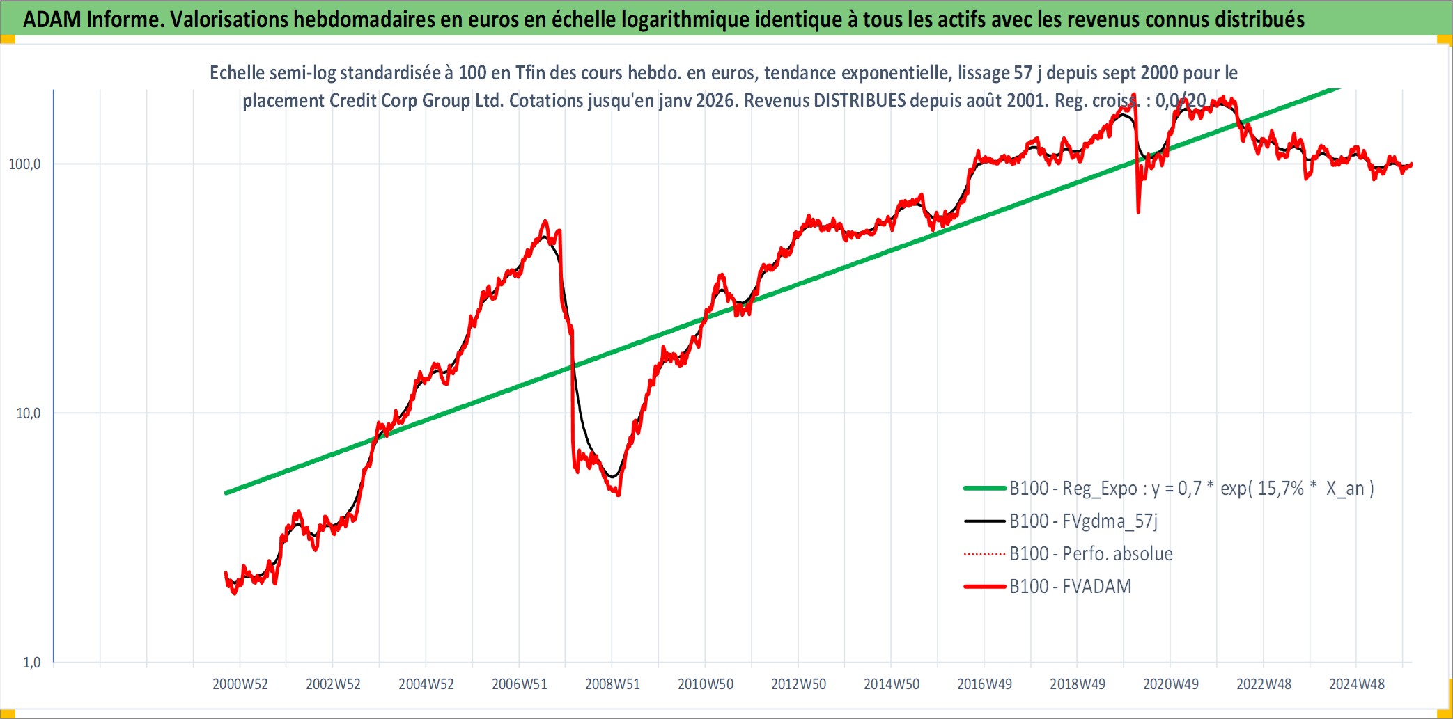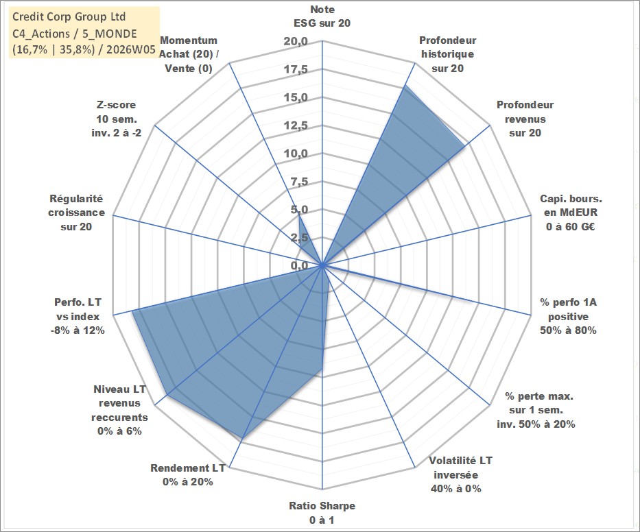 Site dédié aux investisseursPage dédiée sur site financeAnalyse des valorisations hebdomadaires de l'action Credit Corp Group Ltd. Cet actif est cote en AUD. Les valorisations sont en contrevaleur EURO et couvrent les semaines 2000W36 a 2026W05. Les revenus de cet actif financier sont pris en compte depuis la semaine 2001W33. La note ESG de cet actif n'est pas connue.