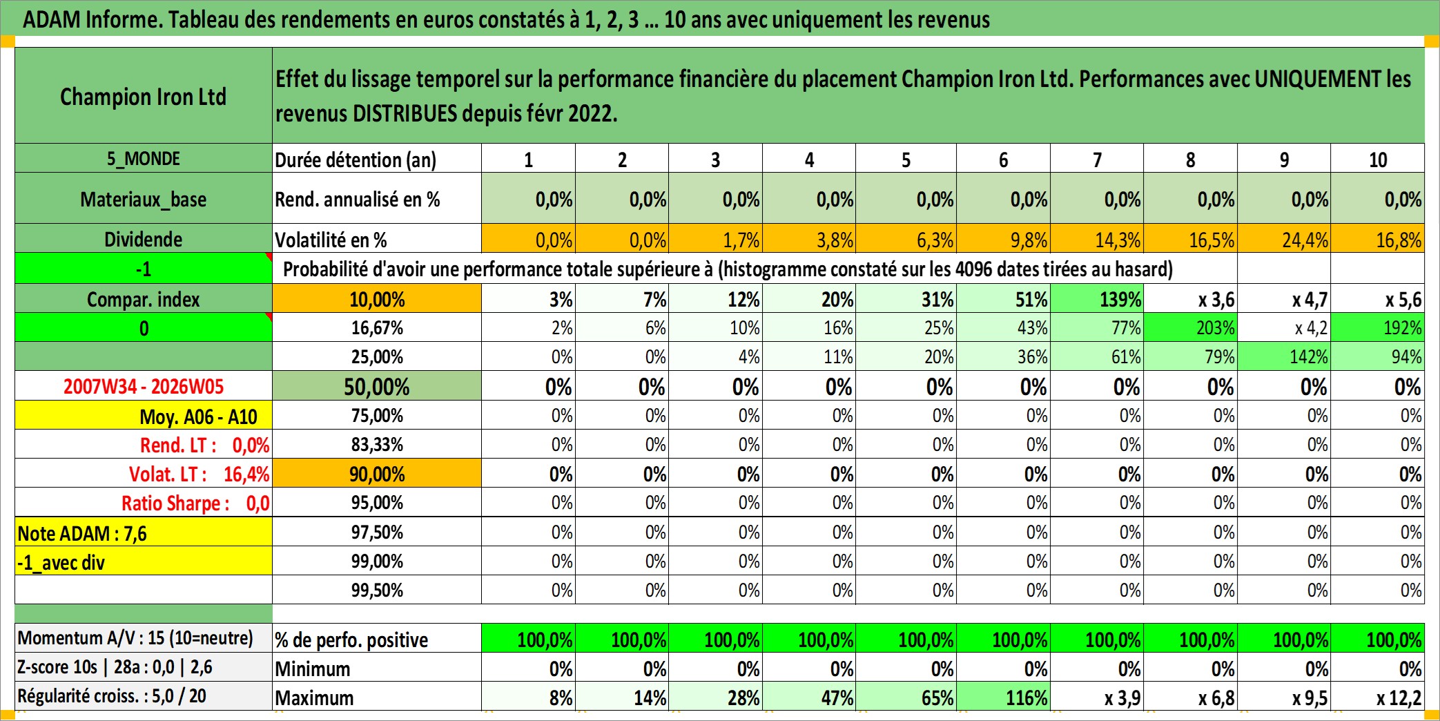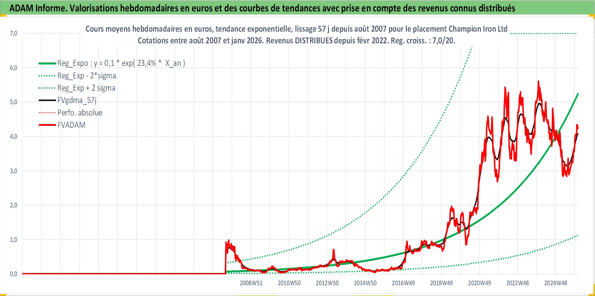 Site dédié aux investisseursPage dédiée sur site financeAnalyse des valorisations hebdomadaires de l'action Champion Iron Ltd. Cet actif est cote en AUD. Les valorisations sont en contrevaleur EURO et couvrent les semaines 2007W34 a 2026W05. Les revenus de cet actif financier sont pris en compte depuis la semaine 2022W05. La note ESG de cet actif n'est pas connue.