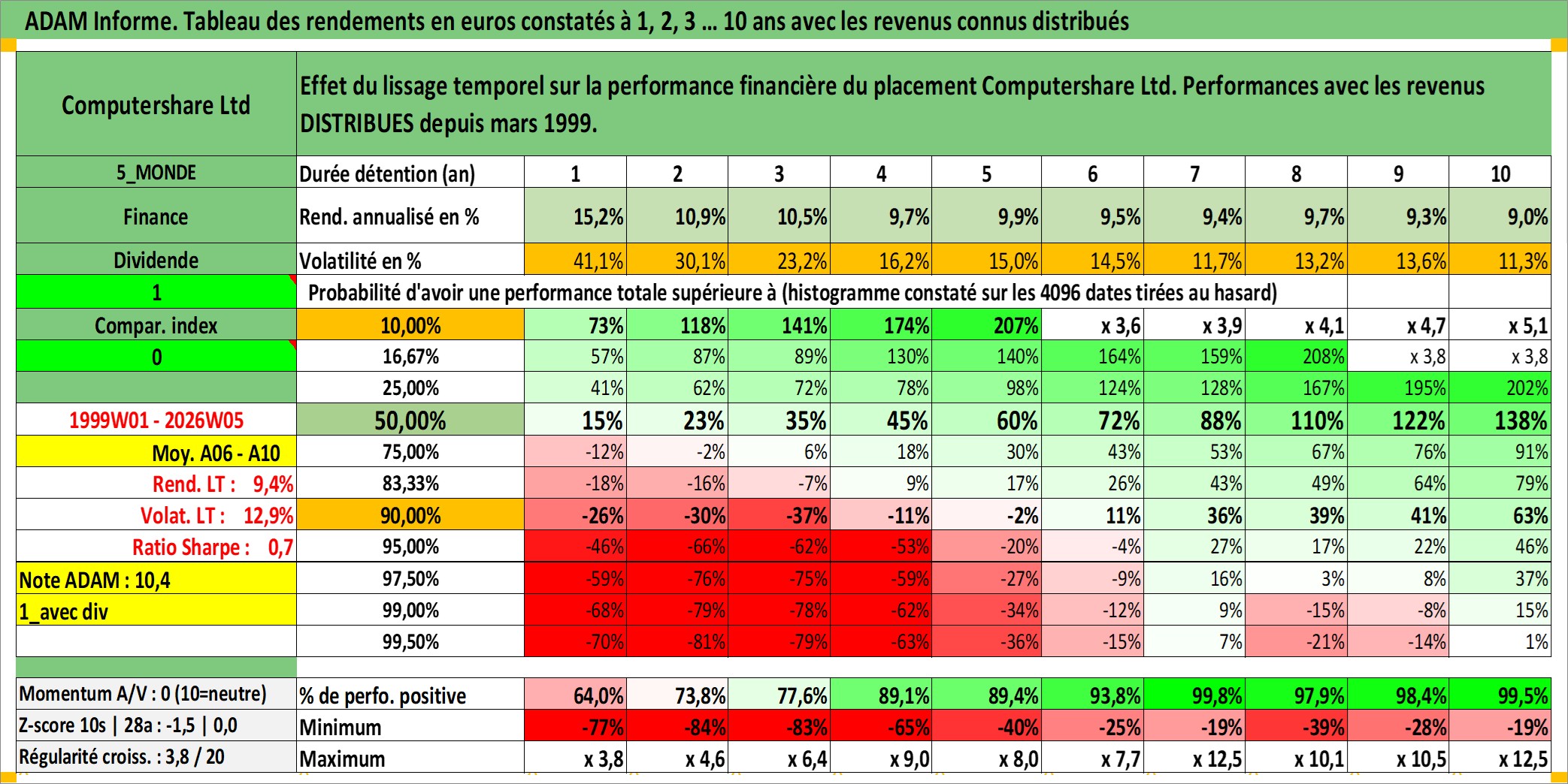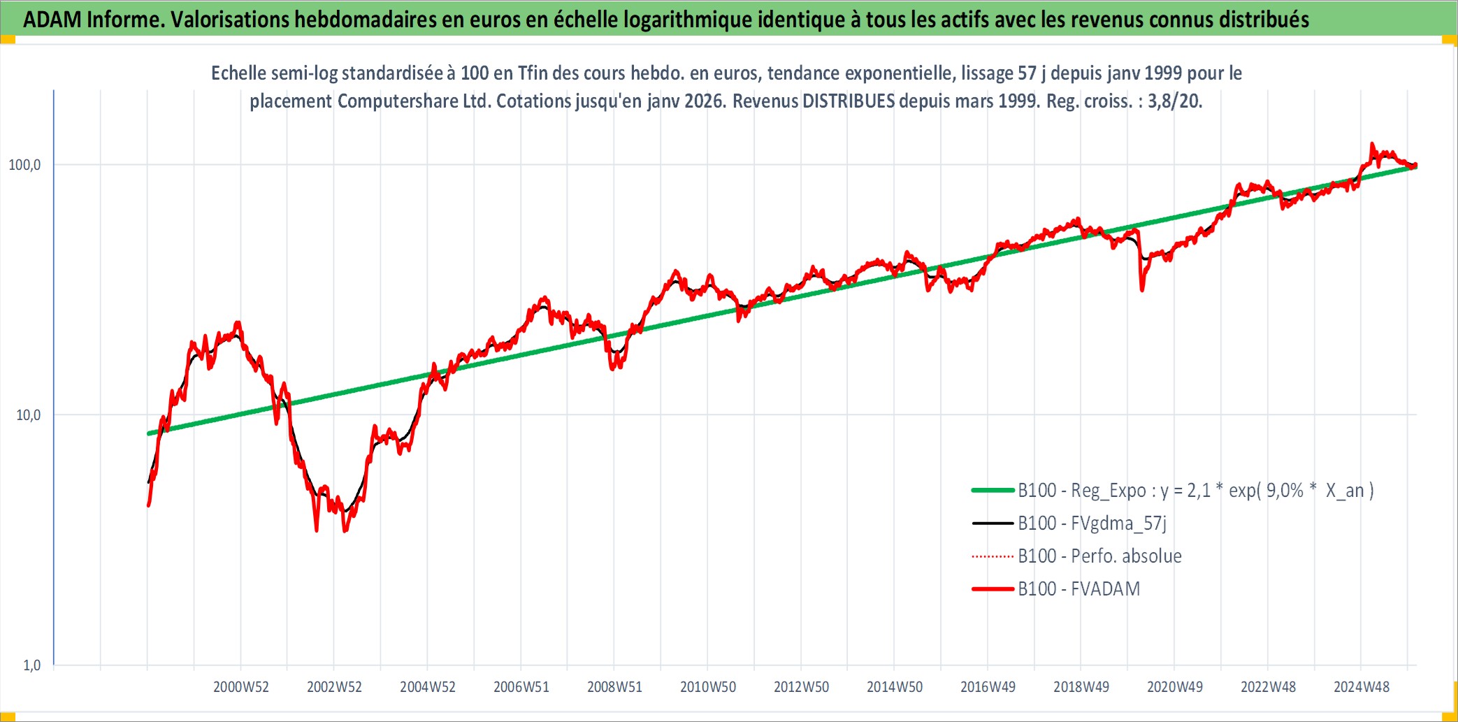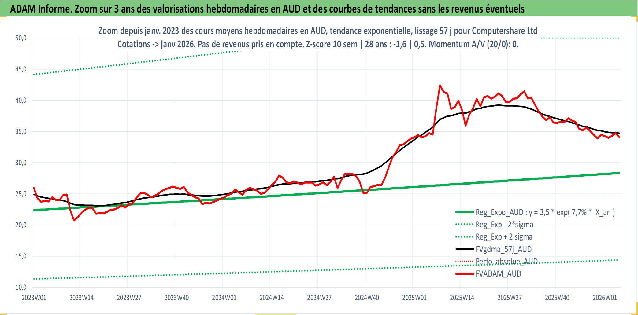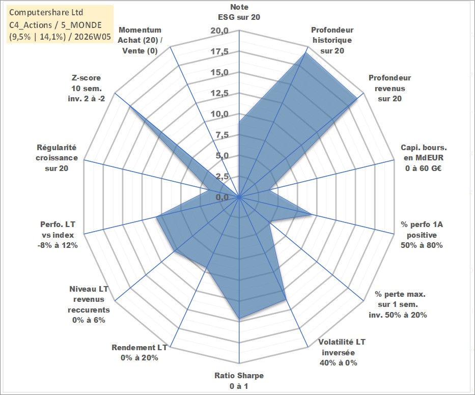 Site dédié aux investisseursPage dédiée sur site financeAnalyse des valorisations hebdomadaires de l'action Computershare Ltd. Cet actif est cote en AUD. Les valorisations sont en contrevaleur EURO et couvrent les semaines 1999W01 a 2026W05. Les revenus de cet actif financier sont pris en compte depuis la semaine 1999W10. La note globale ESG de cet actif est estimee a 9.0 (apres rebasage entre 0 et 20).