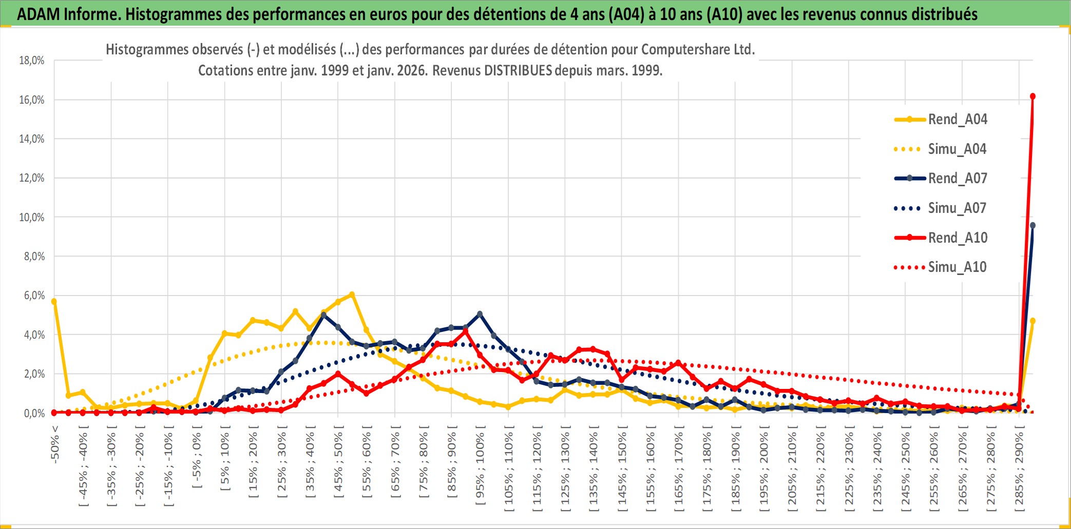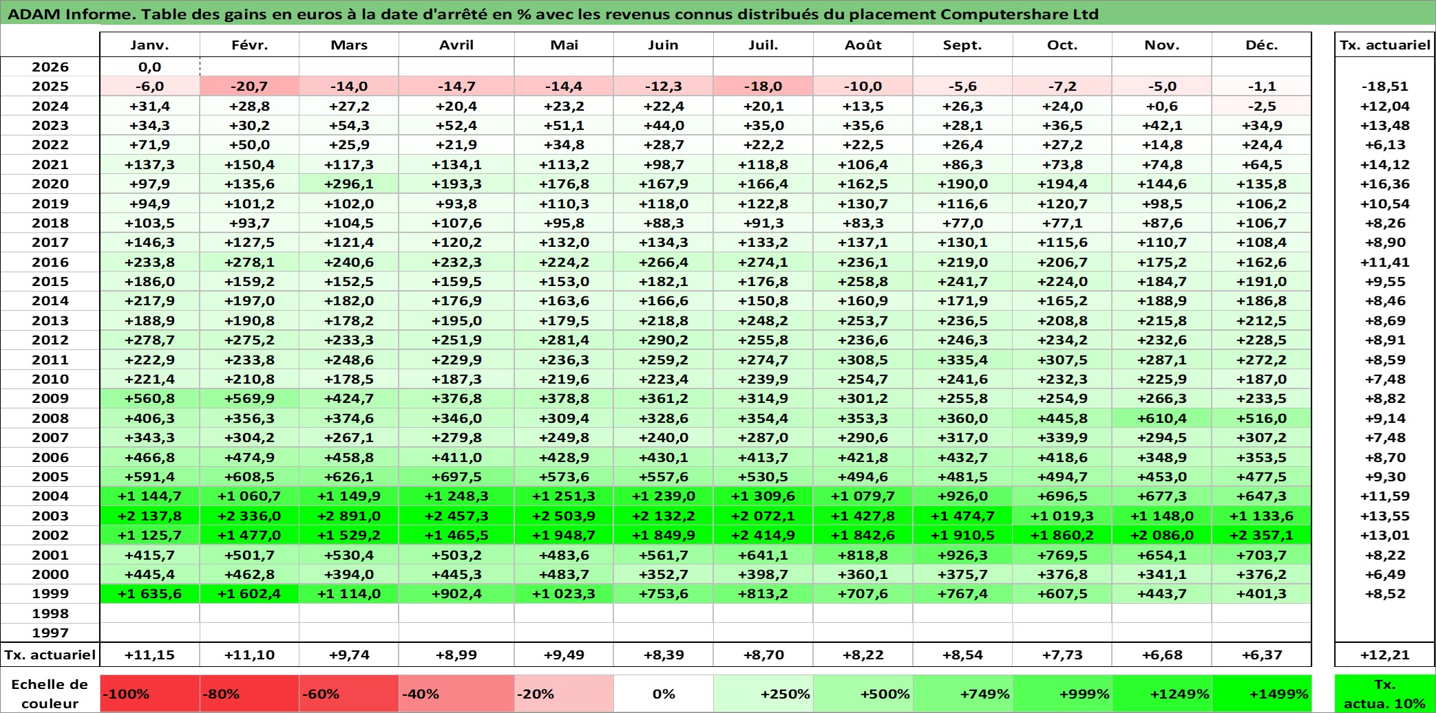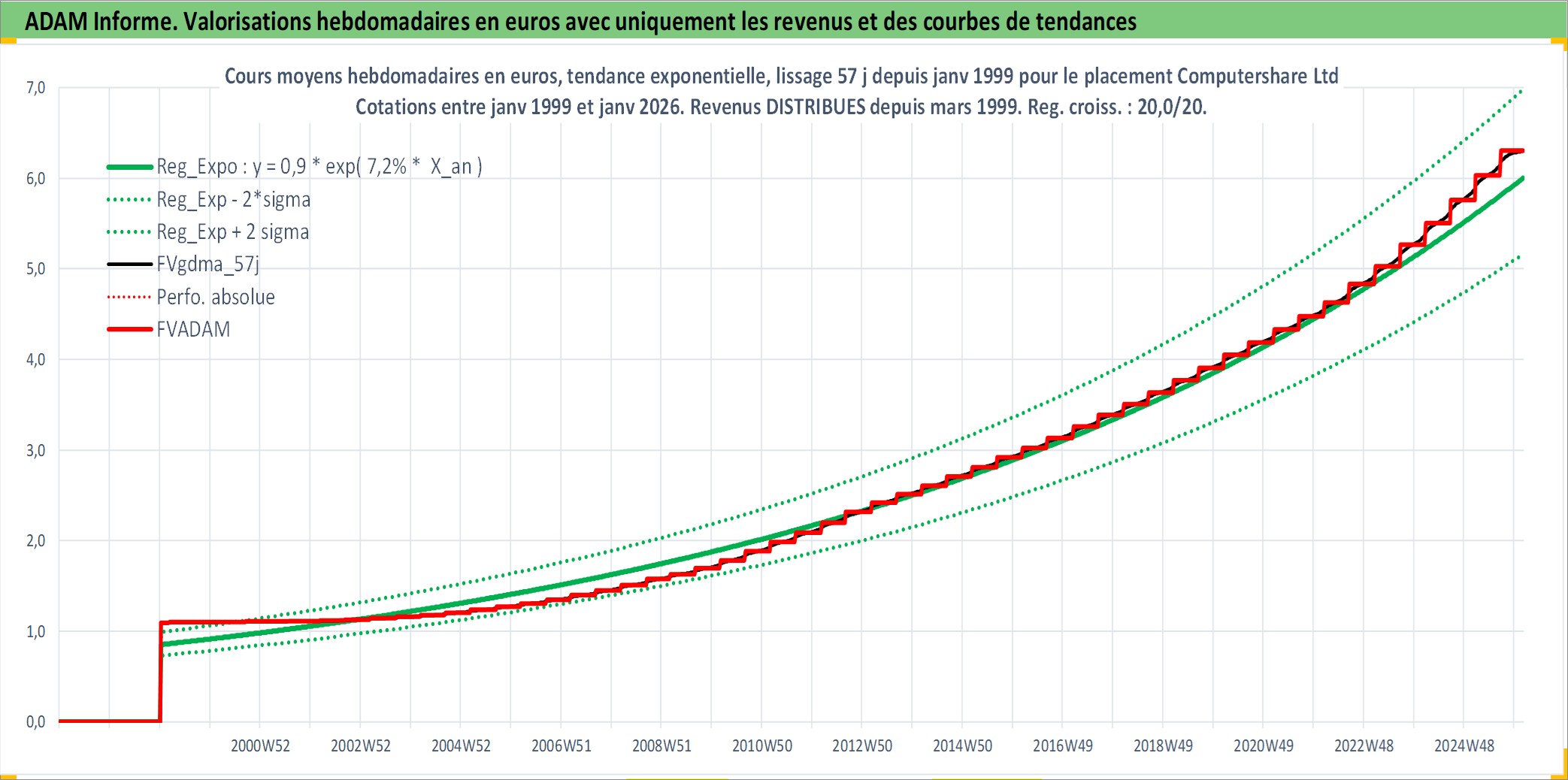 Site dédié aux investisseursPage dédiée sur site financeAnalyse des valorisations hebdomadaires de l'action Computershare Ltd. Cet actif est cote en AUD. Les valorisations sont en contrevaleur EURO et couvrent les semaines 1999W01 a 2026W05. Les revenus de cet actif financier sont pris en compte depuis la semaine 1999W10. La note globale ESG de cet actif est estimee a 9.0 (apres rebasage entre 0 et 20).