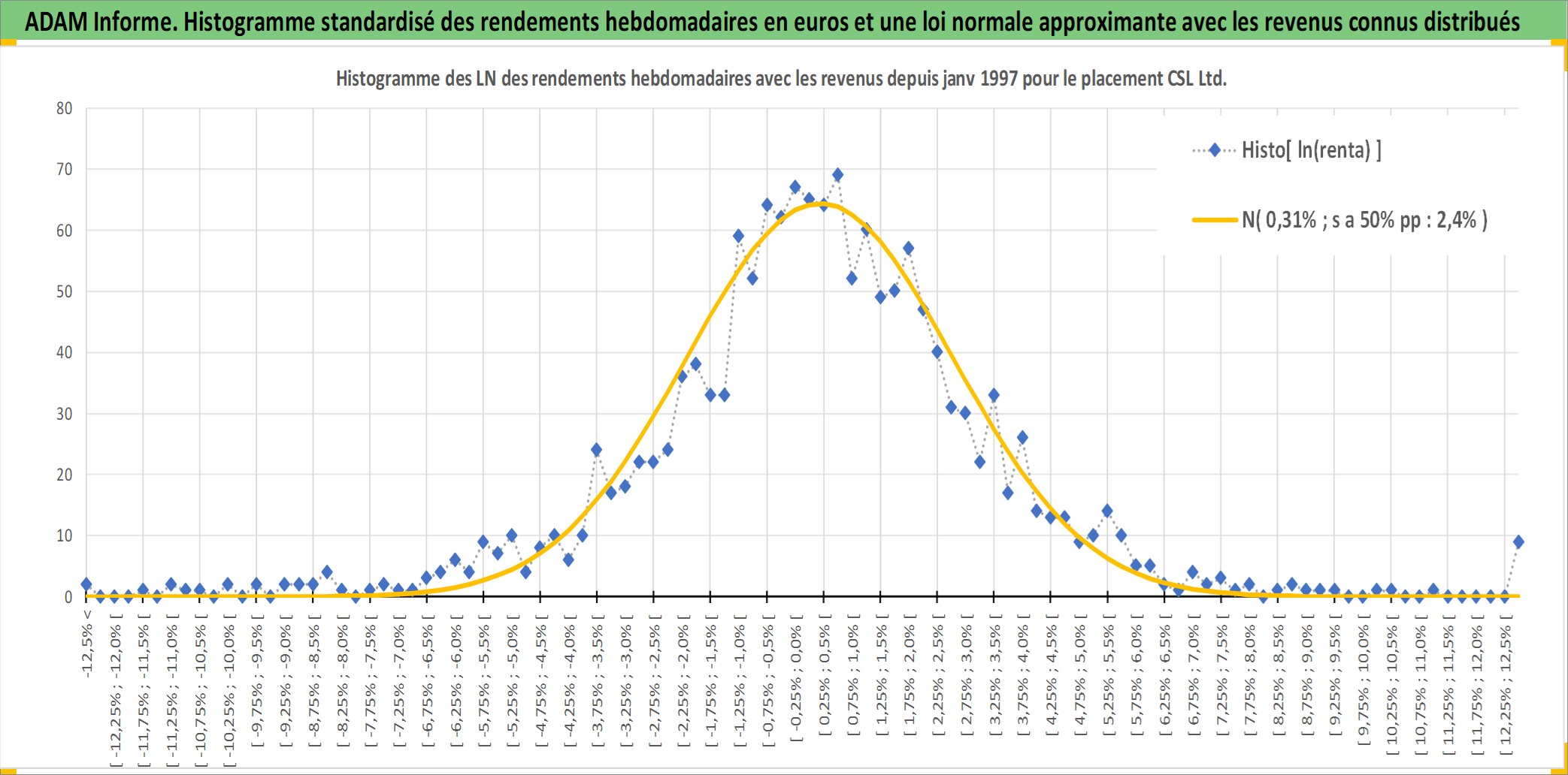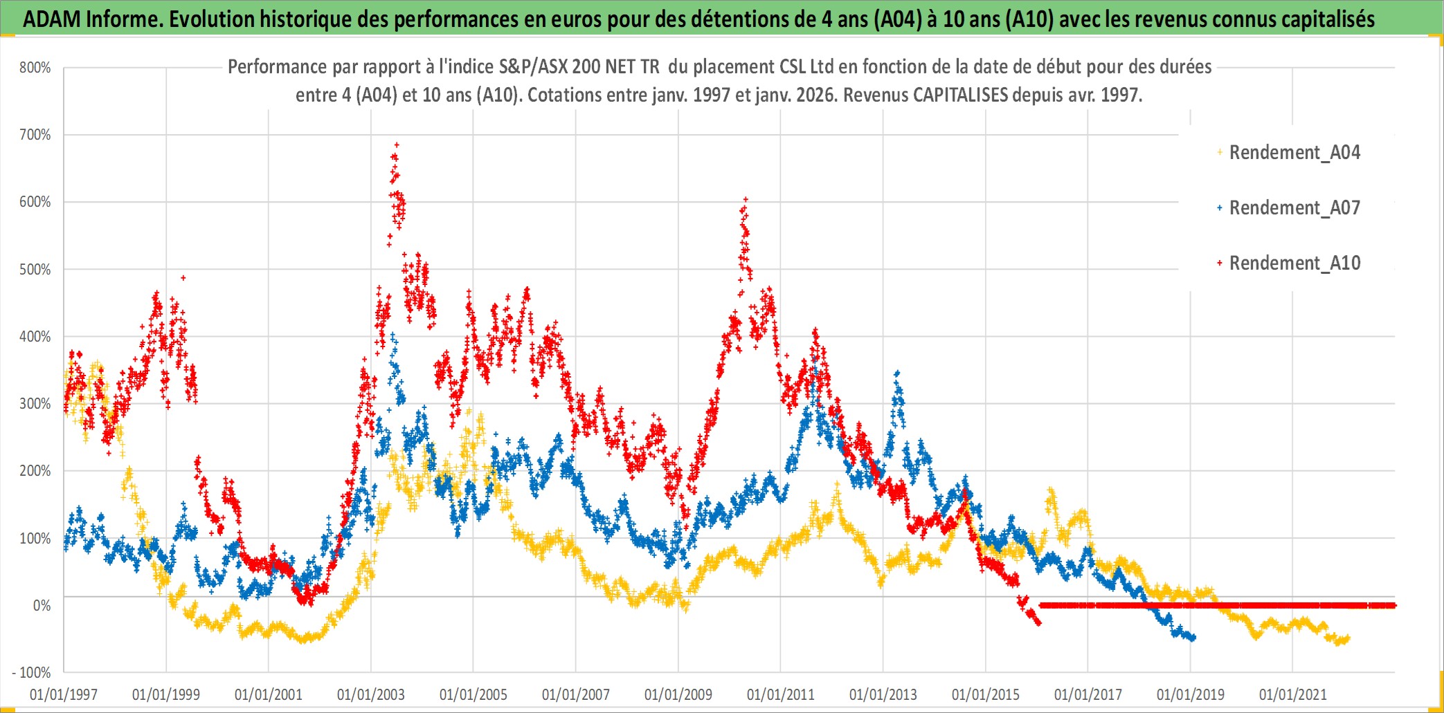 Site dédié aux investisseursPage dédiée sur site financeAnalyse des valorisations hebdomadaires de l'action CSL Ltd. Cet actif est cote en AUD. Les valorisations sont en contrevaleur EURO et couvrent les semaines 1997W01 a 2026W05. Les revenus de cet actif financier sont pris en compte depuis la semaine 1997W15. La note globale ESG de cet actif est estimee a 8.0 (apres rebasage entre 0 et 20).