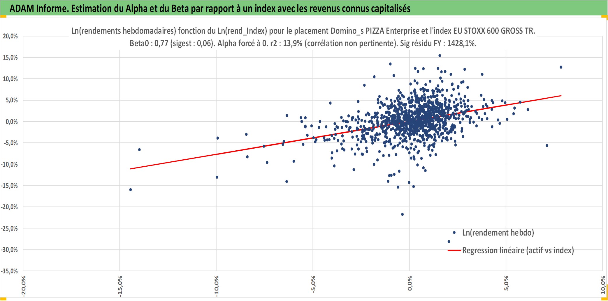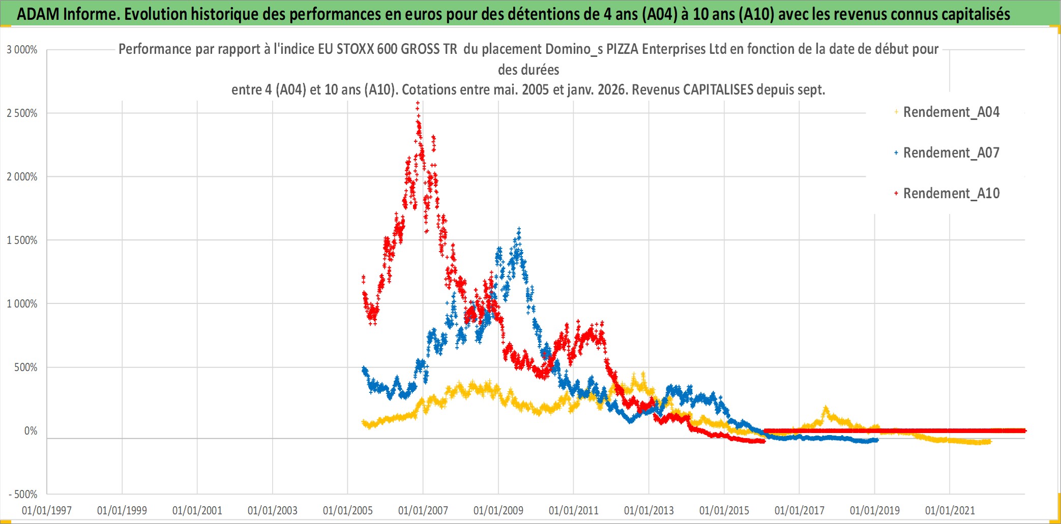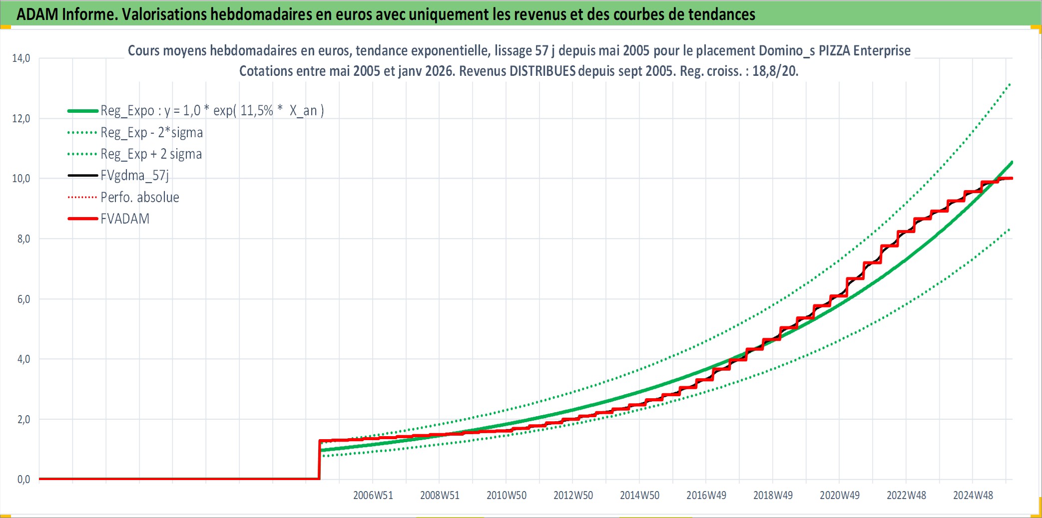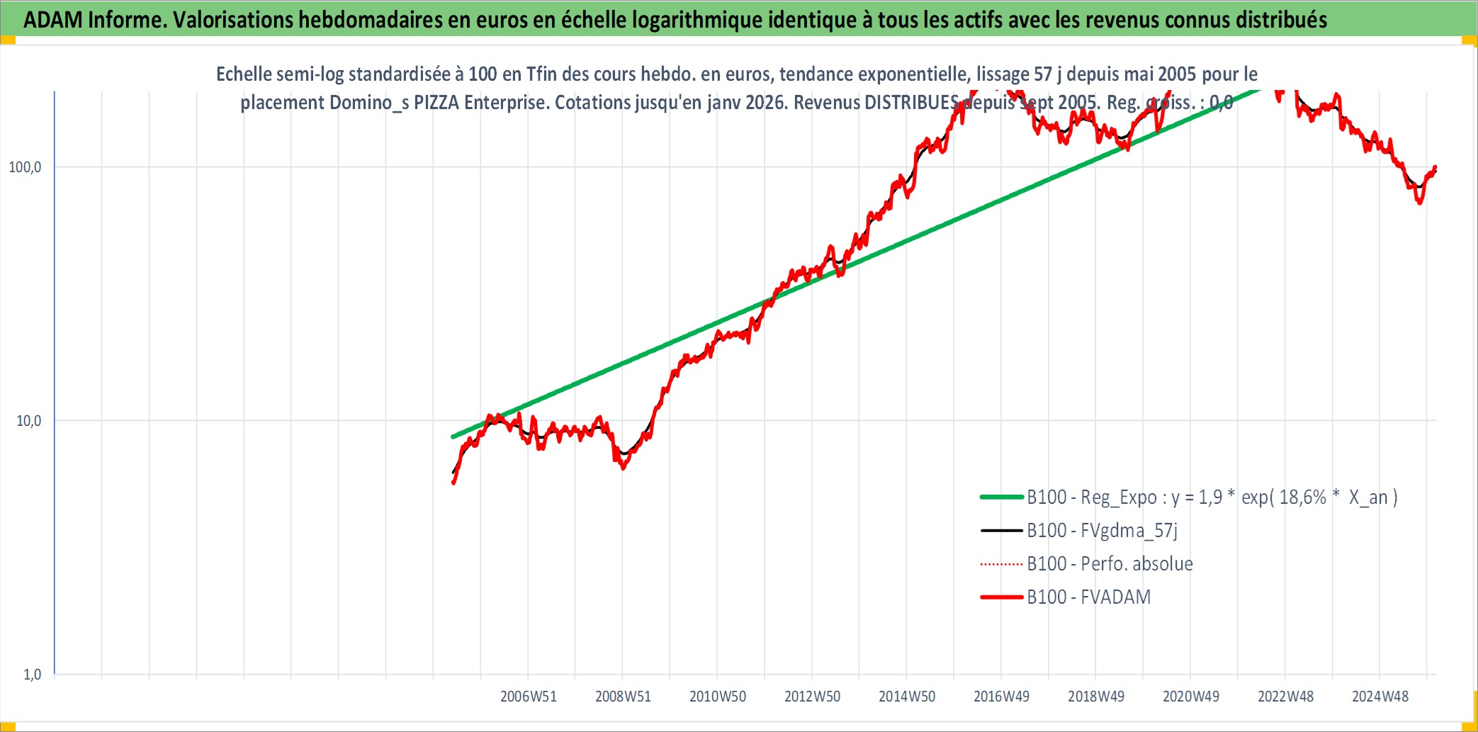 Site dédié aux investisseursPage dédiée sur site financeAnalyse des valorisations hebdomadaires de l'action Domino_s PIZZA Enterprises Ltd. Cet actif est cote en AUD. Les valorisations sont en contrevaleur EURO et couvrent les semaines 2005W20 a 2026W05. Les revenus de cet actif financier sont pris en compte depuis la semaine 2005W39. La note ESG de cet actif n'est pas connue.