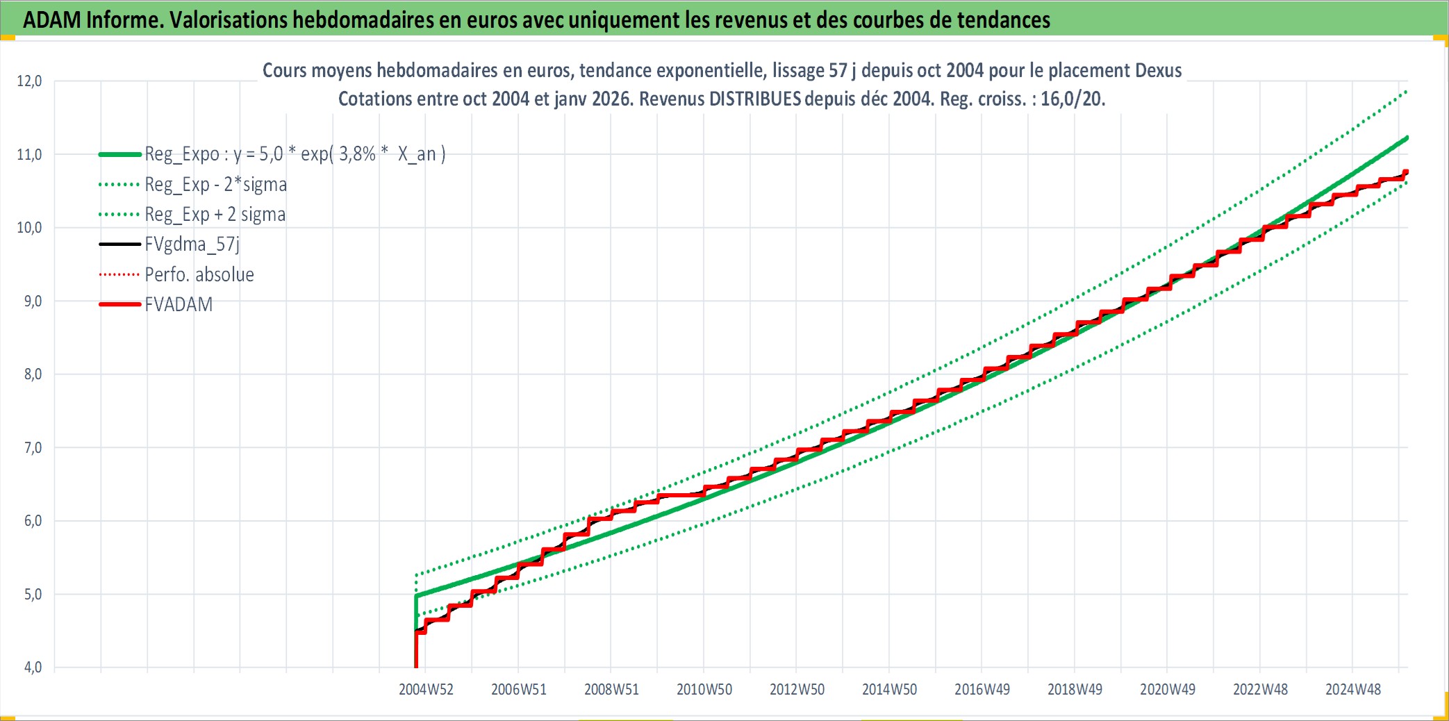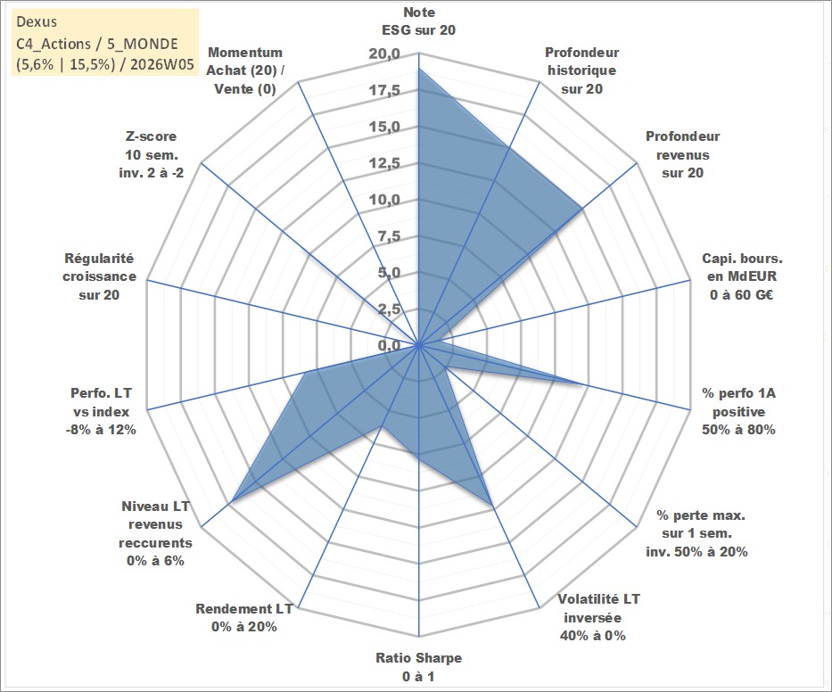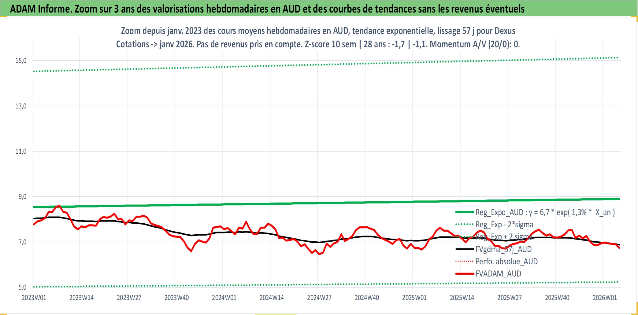 Site dédié aux investisseursPage dédiée sur site financeAnalyse des valorisations hebdomadaires de l'action Dexus. Cet actif est cote en AUD. Les valorisations sont en contrevaleur EURO et couvrent les semaines 2004W41 a 2026W05. Les revenus de cet actif financier sont pris en compte depuis la semaine 2004W52. La note globale ESG de cet actif est estimee a 19.0 (apres rebasage entre 0 et 20).