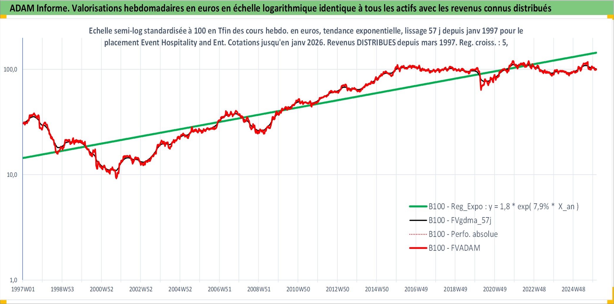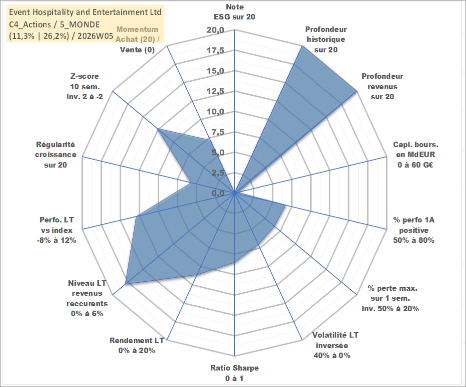 Site dédié aux investisseursPage dédiée sur site financeAnalyse des valorisations hebdomadaires de l'action Event Hospitality and Entertainment Ltd. Cet actif est cote en AUD. Les valorisations sont en contrevaleur EURO et couvrent les semaines 1997W01 a 2026W05. Les revenus de cet actif financier sont pris en compte depuis la semaine 1997W12. La note ESG de cet actif n'est pas connue.