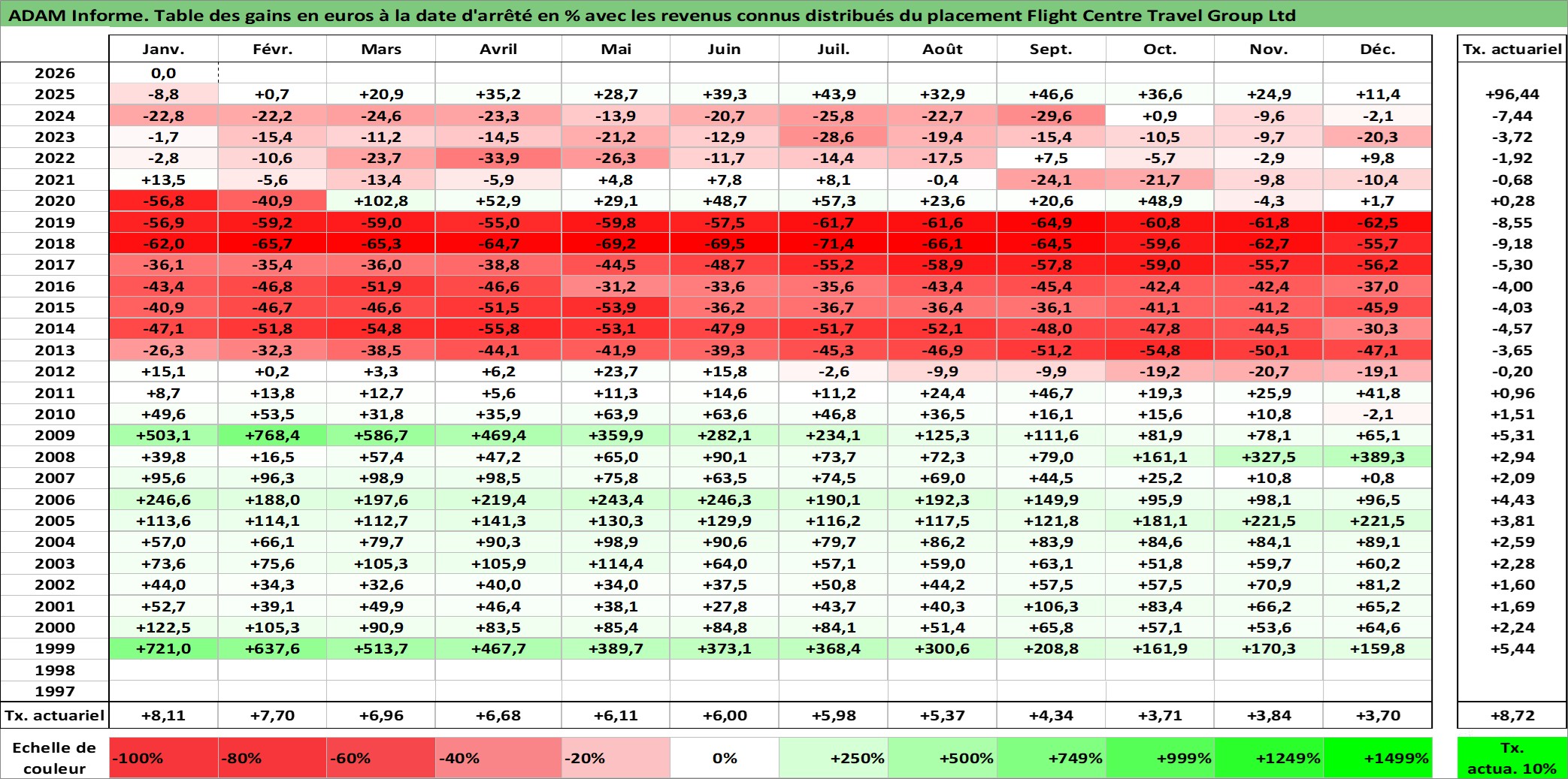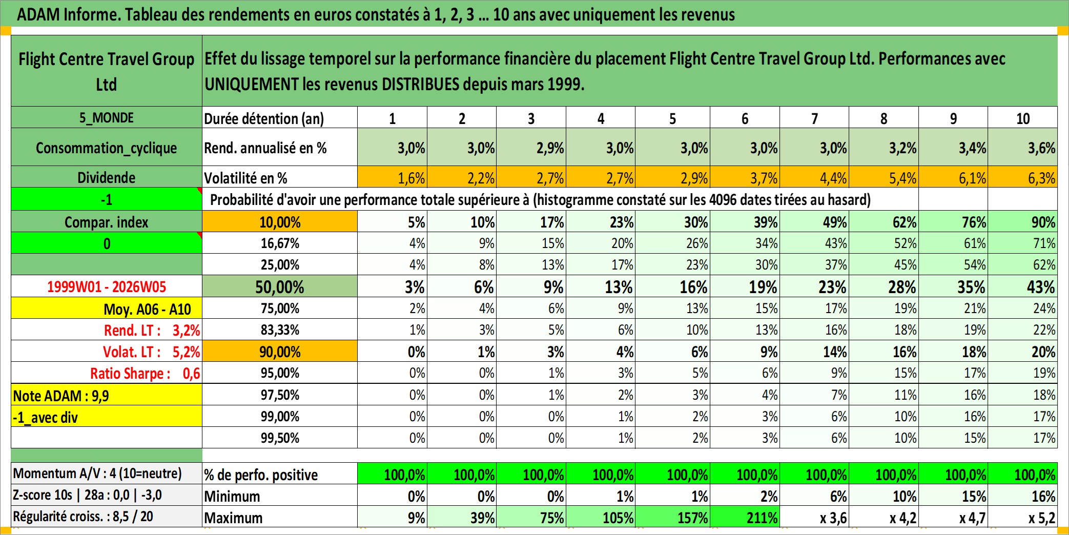 Site dédié aux investisseursPage dédiée sur site financeAnalyse des valorisations hebdomadaires de l'action Flight Centre Travel Group Ltd. Cet actif est cote en AUD. Les valorisations sont en contrevaleur EURO et couvrent les semaines 1999W01 a 2026W05. Les revenus de cet actif financier sont pris en compte depuis la semaine 1999W12. La note ESG de cet actif n'est pas connue.