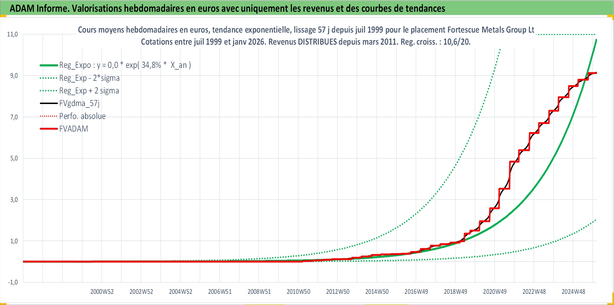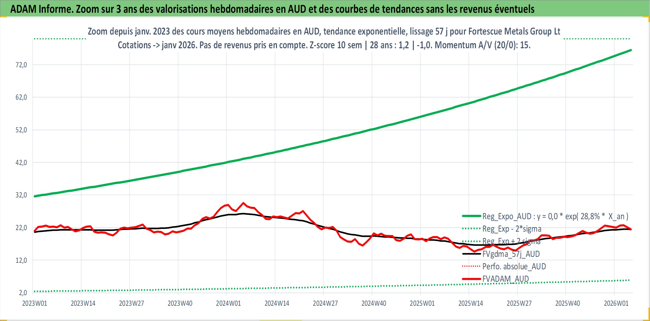 Site dédié aux investisseursPage dédiée sur site financeAnalyse des valorisations hebdomadaires de l'action Fortescue Metals Group Ltd. Cet actif est cote en AUD. Les valorisations sont en contrevaleur EURO et couvrent les semaines 1999W30 a 2026W05. Les revenus de cet actif financier sont pris en compte depuis la semaine 2011W10. La note globale ESG de cet actif est estimee a 7.0 (apres rebasage entre 0 et 20).