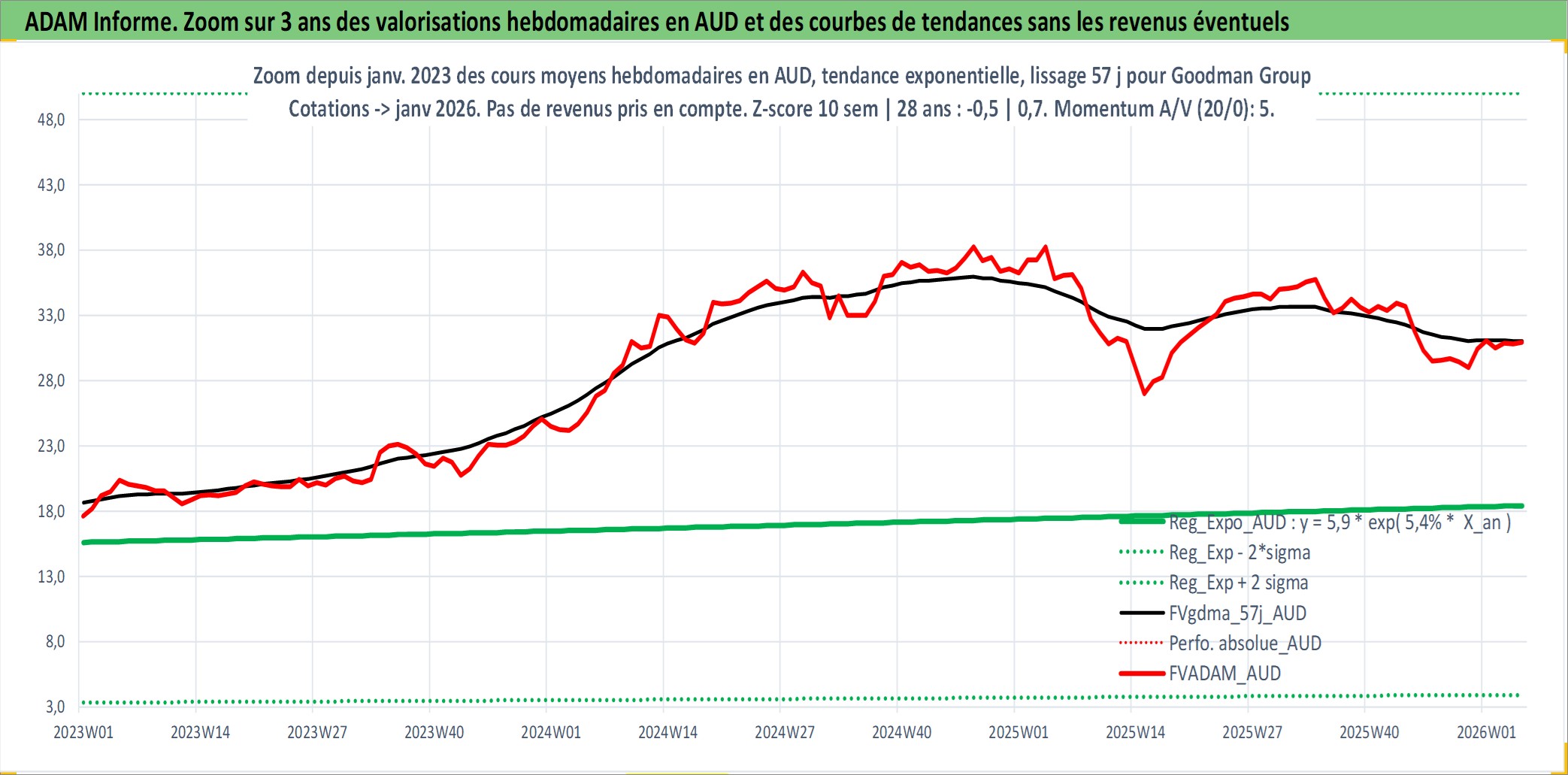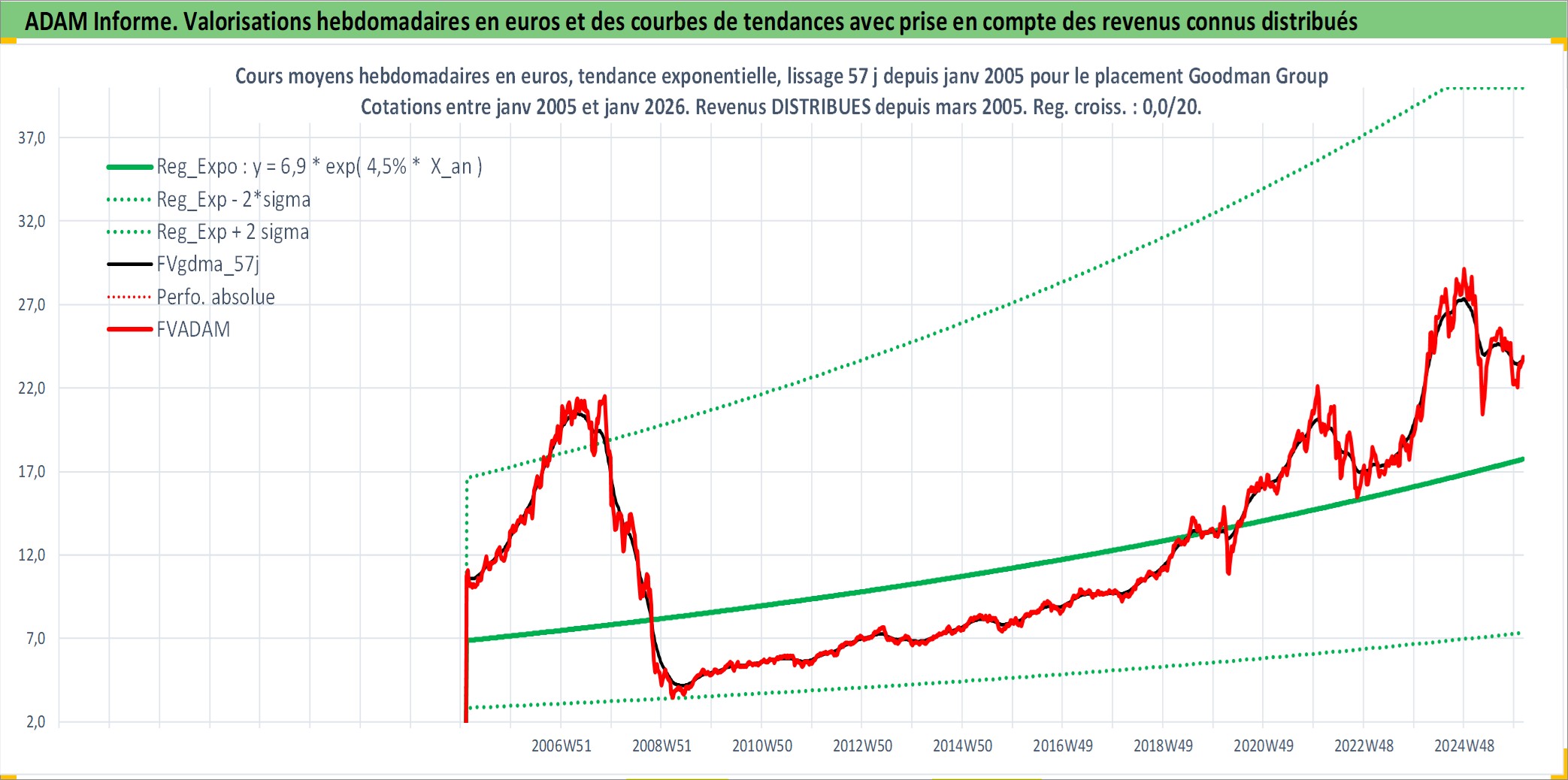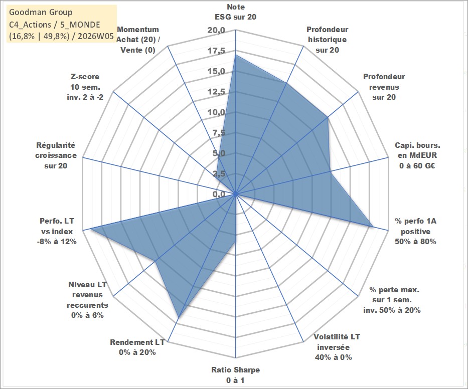 Site dédié aux investisseursPage dédiée sur site financeAnalyse des valorisations hebdomadaires de l'action Goodman Group. Cet actif est cote en AUD. Les valorisations sont en contrevaleur EURO et couvrent les semaines 2005W05 a 2026W05. Les revenus de cet actif financier sont pris en compte depuis la semaine 2005W12. La note globale ESG de cet actif est estimee a 17.0 (apres rebasage entre 0 et 20).