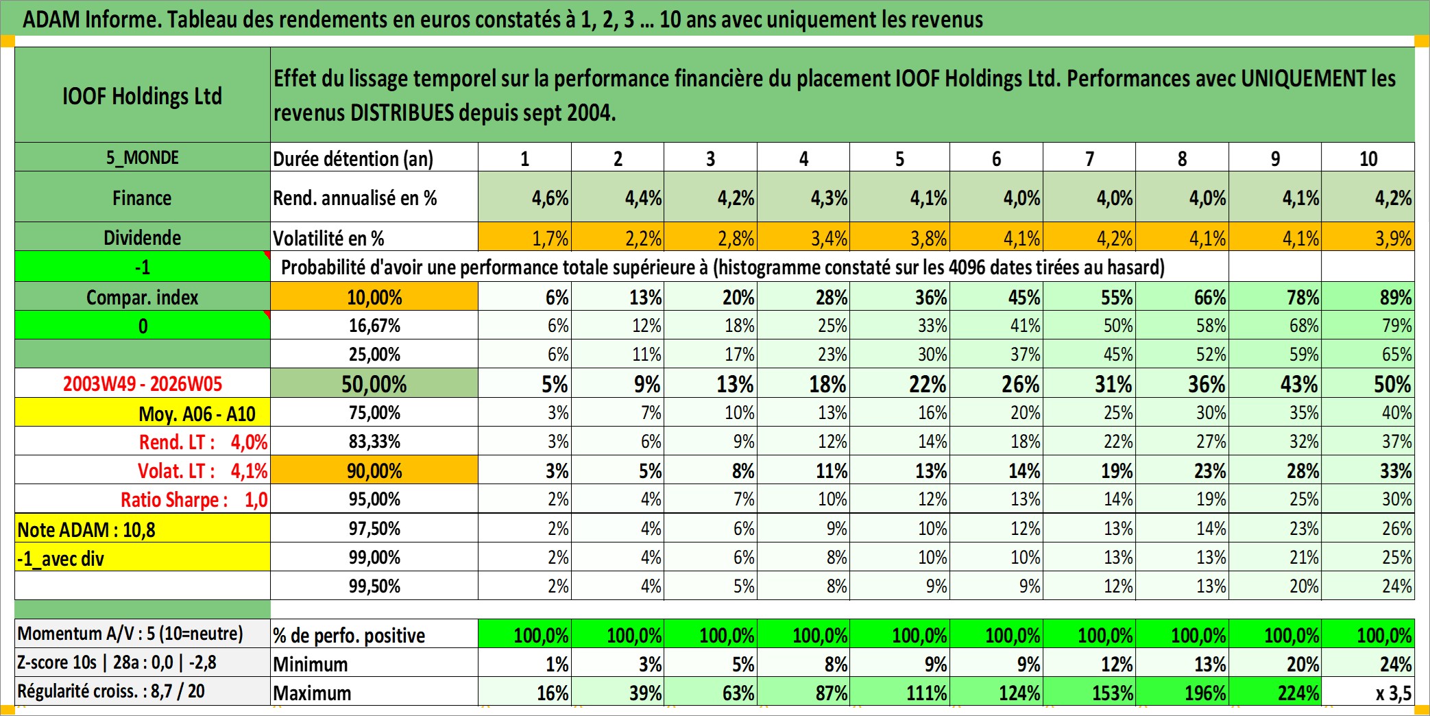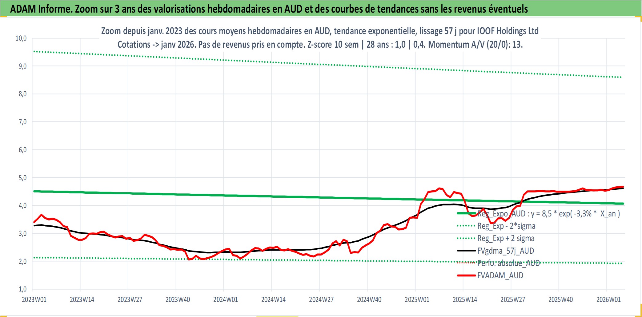 Site dédié aux investisseursPage dédiée sur site financeAnalyse des valorisations hebdomadaires de l'action IOOF Holdings Ltd. Cet actif est cote en AUD. Les valorisations sont en contrevaleur EURO et couvrent les semaines 2003W49 a 2026W05. Les revenus de cet actif financier sont pris en compte depuis la semaine 2004W40. La note ESG de cet actif n'est pas connue.