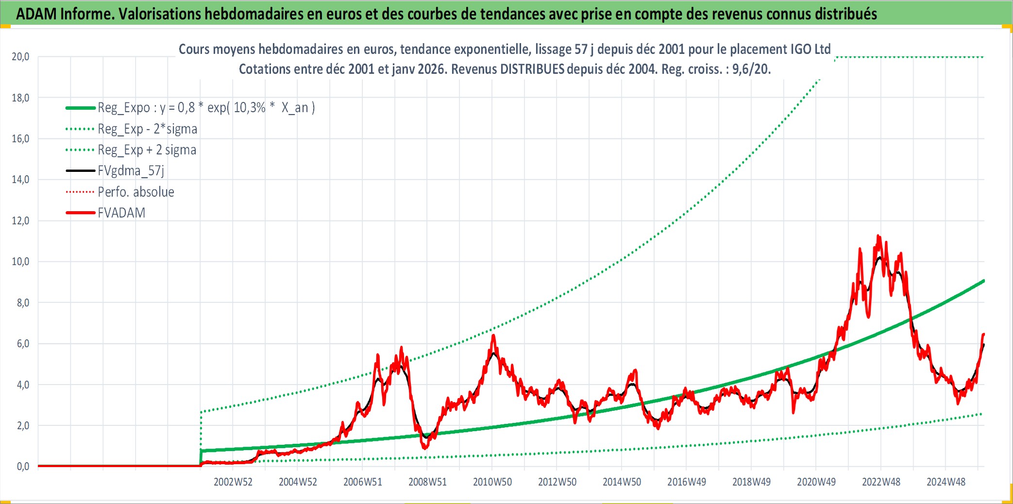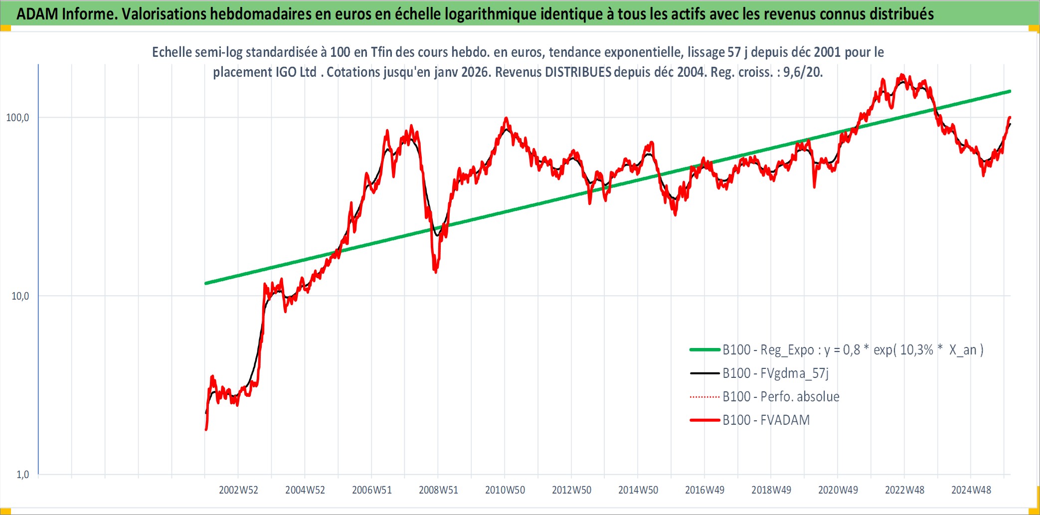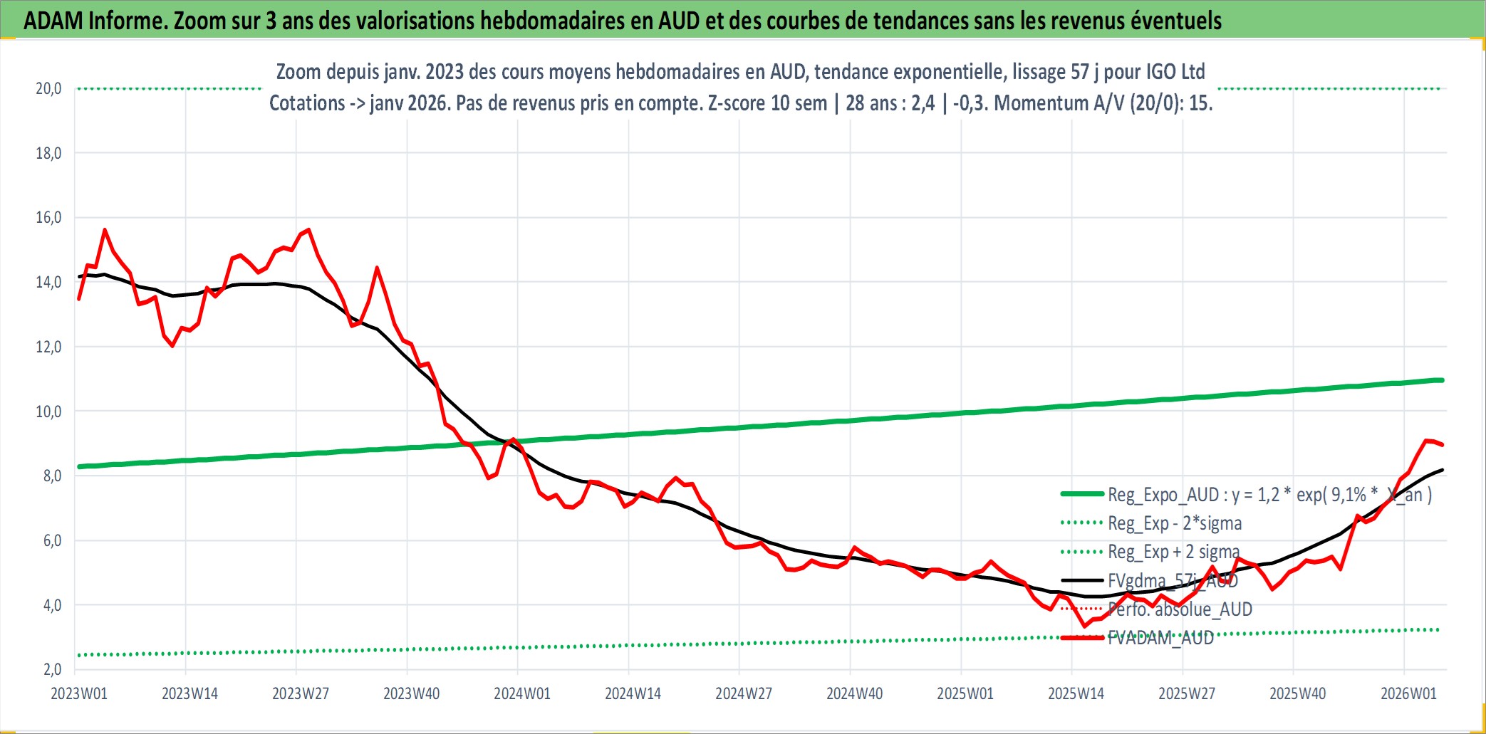 Site dédié aux investisseursPage dédiée sur site financeAnalyse des valorisations hebdomadaires de l'action IGO Ltd . Cet actif est cote en AUD. Les valorisations sont en contrevaleur EURO et couvrent les semaines 2002W01 a 2026W05. Les revenus de cet actif financier sont pris en compte depuis la semaine 2004W50. La note ESG de cet actif n'est pas connue.