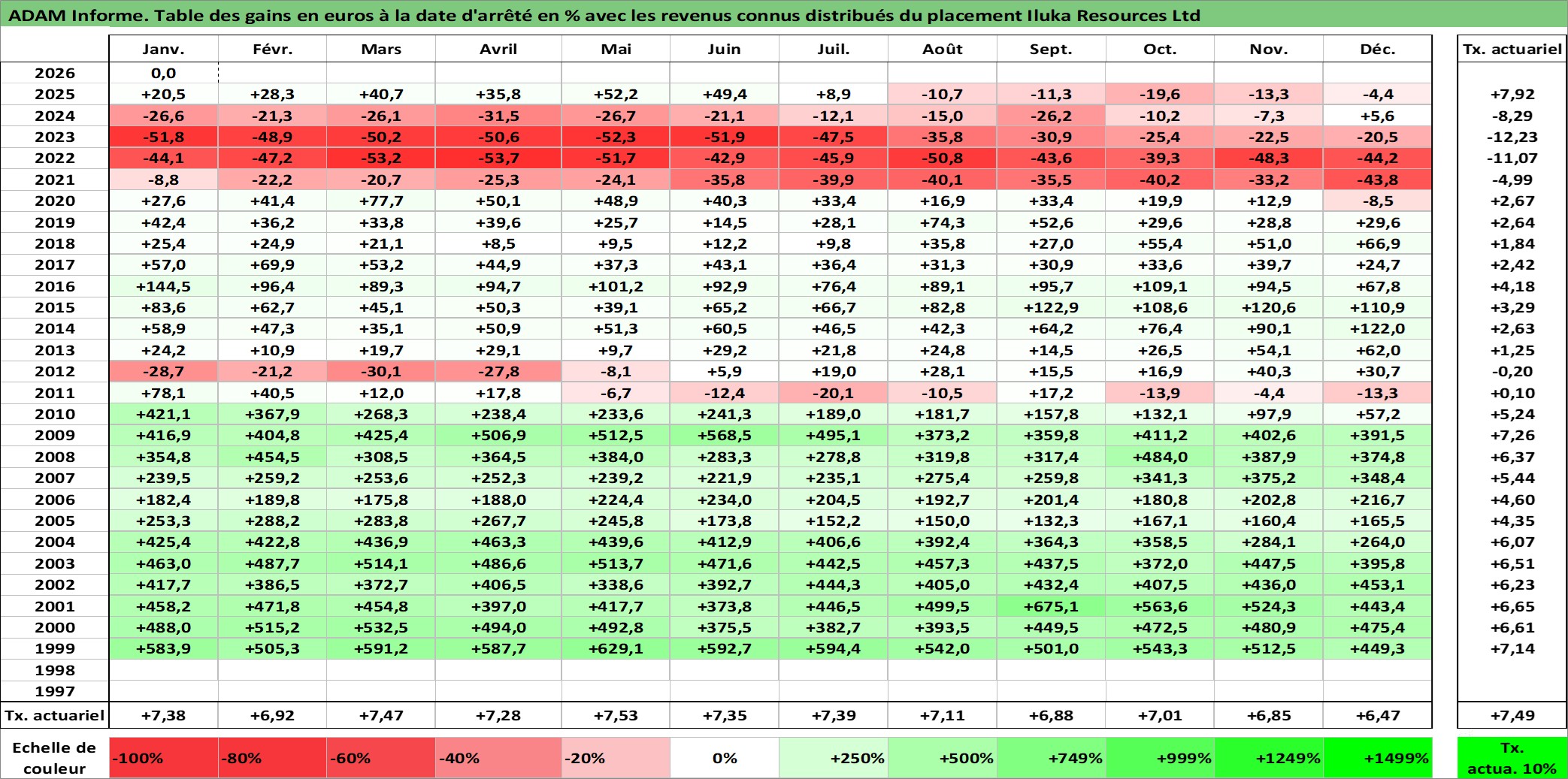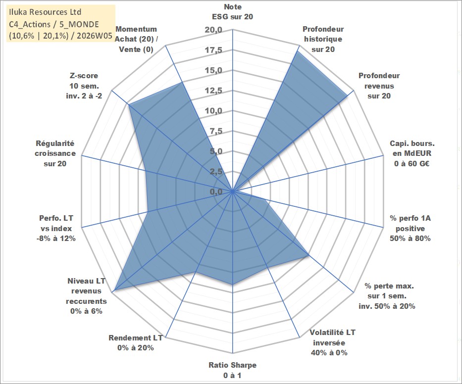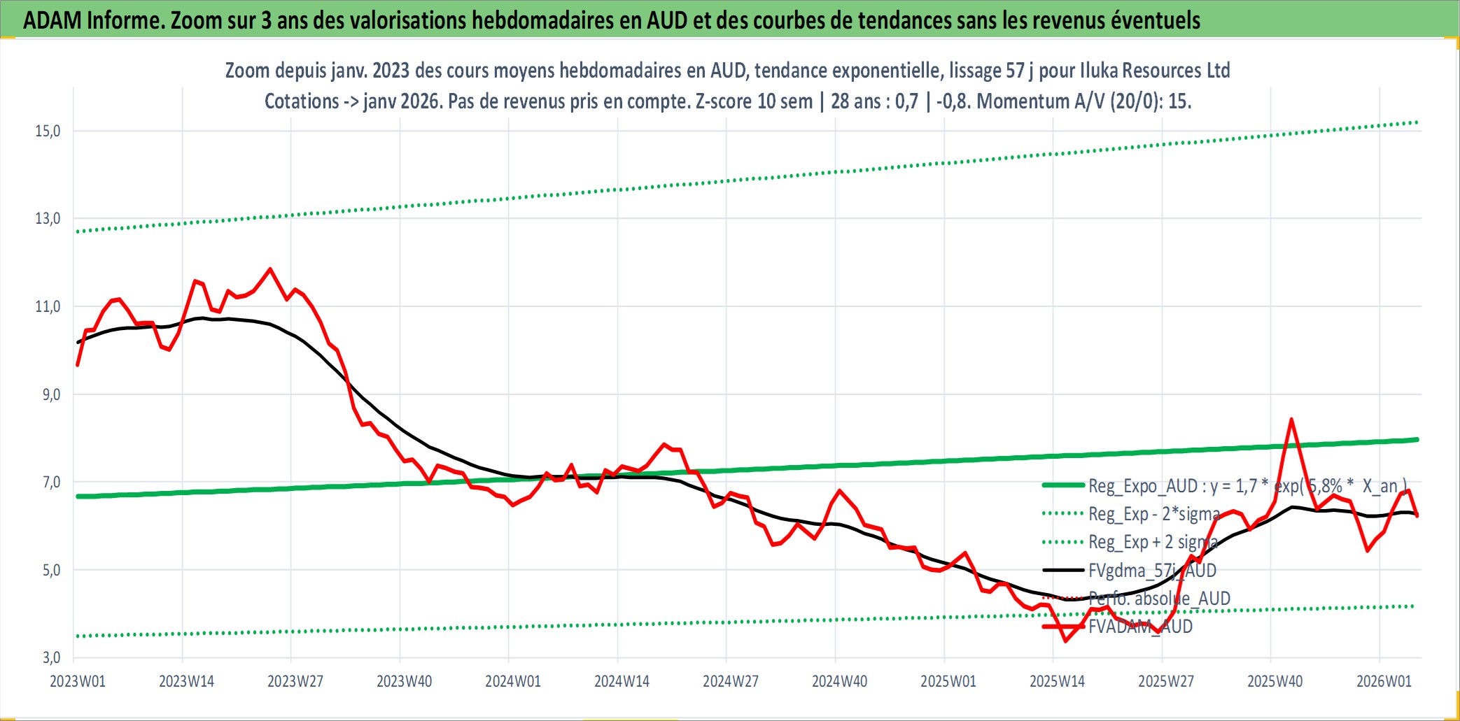 Site dédié aux investisseursPage dédiée sur site financeAnalyse des valorisations hebdomadaires de l'action Iluka Resources Ltd. Cet actif est cote en AUD. Les valorisations sont en contrevaleur EURO et couvrent les semaines 1999W01 a 2026W05. Les revenus de cet actif financier sont pris en compte depuis la semaine 1999W17. La note ESG de cet actif n'est pas connue.