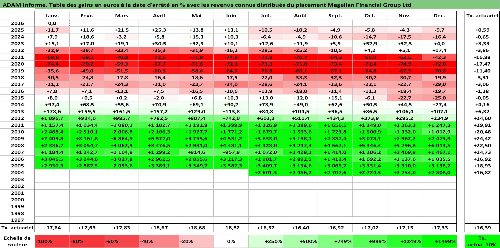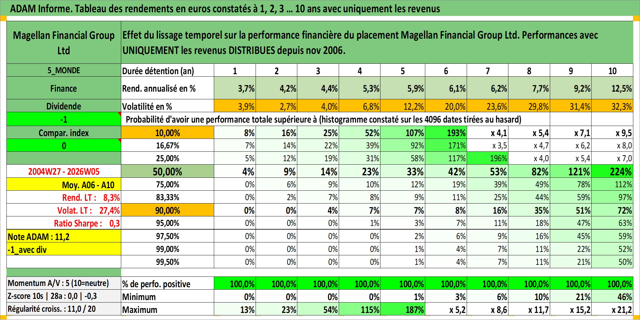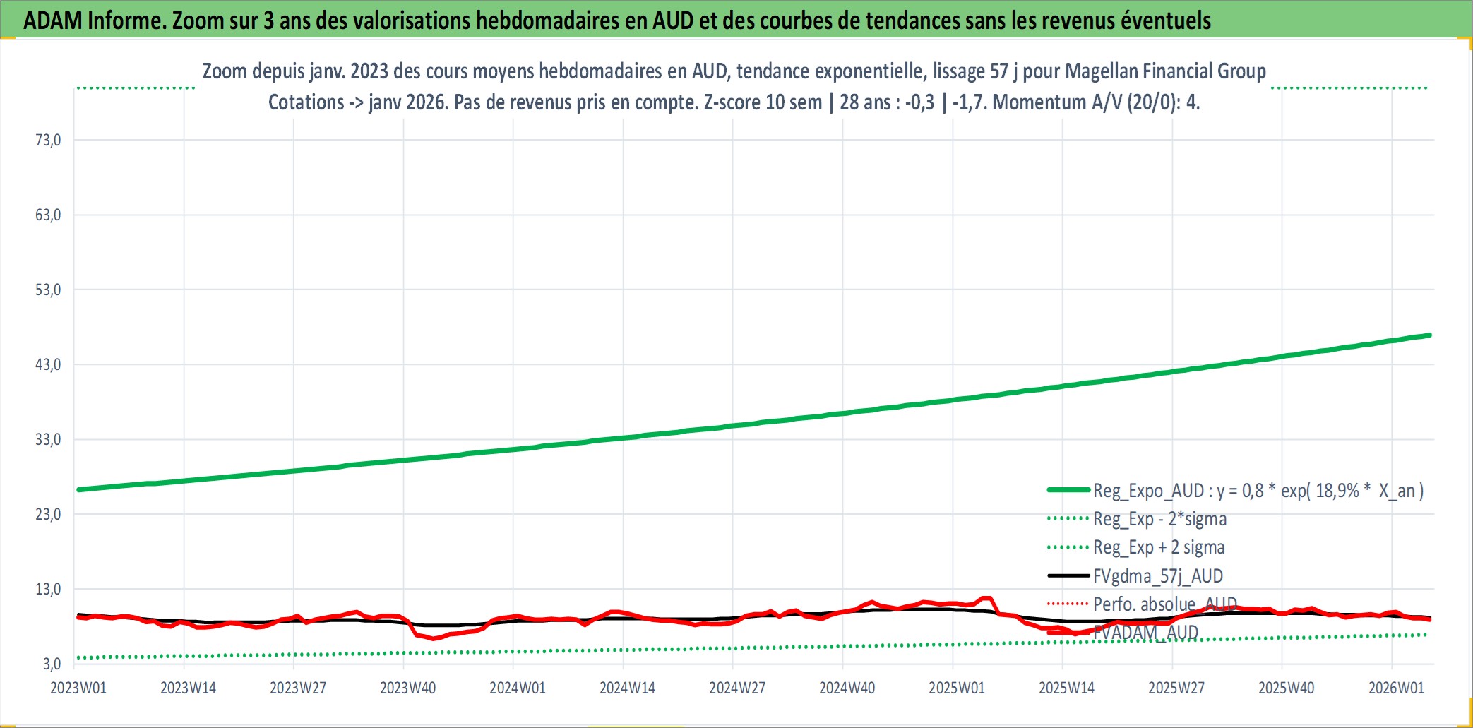 Site dédié aux investisseursPage dédiée sur site financeAnalyse des valorisations hebdomadaires de l'action Magellan Financial Group Ltd. Cet actif est cote en AUD. Les valorisations sont en contrevaleur EURO et couvrent les semaines 2004W27 a 2026W05. Les revenus de cet actif financier sont pris en compte depuis la semaine 2006W46. La note ESG de cet actif n'est pas connue.