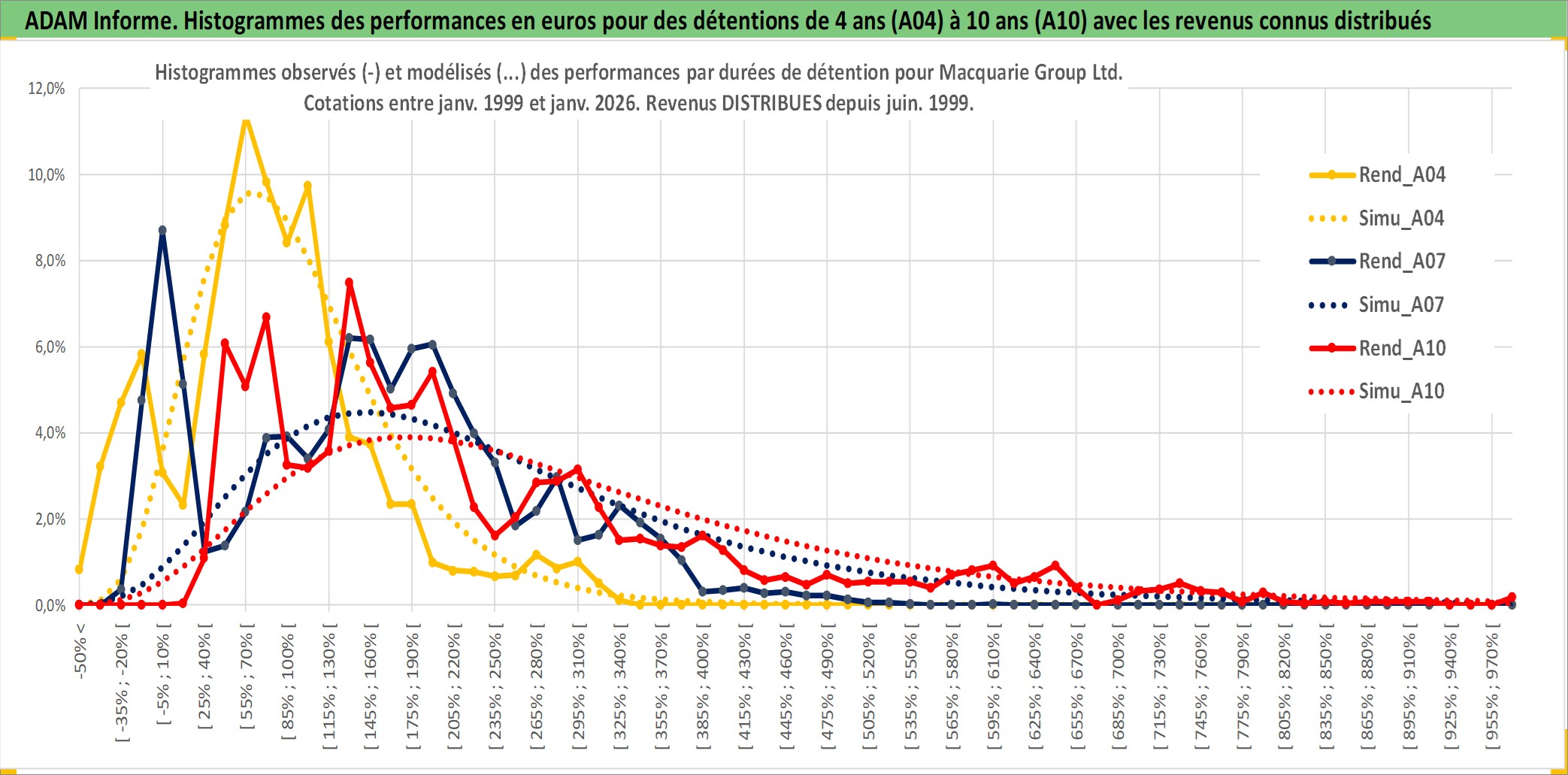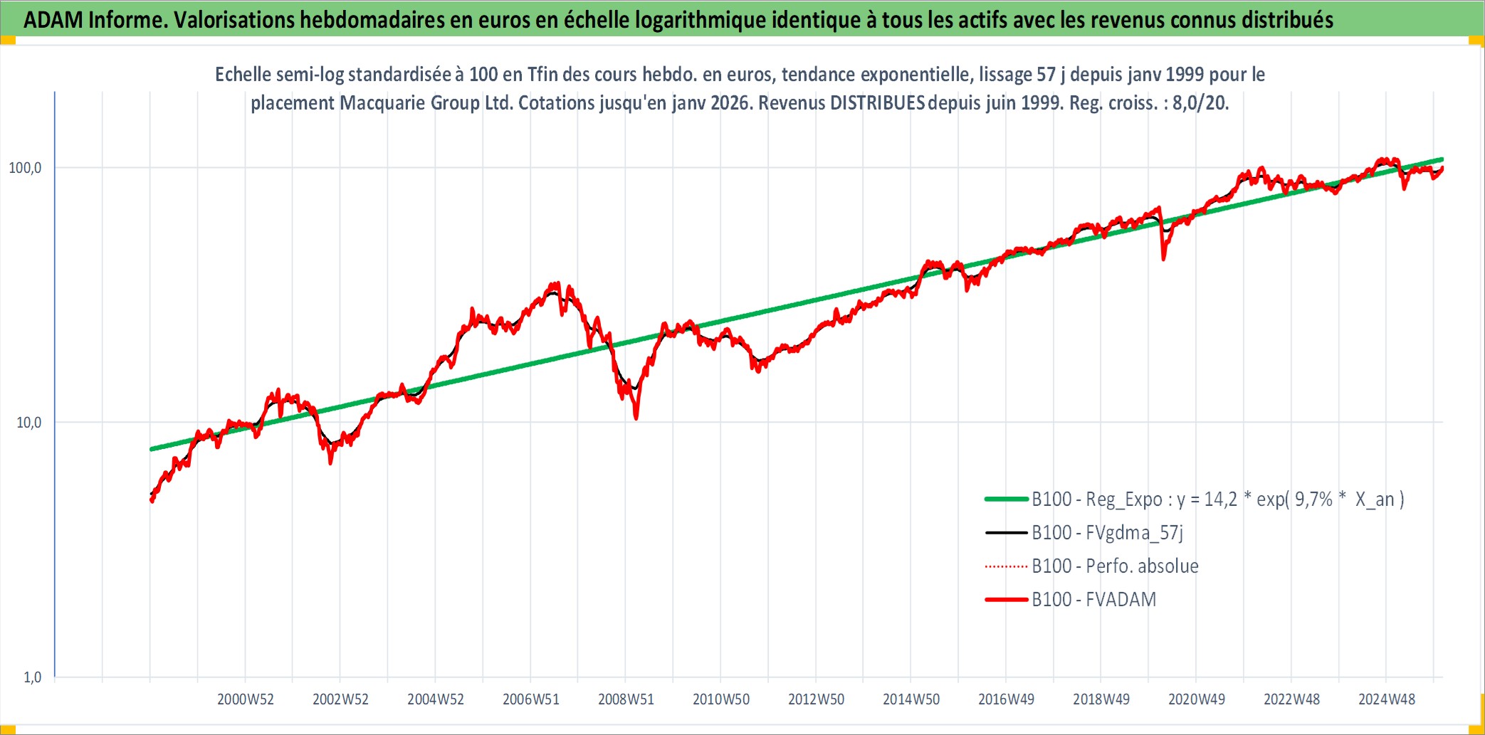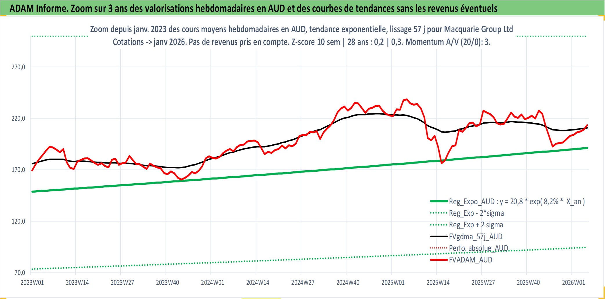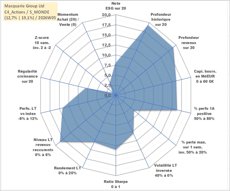 Site dédié aux investisseursPage dédiée sur site financeAnalyse des valorisations hebdomadaires de l'action Macquarie Group Ltd. Cet actif est cote en AUD. Les valorisations sont en contrevaleur EURO et couvrent les semaines 1999W01 a 2026W05. Les revenus de cet actif financier sont pris en compte depuis la semaine 1999W23. La note globale ESG de cet actif est estimee a 8.0 (apres rebasage entre 0 et 20).