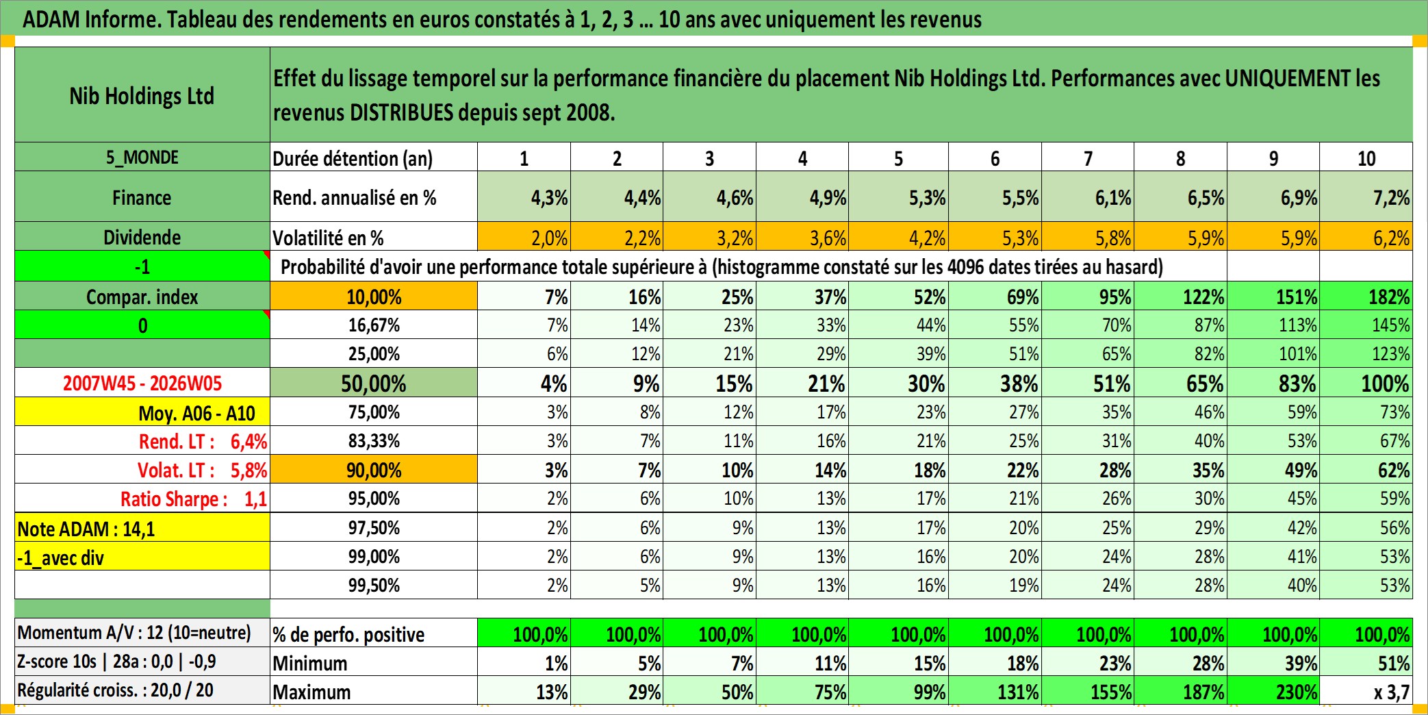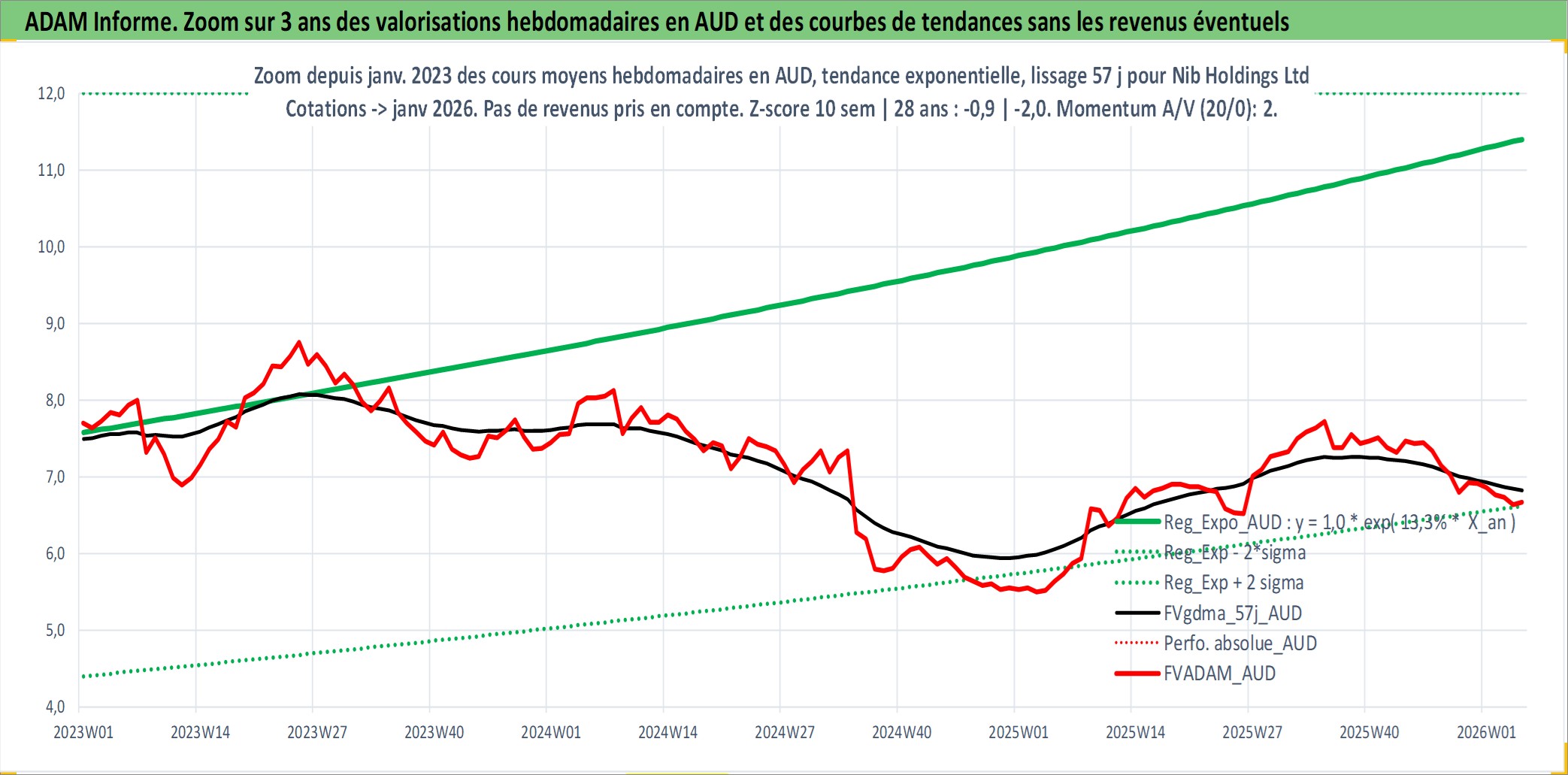 Site dédié aux investisseursPage dédiée sur site financeAnalyse des valorisations hebdomadaires de l'action Nib Holdings Ltd. Cet actif est cote en AUD. Les valorisations sont en contrevaleur EURO et couvrent les semaines 2007W45 a 2026W05. Les revenus de cet actif financier sont pris en compte depuis la semaine 2008W38. La note ESG de cet actif n'est pas connue.