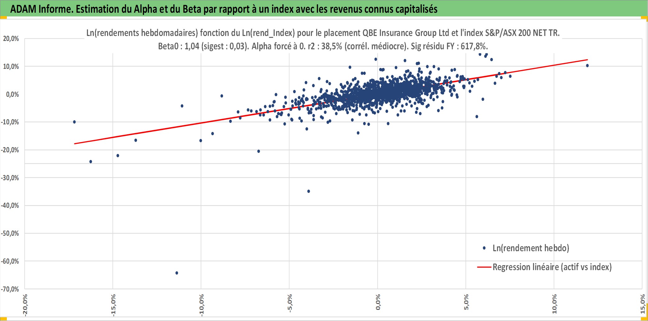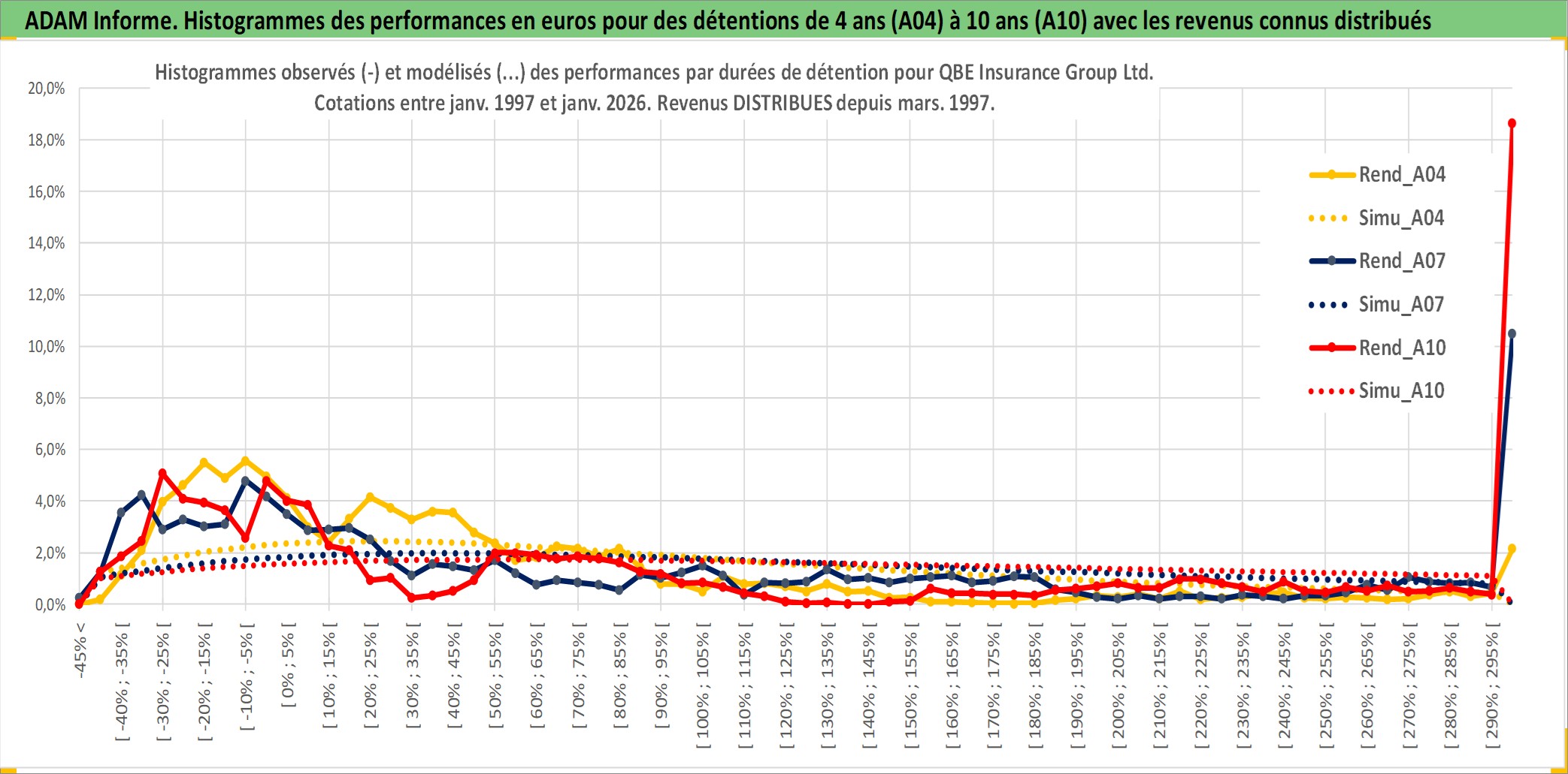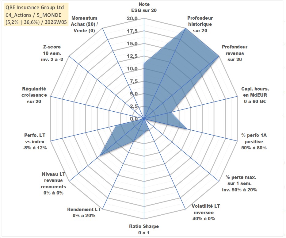 Site dédié aux investisseursPage dédiée sur site financeAnalyse des valorisations hebdomadaires de l'action QBE Insurance Group Ltd. Cet actif est cote en AUD. Les valorisations sont en contrevaleur EURO et couvrent les semaines 1997W01 a 2026W05. Les revenus de cet actif financier sont pris en compte depuis la semaine 1997W09. La note globale ESG de cet actif est estimee a 11.0 (apres rebasage entre 0 et 20).